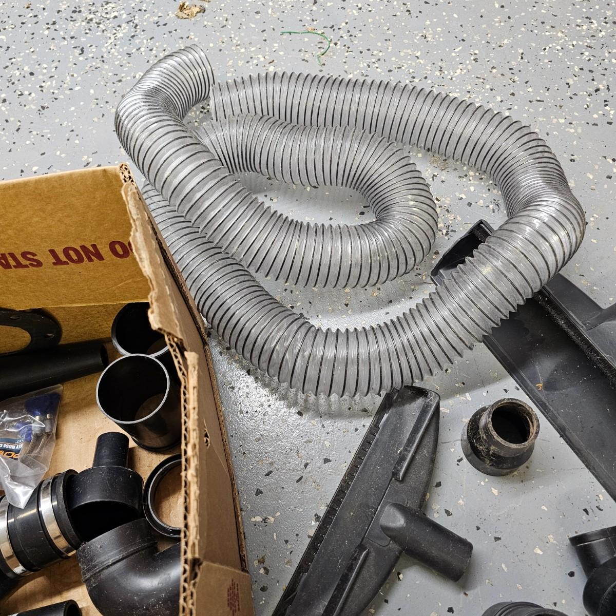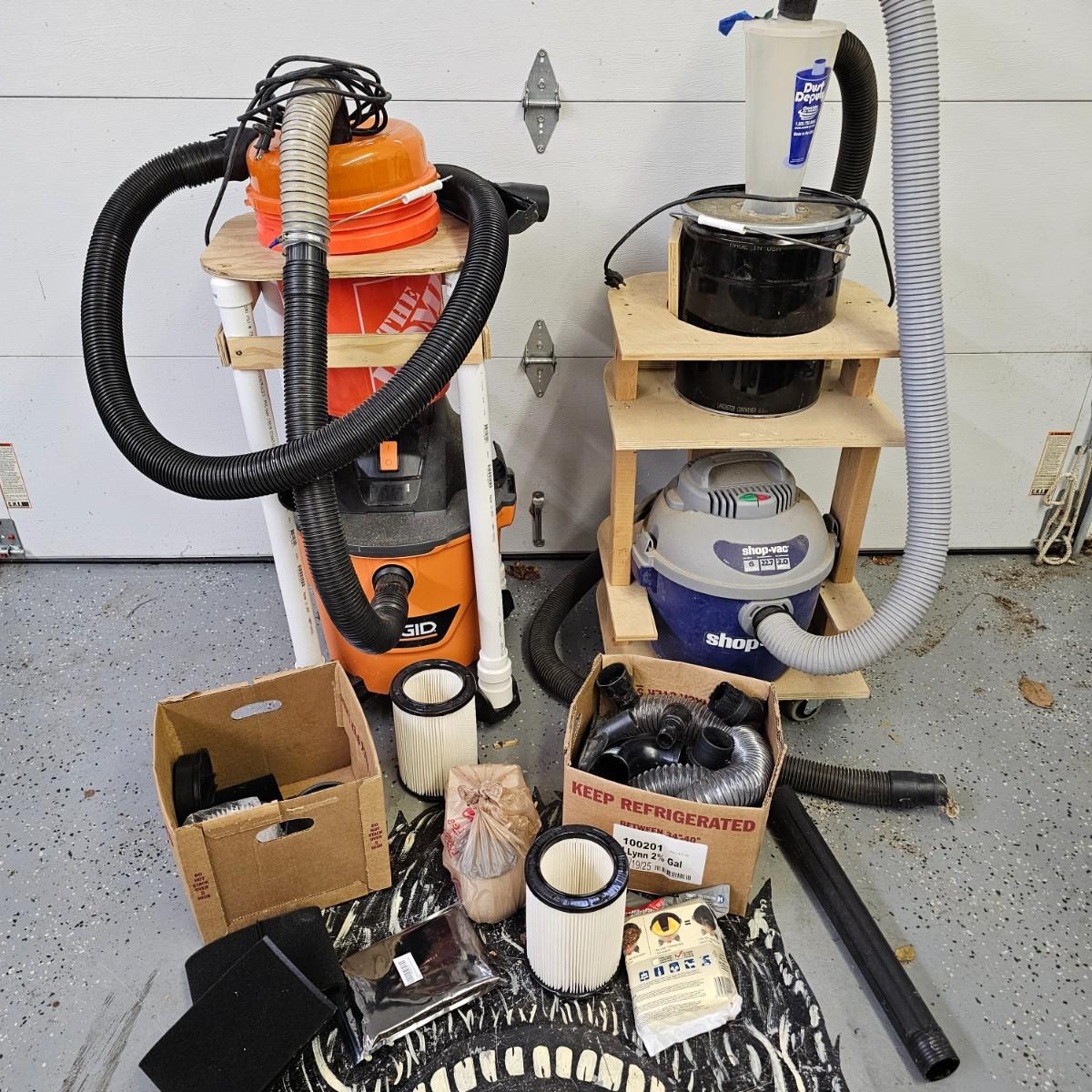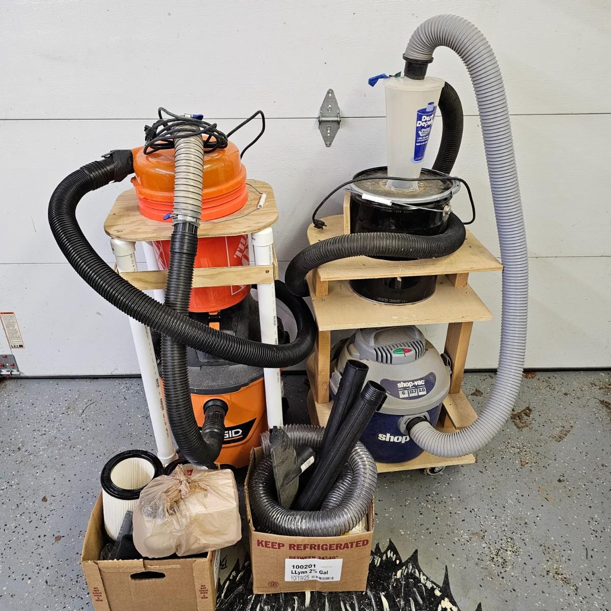 Powered by standard shop vacuums, these two dust collectors for shop use are unique. A Ridgid and a Shop-Vac unit are paired with additional buckets and hoses to apparently create extra power for dust collection. Both units operate on standard 120V power and powered on when plugged in. Units are, Ridgid measures 17" x 20" x 48"H and the Shop-Vac is 21" x 22" x 56"H. Comes with extra filters, hoses, connectors, reducers and more. See photos for details. Local pickup only.