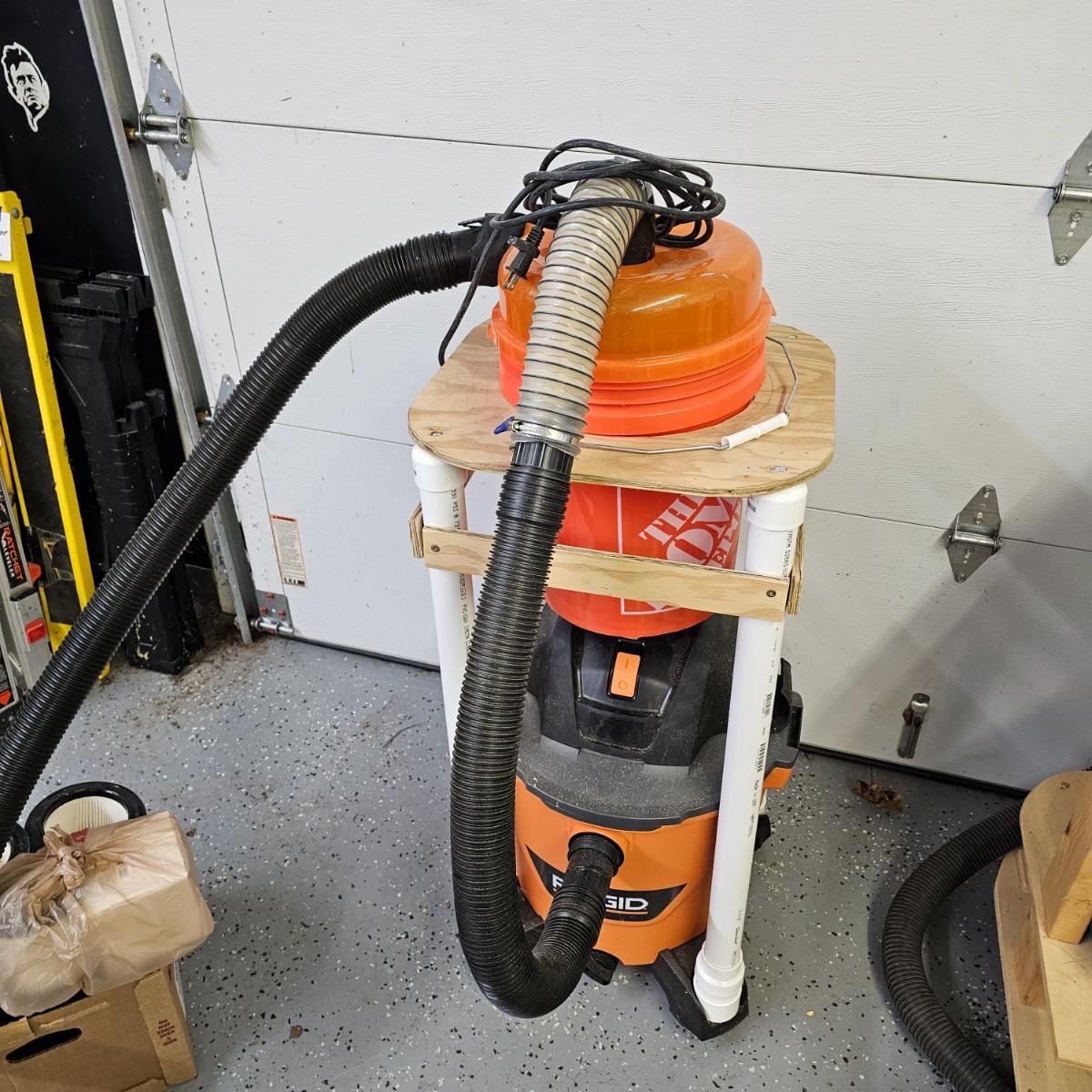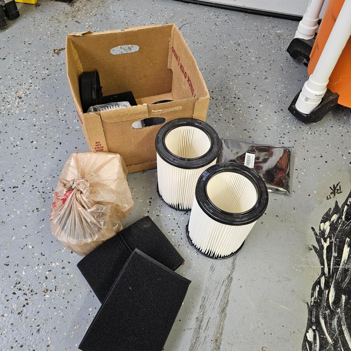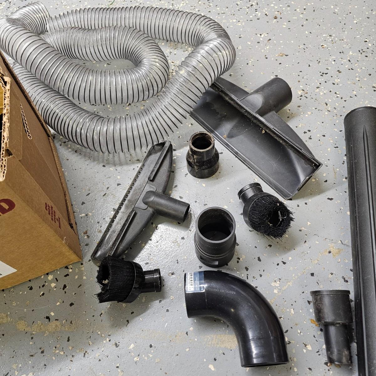 Powered by standard shop vacuums, these two dust collectors for shop use are unique. A Ridgid and a Shop-Vac unit are paired with additional buckets and hoses to apparently create extra power for dust collection. Both units operate on standard 120V power and powered on when plugged in. Units are, Ridgid measures 17" x 20" x 48"H and the Shop-Vac is 21" x 22" x 56"H. Comes with extra filters, hoses, connectors, reducers and more. See photos for details. Local pickup only.