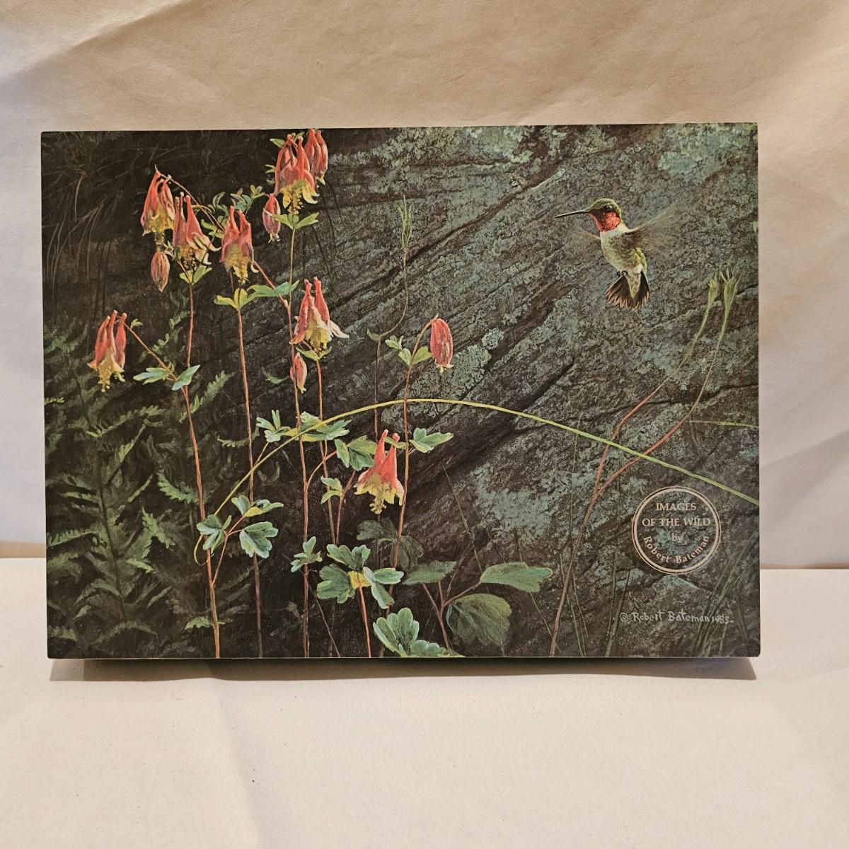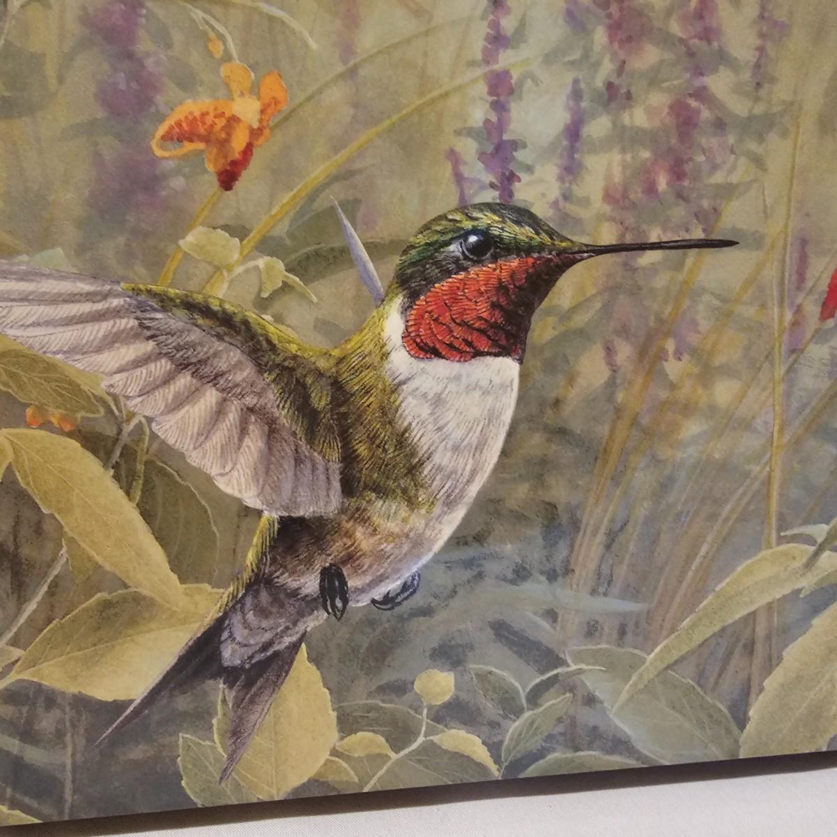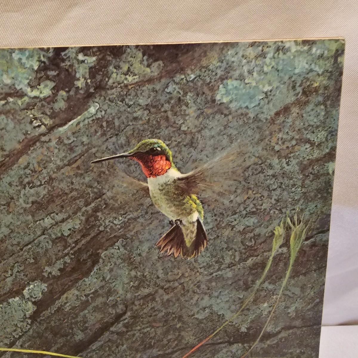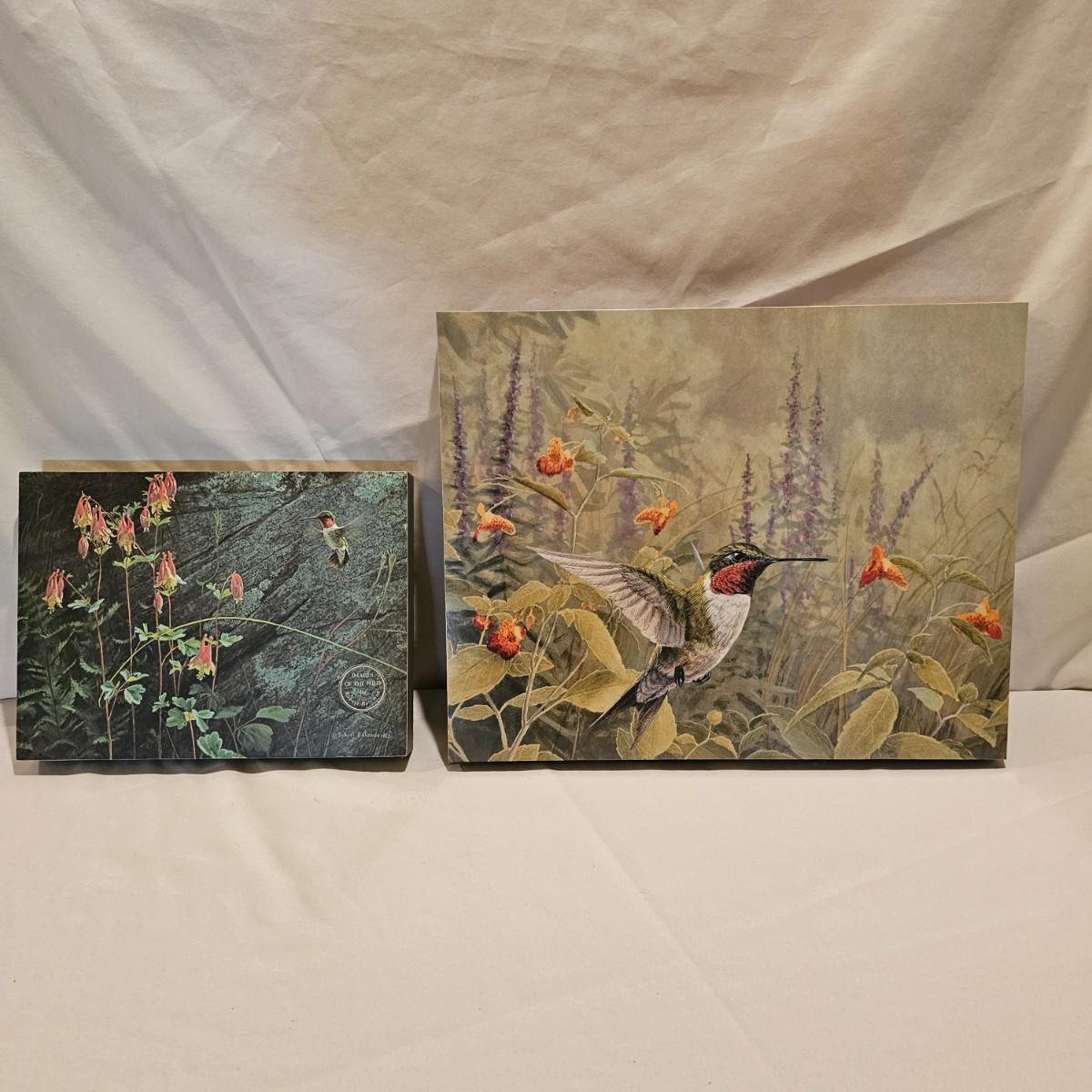 A pair of prints over wooden frames showing hummingbirds in the wild. Larger image is 20" x 1.5" x 16"H, and the smaller is 14" x 1.5" x 10.5"H. Smaller image is part of a series by Robert Bateman. See photos for details. Shipping available. Shipping [art] can be costly. We suggest contacting our preferred local shipping provider, Postage Express, with dimensions and getting an estimate before bidding: (828) 670-5501 or postageexpress@yahoo.com.