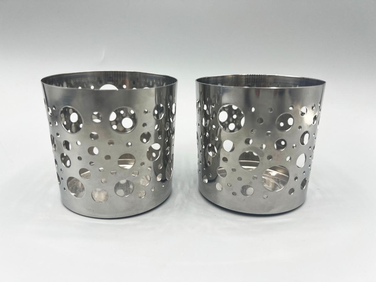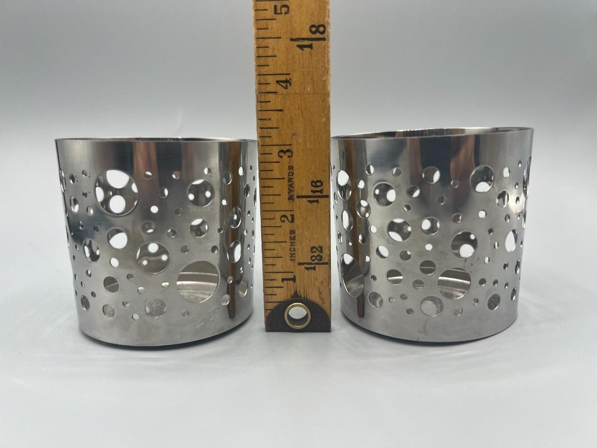 Pair of Ikea Tin Metal Modern Home Candle Holders, there is no significant damage to the candle holders and is in good useable condition. Check pictures for more details and for sizing.