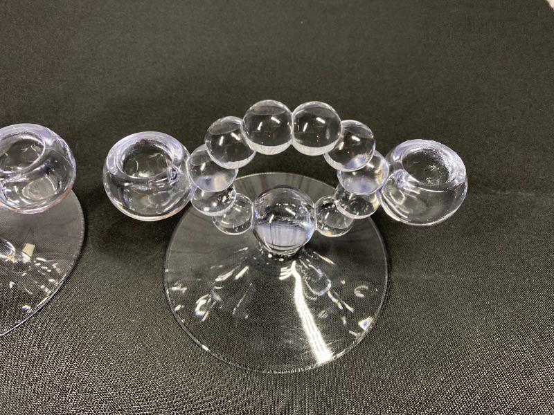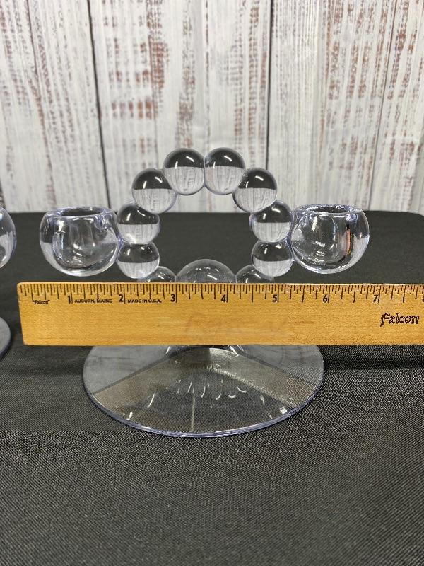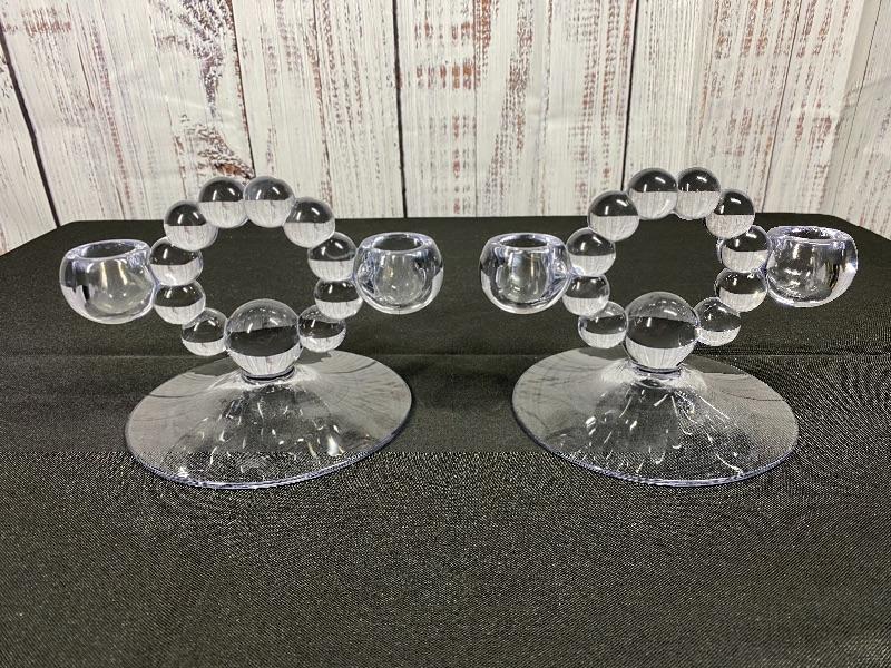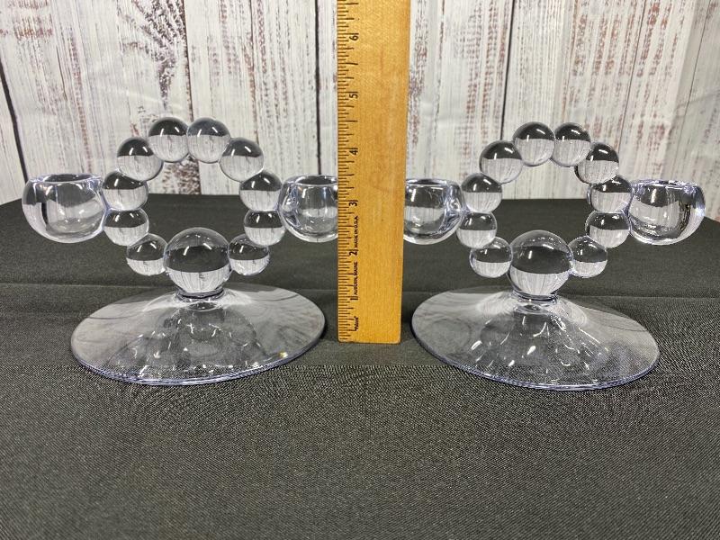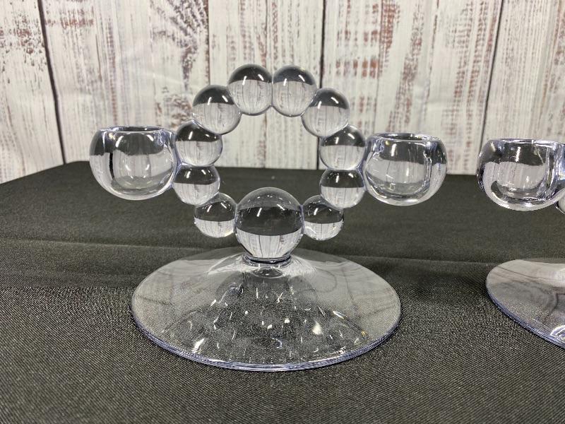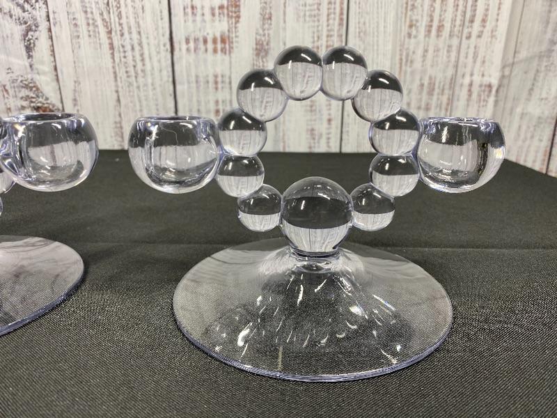 Vintage Imperial glass Co candelabras. Double taper candle holders in "Candlewick" pattern. Good condition. Measure about 7" across and under 5" tall.