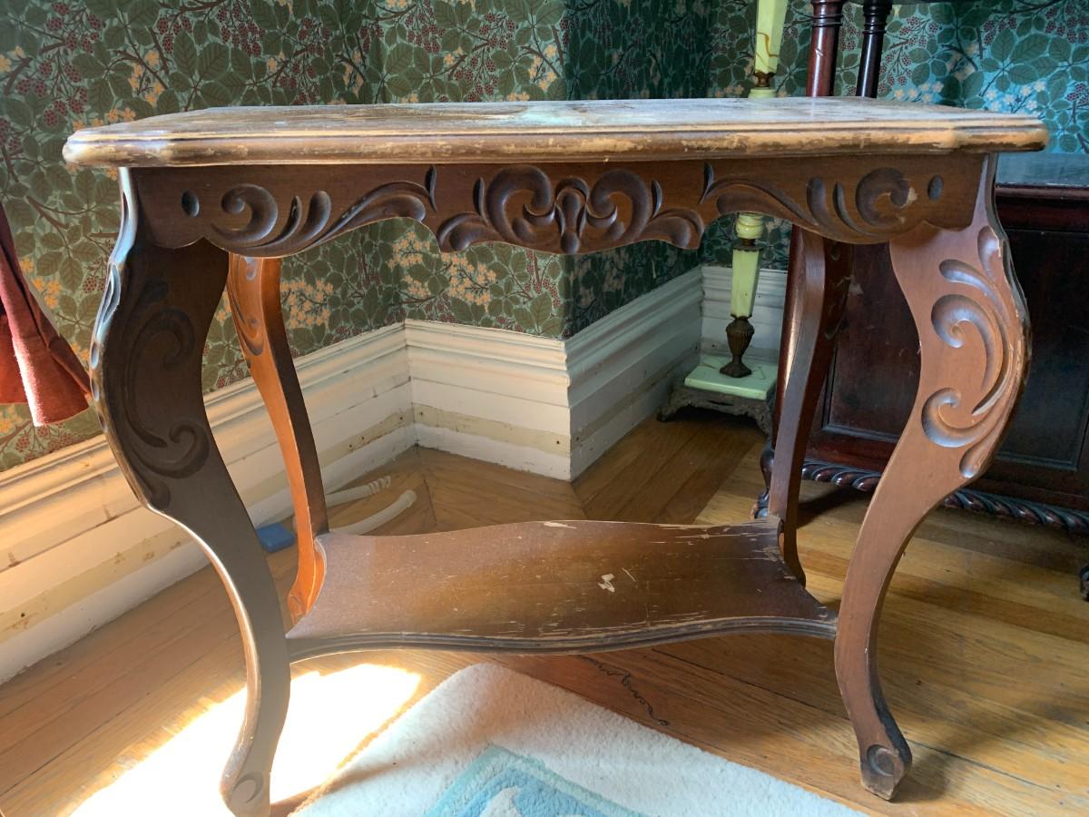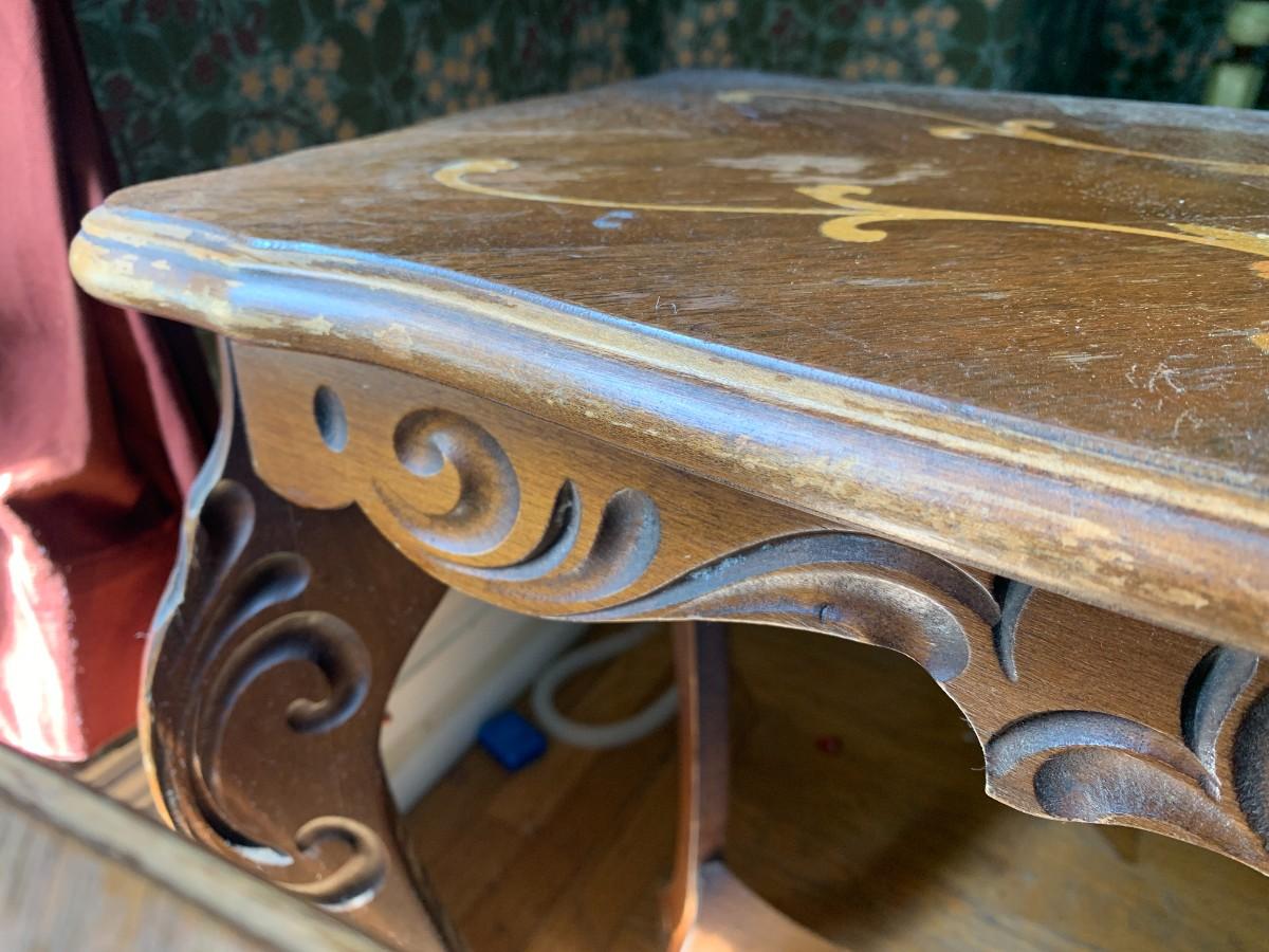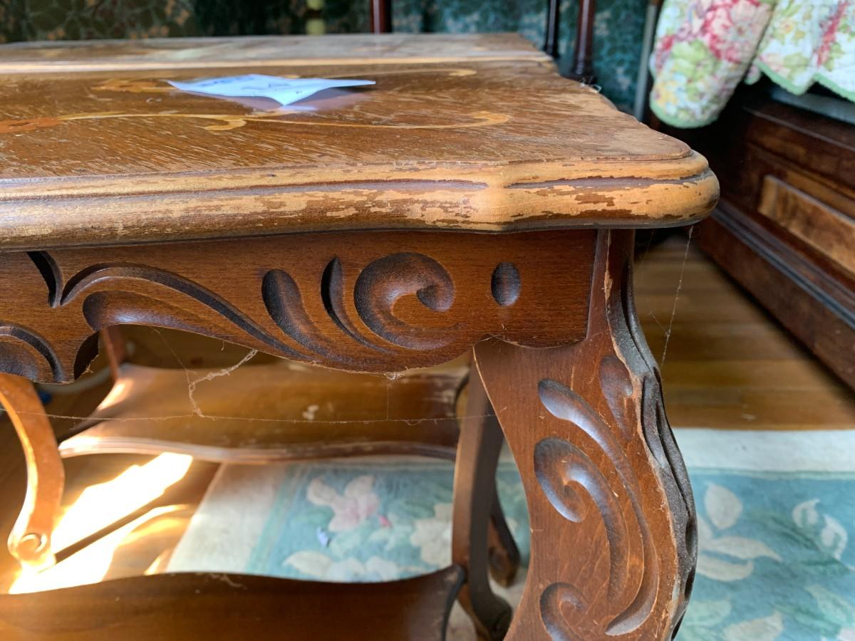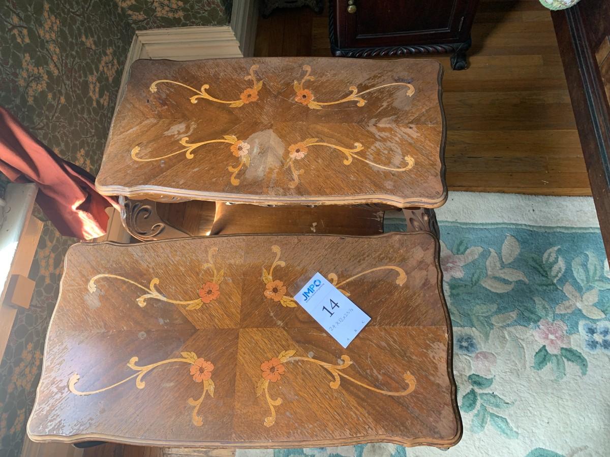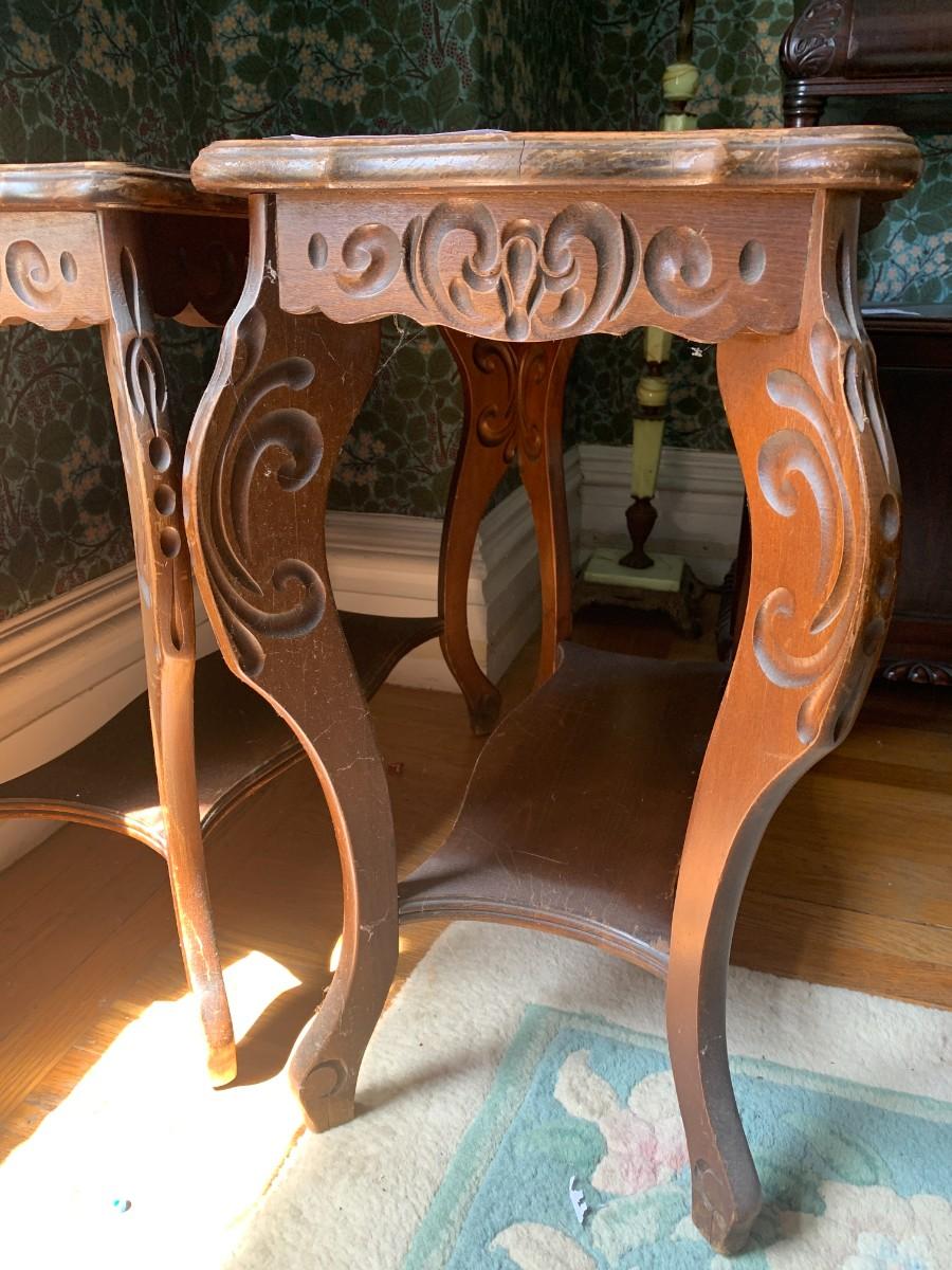 Pair of Side Tables with scalloped, beveled edges around the inlaid top, apron, and legs with carved design and bottom shelf.