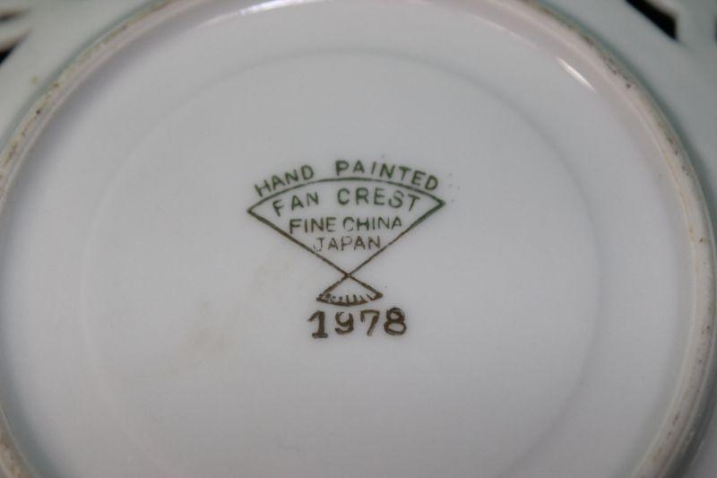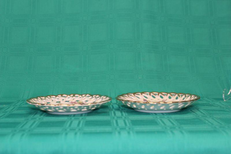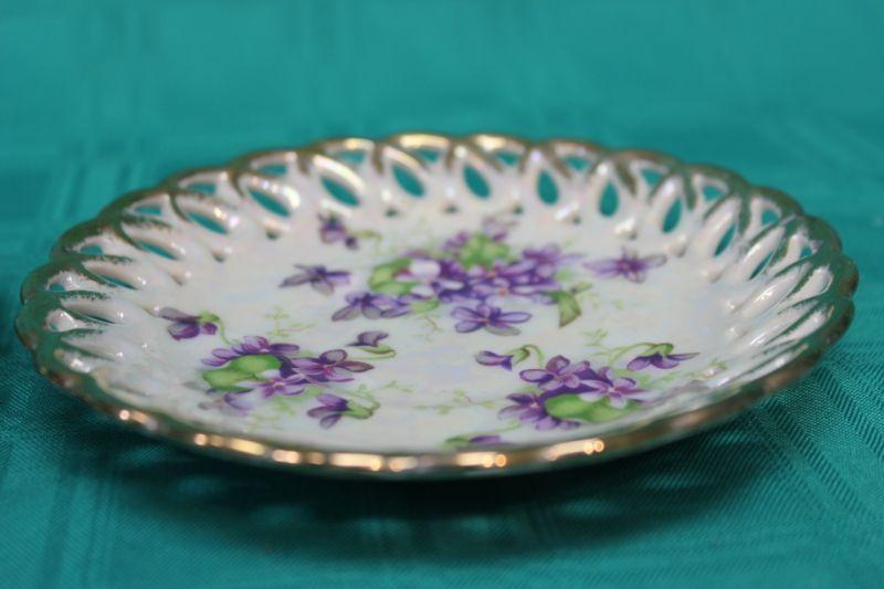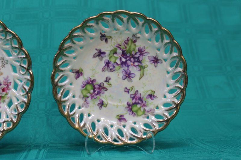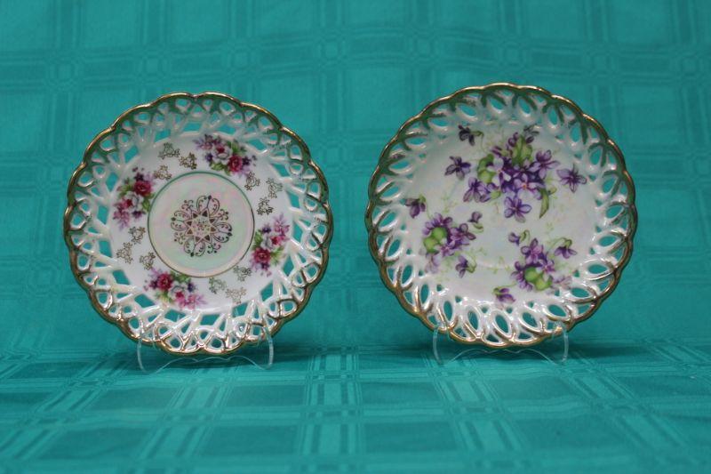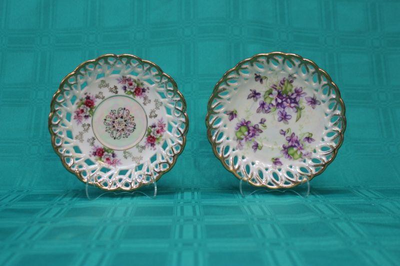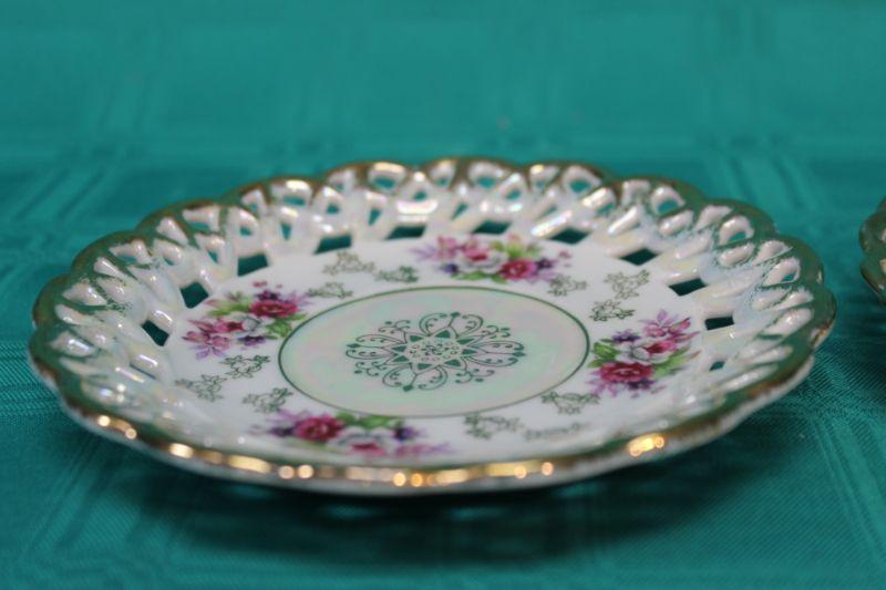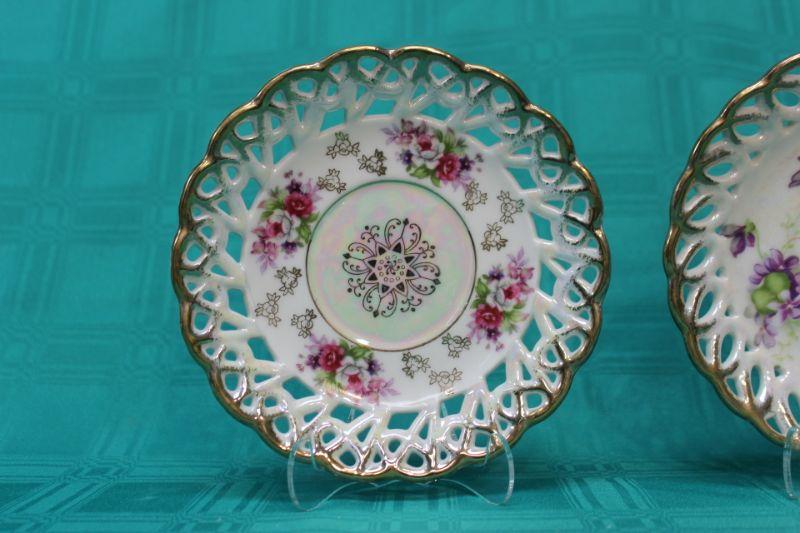 Pair of iridescent lace/lattice edge saucer size plates. Gold trim. Pink floral and purple floral patterns. Both have iridescent glaze. The pink floral is from Fan Crest Fine China. The purple is Sealy Royal China. Both made in Japan. No Chips.