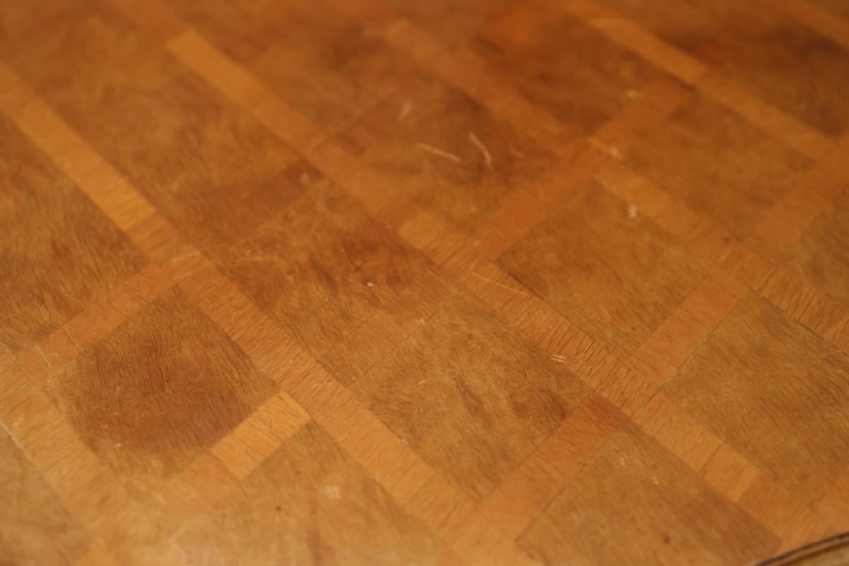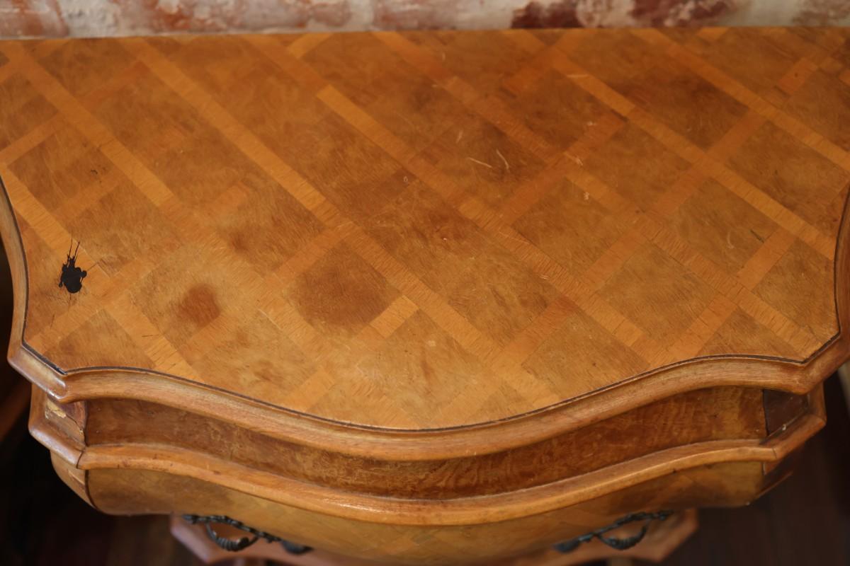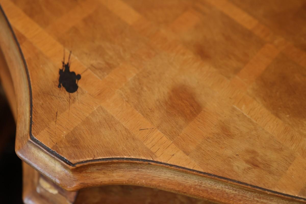 Veneer damage on the strip next to the drawers, see pictures for reference. Also see any wear and black mark on the top of tables, pictured.