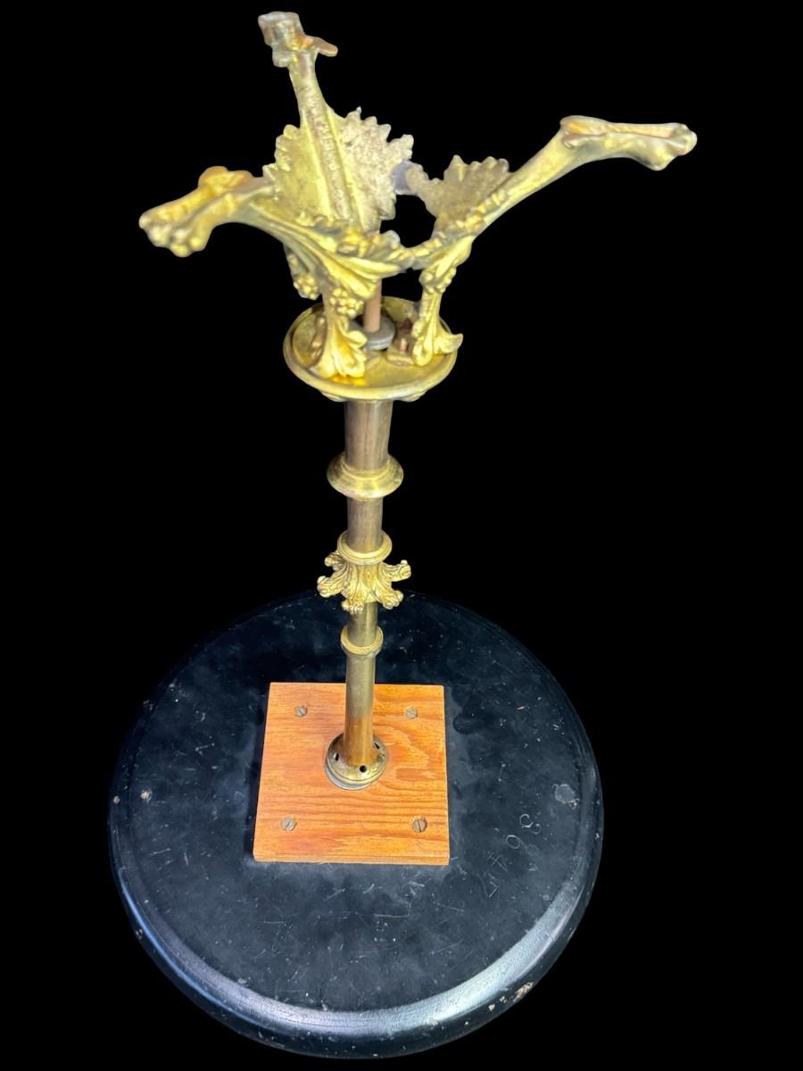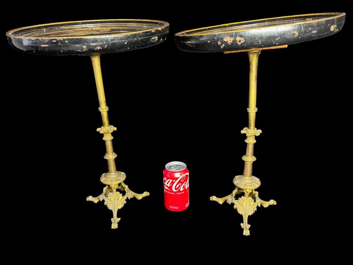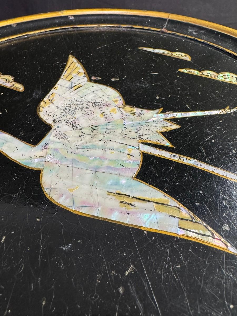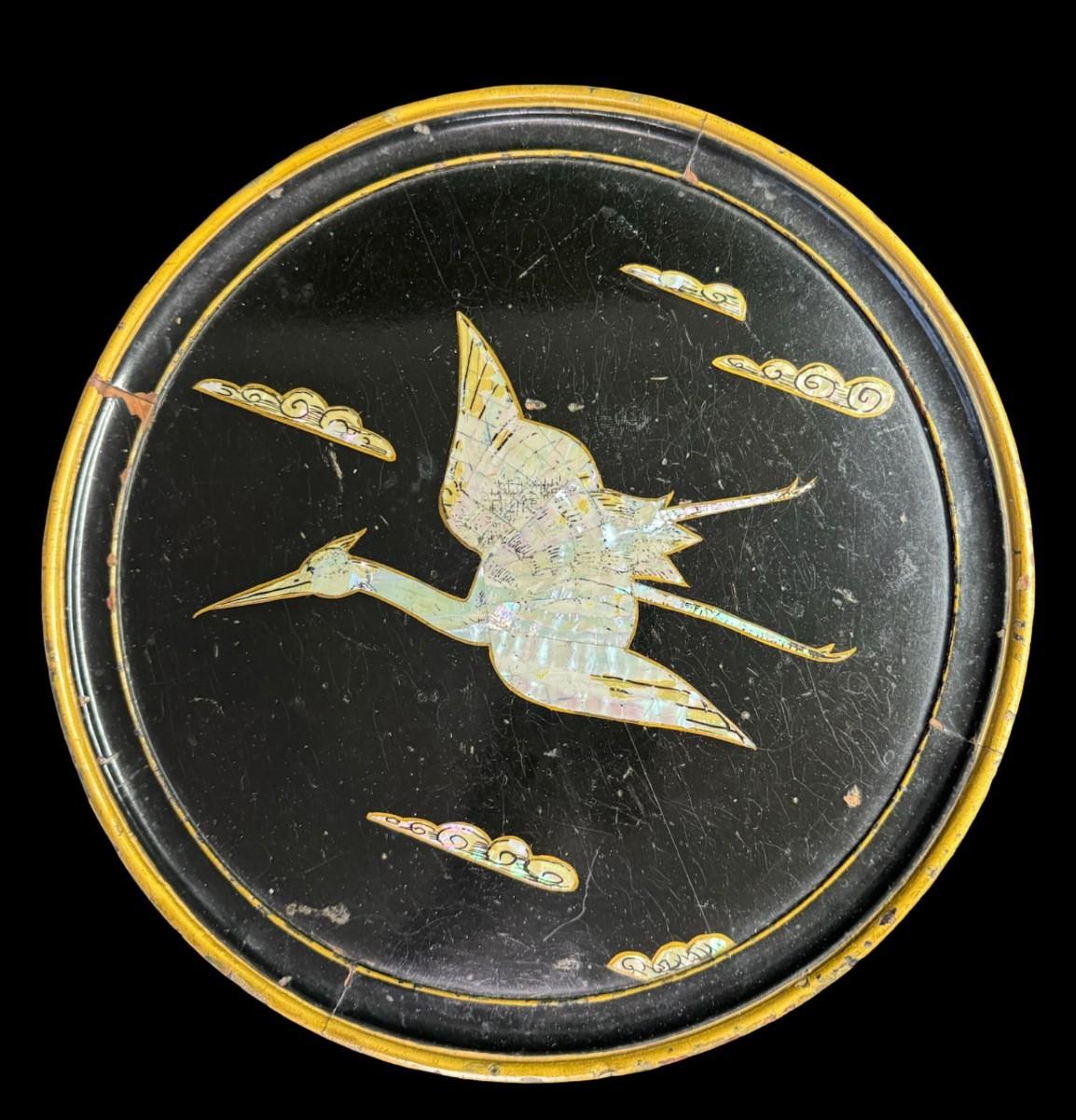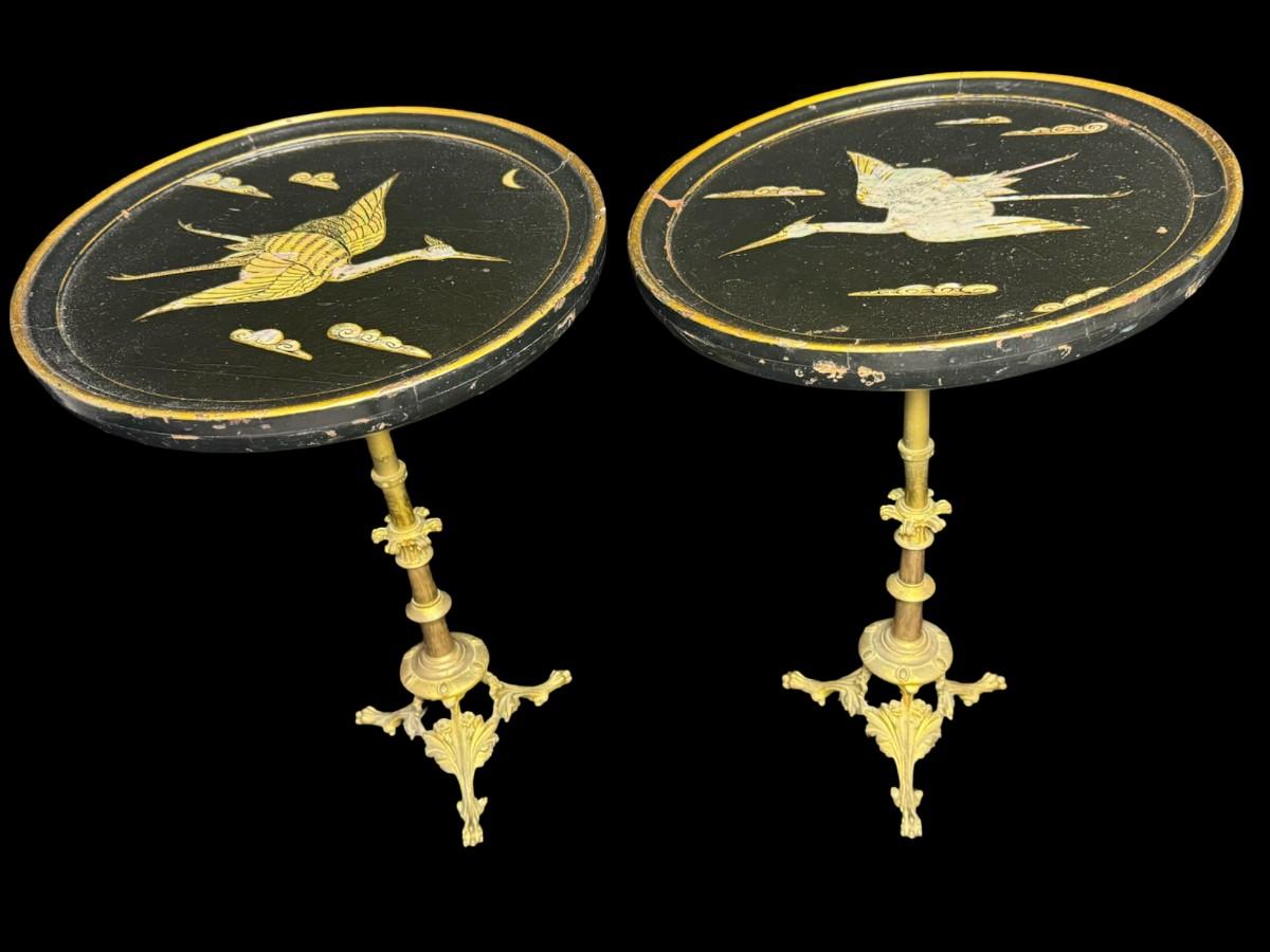 These lacquered tables have mother of pearl flying cranes and clouds. The pedestals are constructed of brass and lacquered wood. There is some paint loss on the edges, and one base is not straight, and may have been bent at one time. Measurement: 16.5”H x 12.5”W (each). [JP]