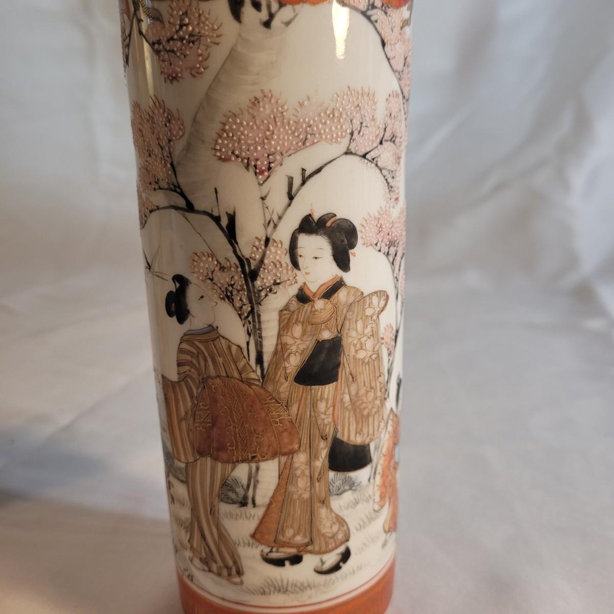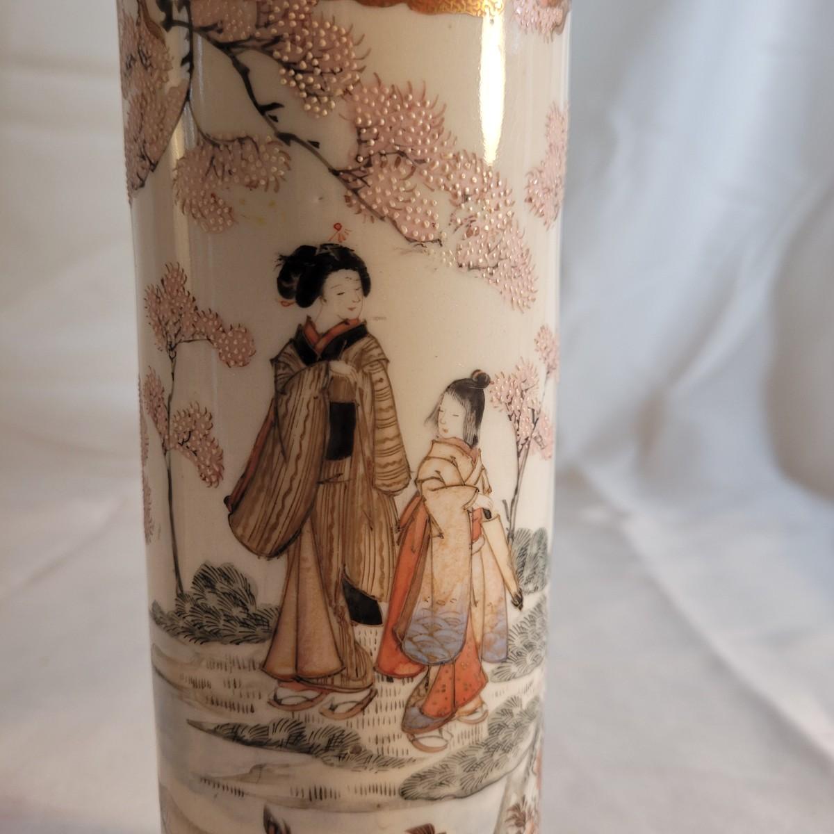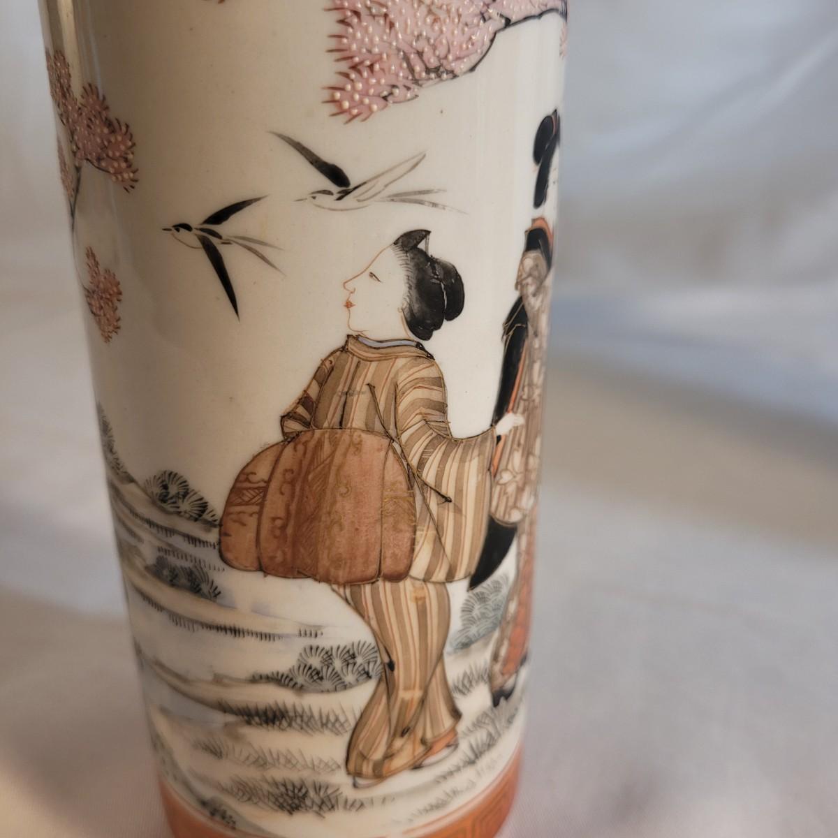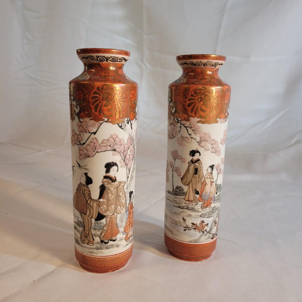 A pair of beautifully painted Japanese ceramic vases in the style of Kutani. Textured tree blossoms and scenes of geishas with young girls creates a sense of whimsy and lightness. Small cracked piece at opening appears to have been glued back. Measures approximately 2"DIA at opening x10"H. Shipping available.