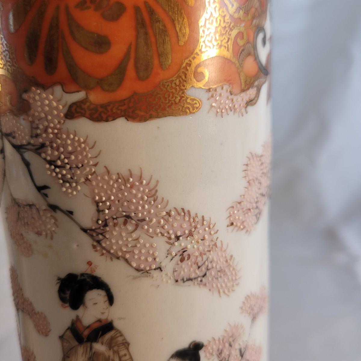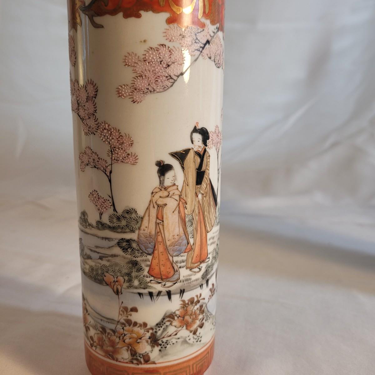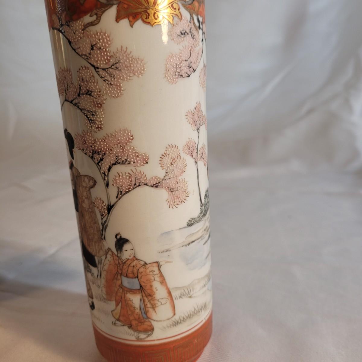 A pair of beautifully painted Japanese ceramic vases in the style of Kutani. Textured tree blossoms and scenes of geishas with young girls creates a sense of whimsy and lightness. Small cracked piece at opening appears to have been glued back. Measures approximately 2"DIA at opening x10"H. Shipping available.