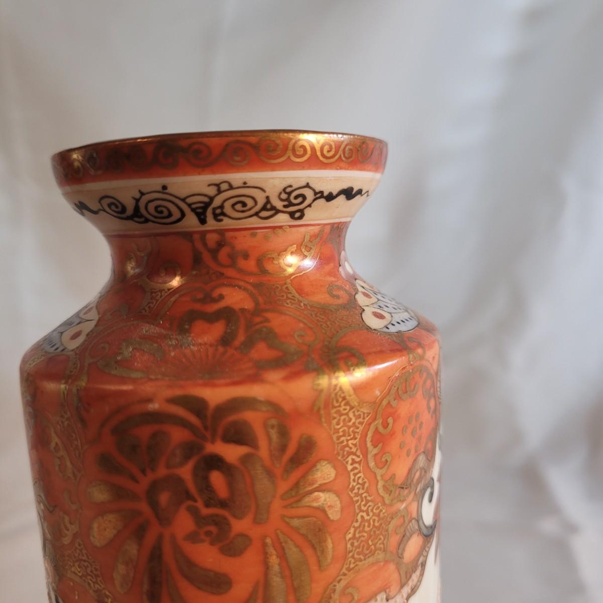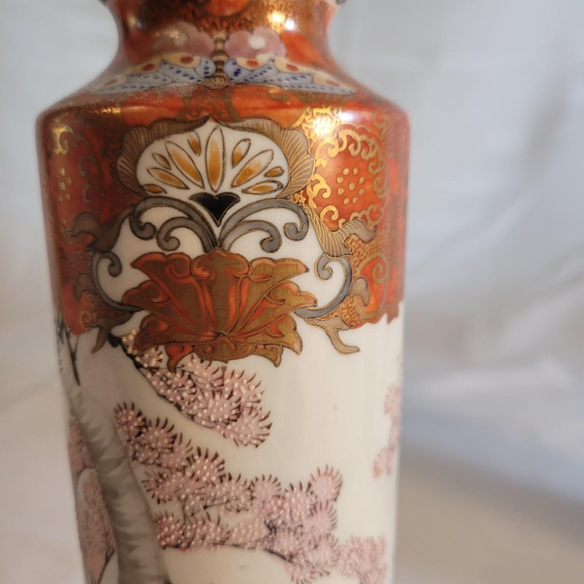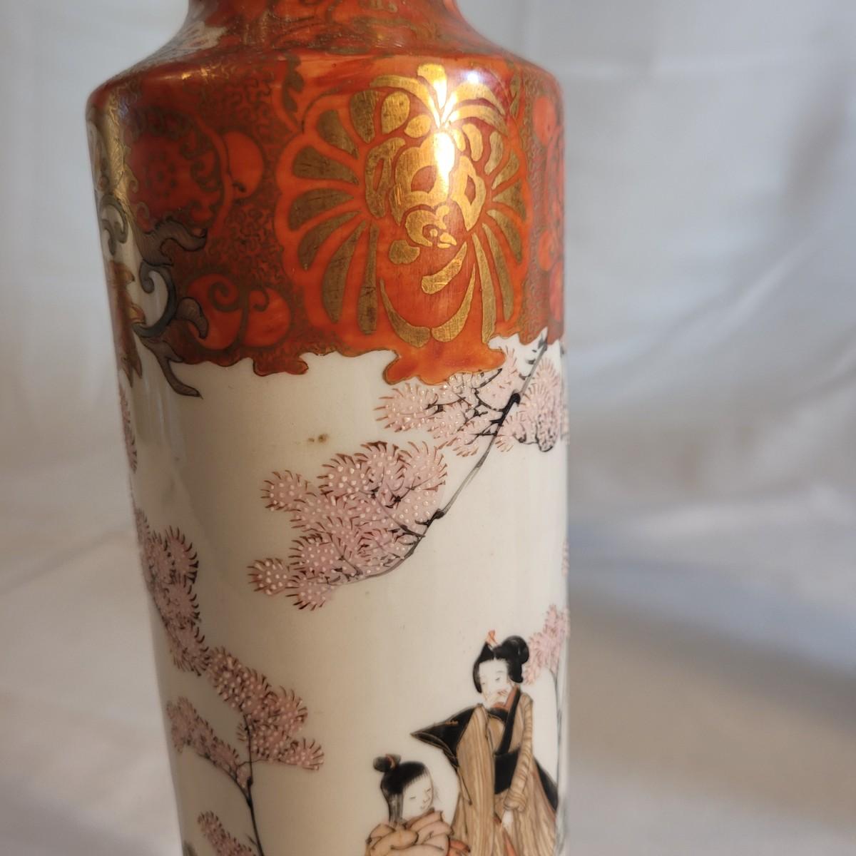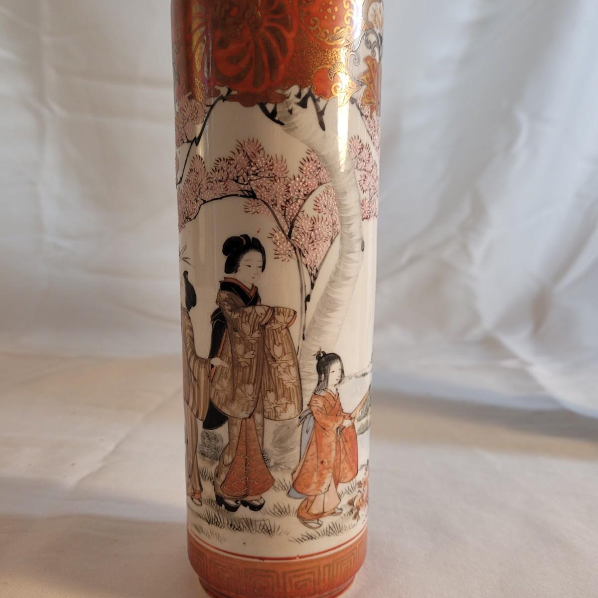A pair of beautifully painted Japanese ceramic vases in the style of Kutani. Textured tree blossoms and scenes of geishas with young girls creates a sense of whimsy and lightness. Small cracked piece at opening appears to have been glued back. Measures approximately 2"DIA at opening x10"H. Shipping available.