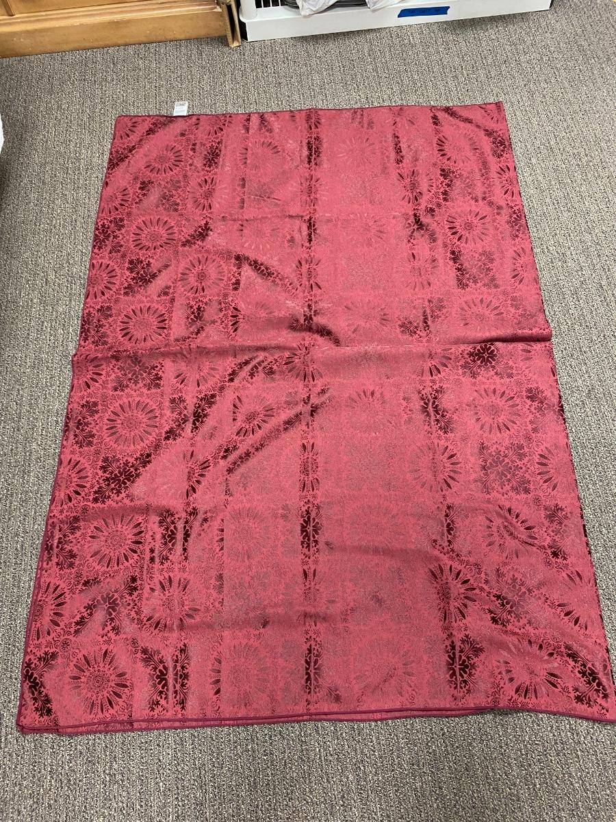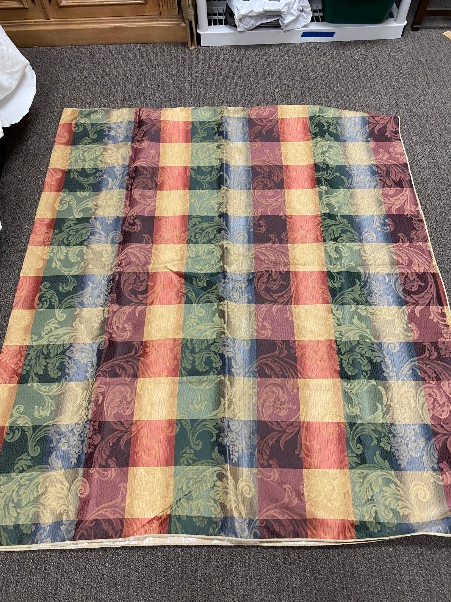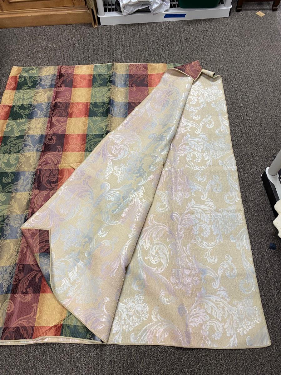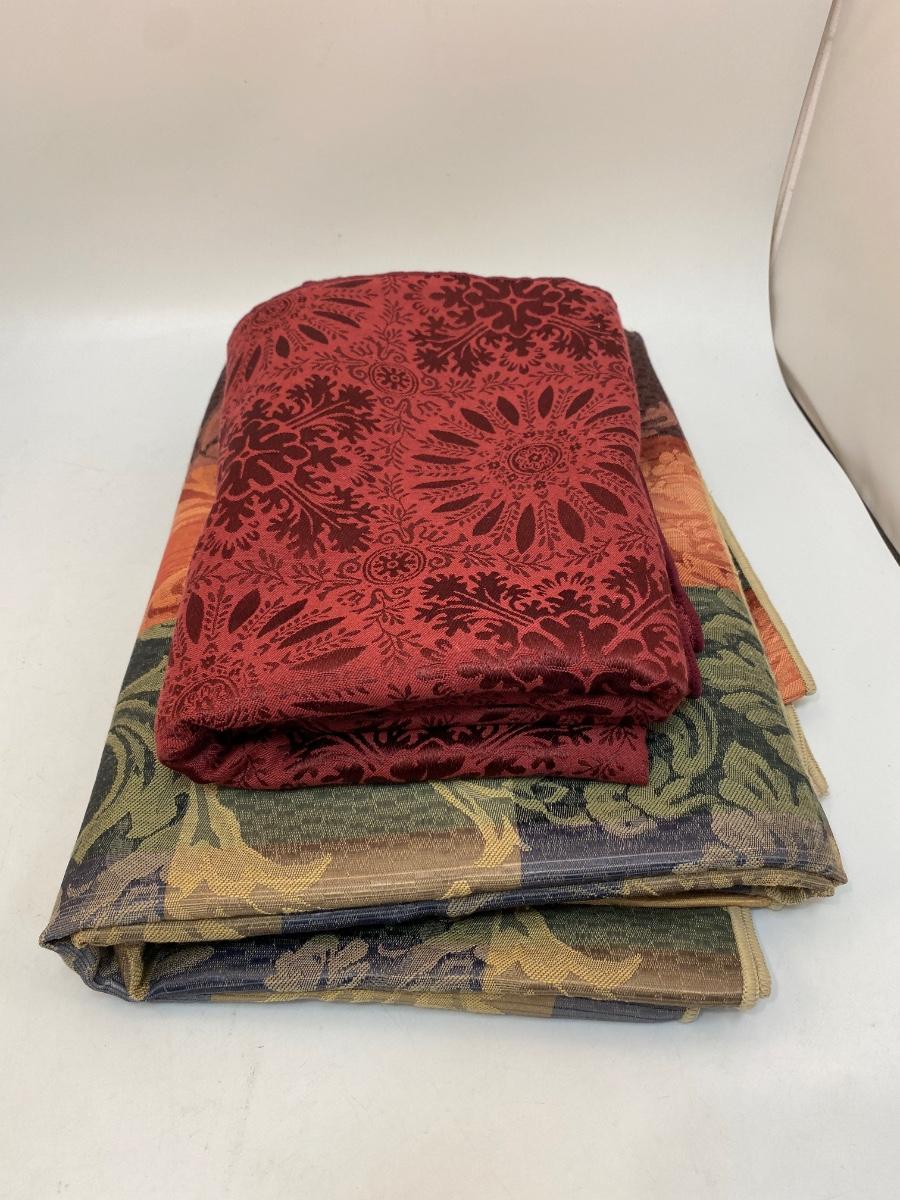 Pair of Jewel Tone Rectangle Tablecloths. Both in good condition. The solid burgundy one is about 4x6 and is Martha Stewart. The multicolored one is about 5x8. No spots or holes.
