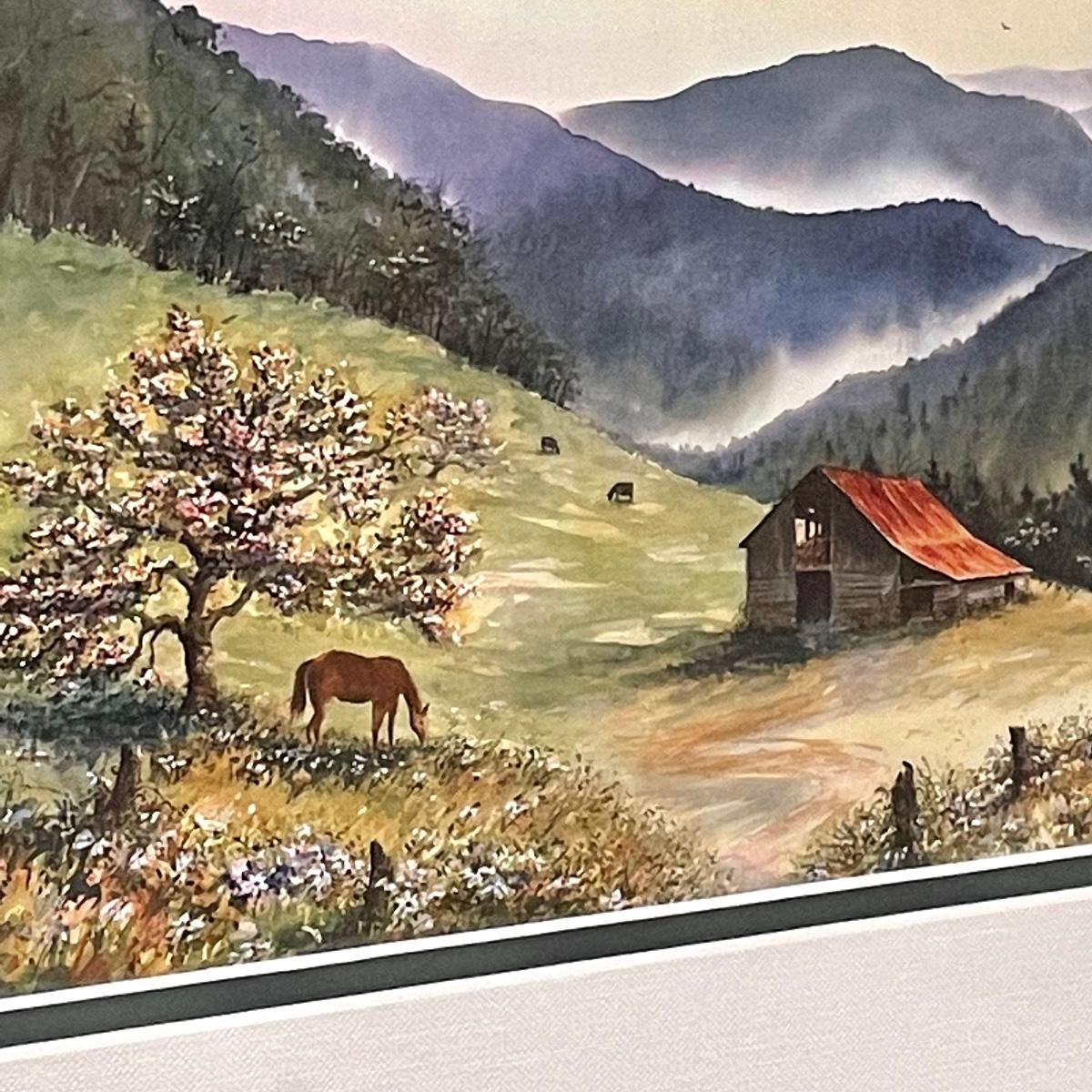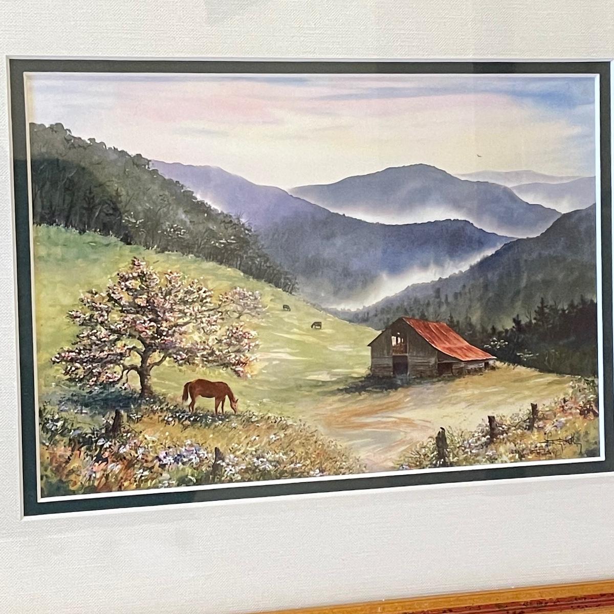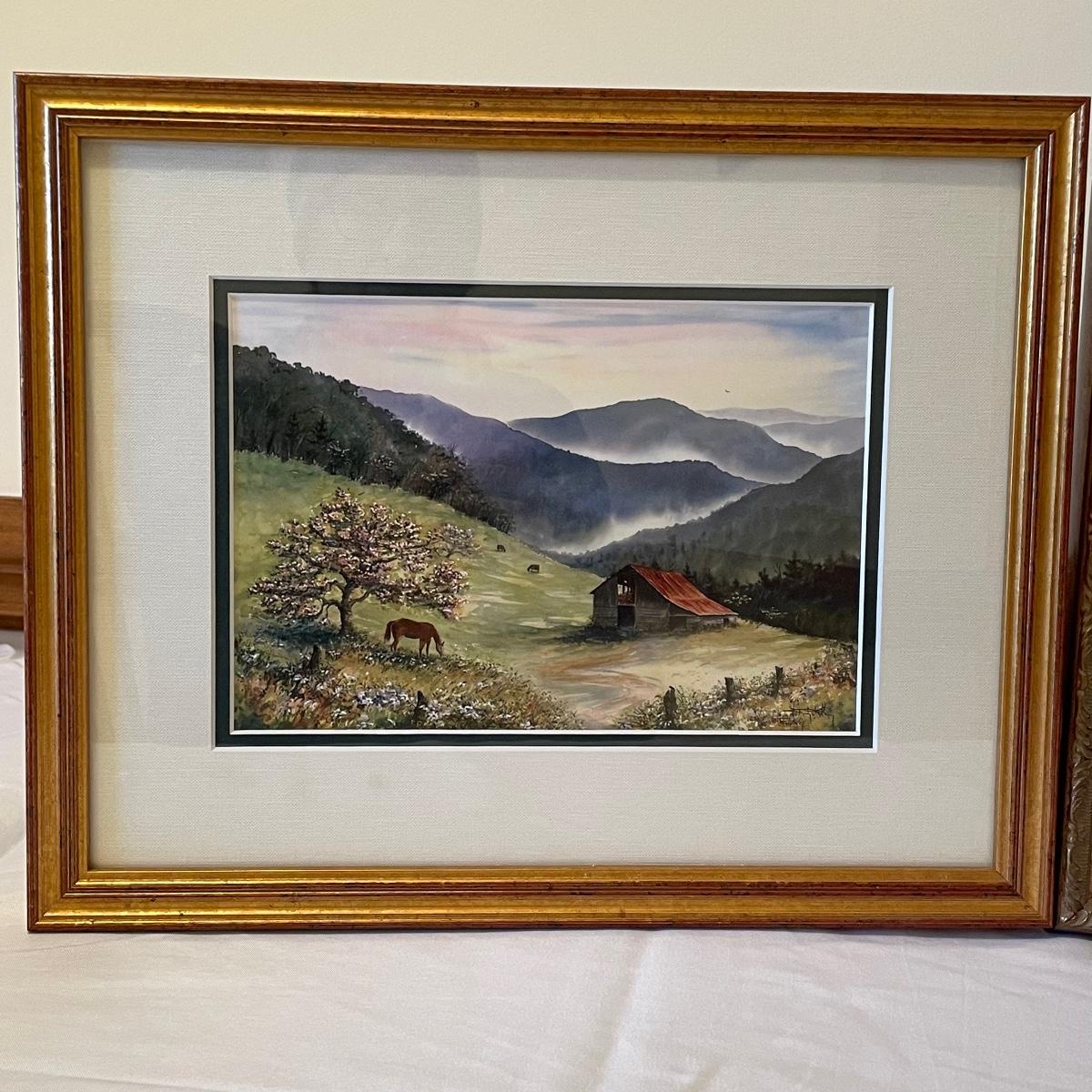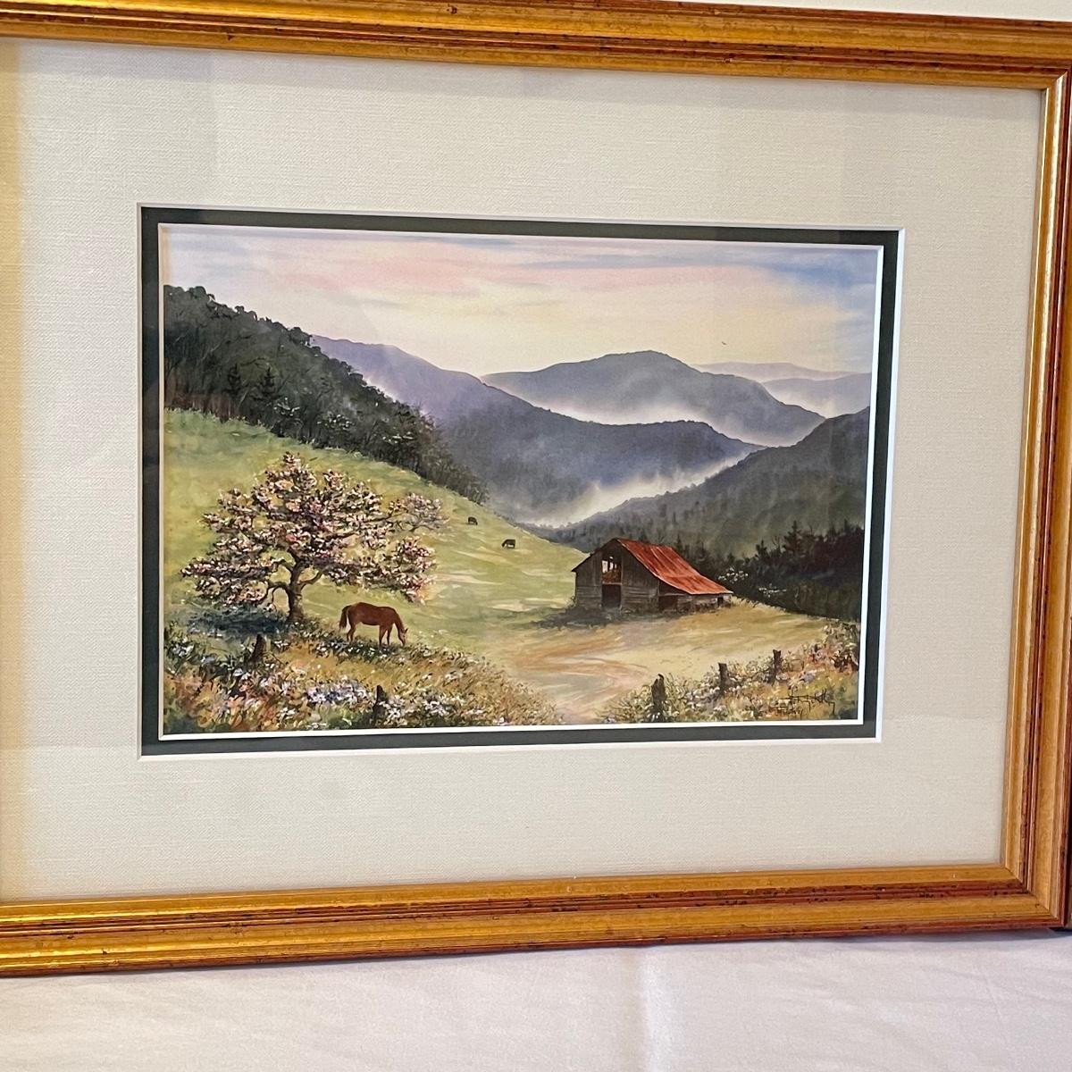 This stunning watercolor print is by Waynesville artist Jo Ridge Kelly. Its matted and mounted in a gilded frame with signature.
