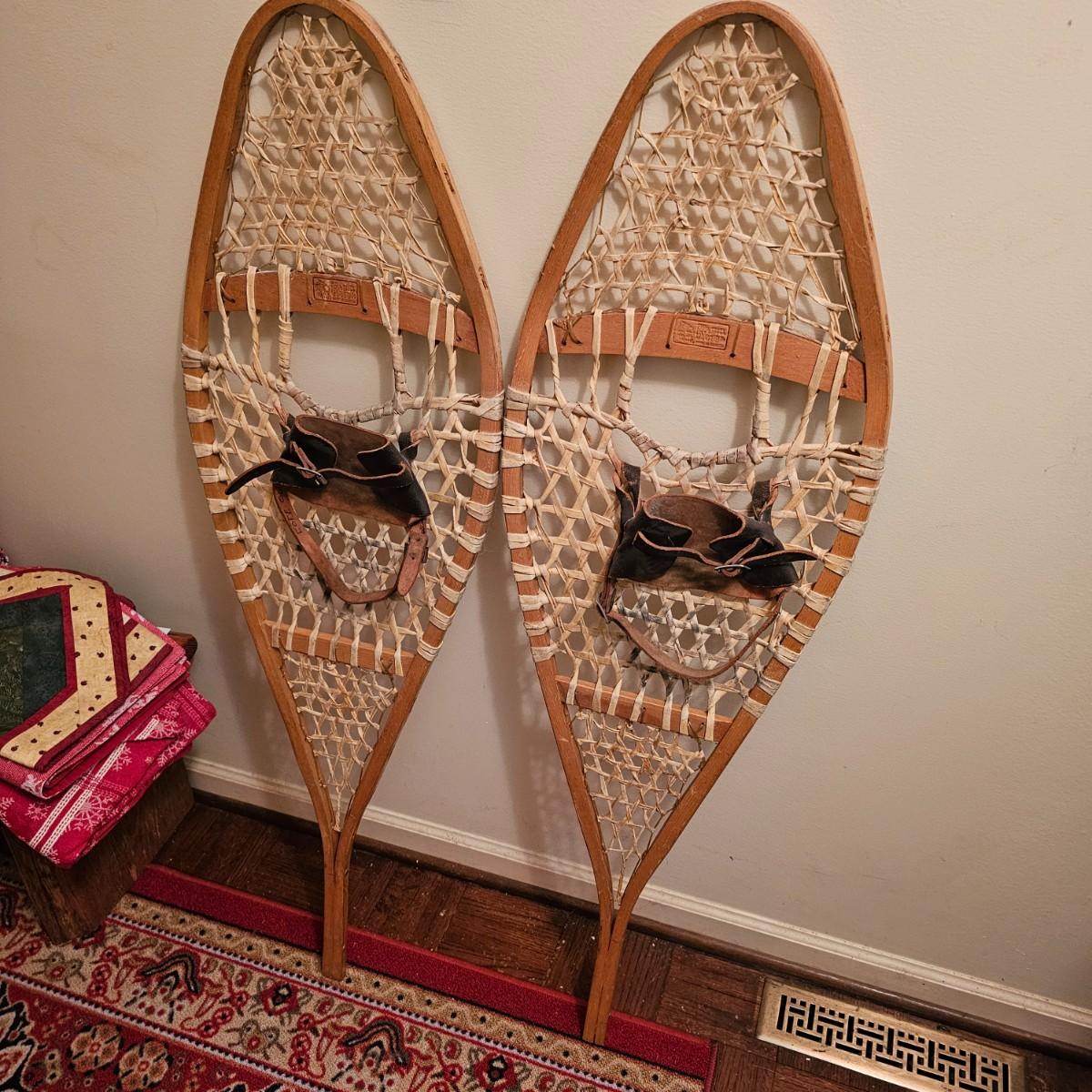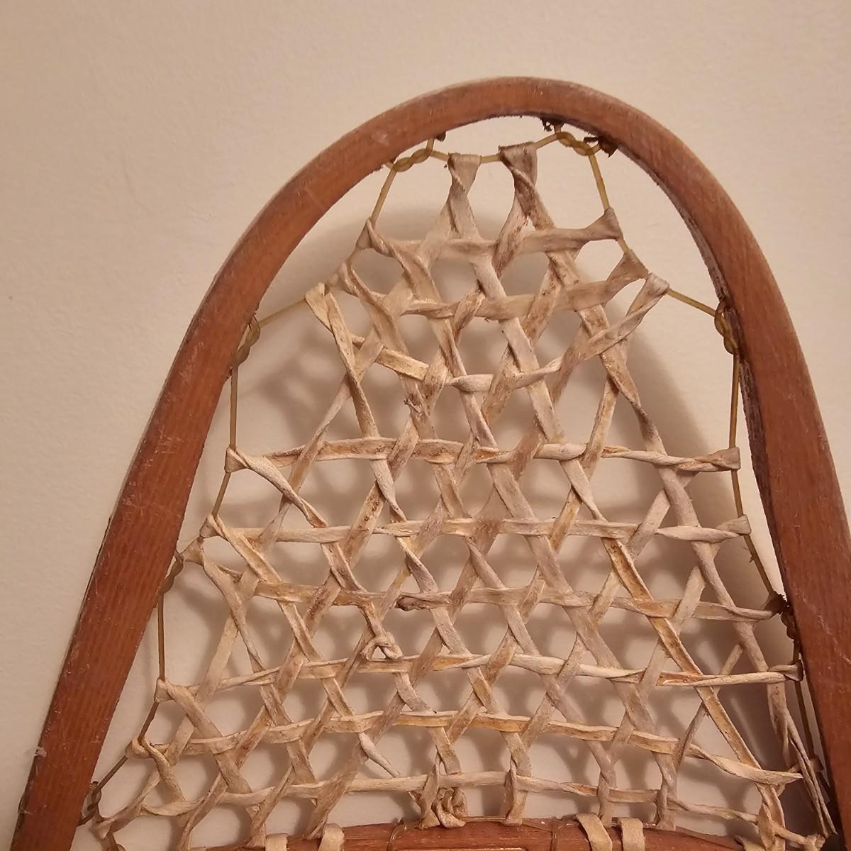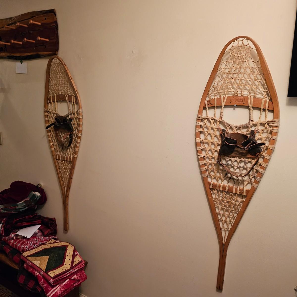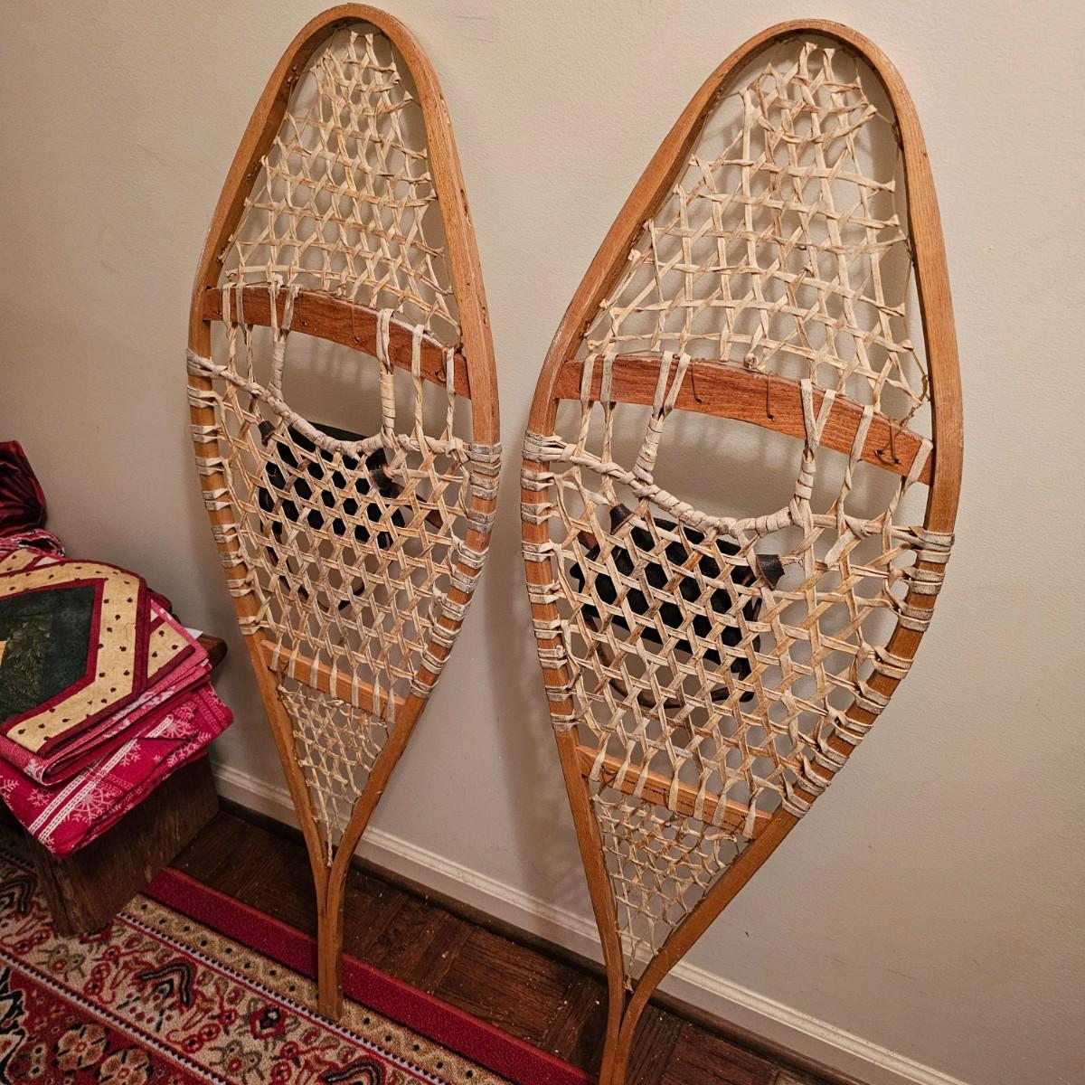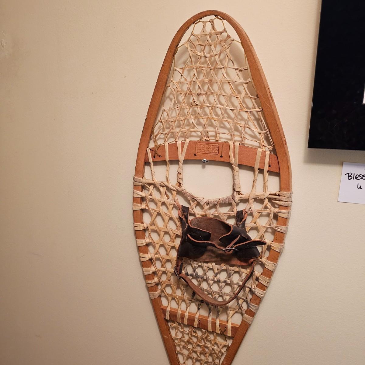 One pair of Canadian made snowshoes for decor. Each piece is stamped with the Kabir Kouba logo across the front brace piece. Shoes are wood frames and twisted sinew baskets and base with leather foot attachment. Each measures 14" x 1" x 48"H. Shoes appear brand new, used for decor. See photos for details. Local pickup only.