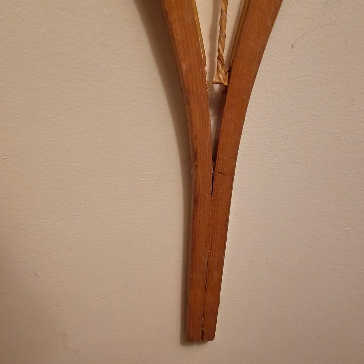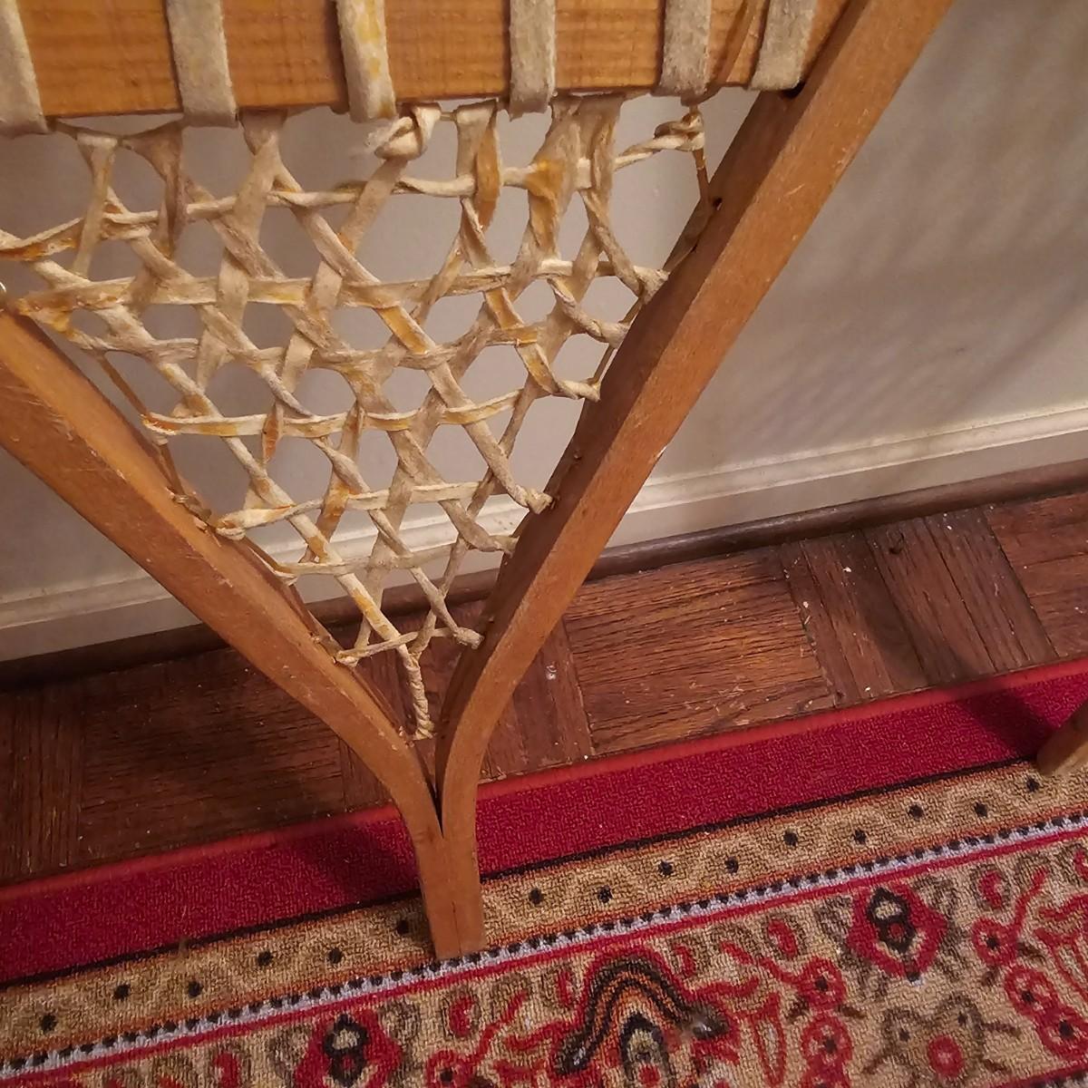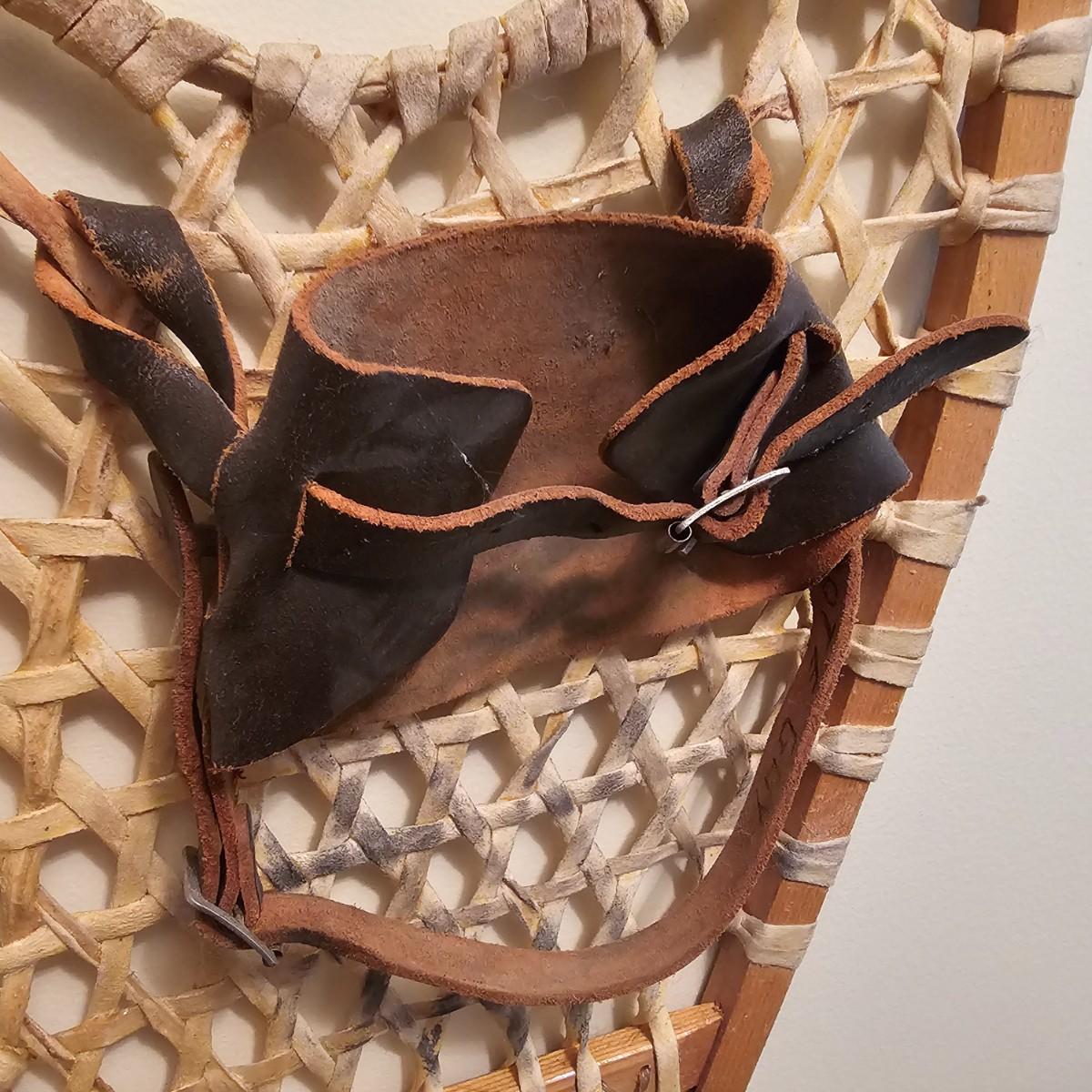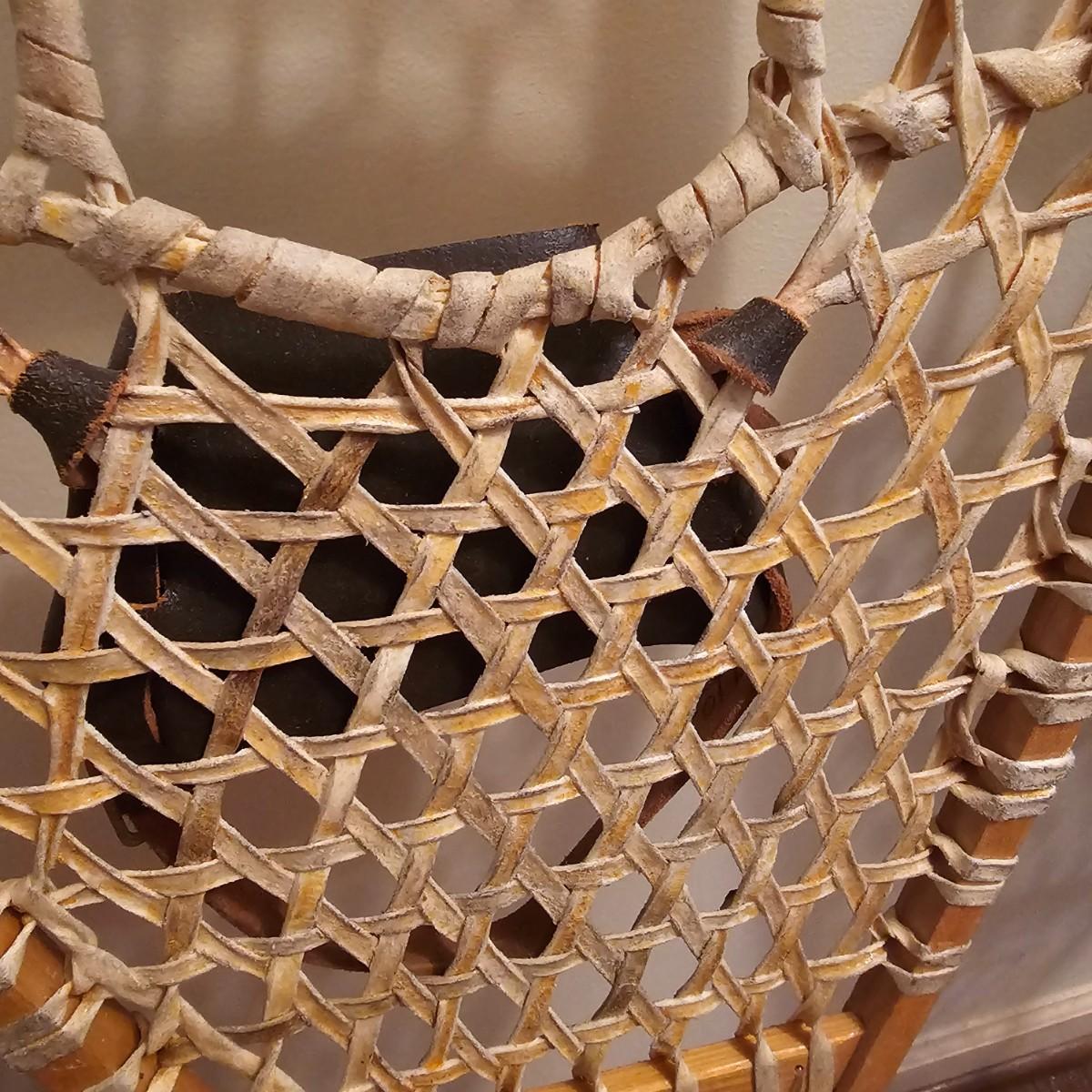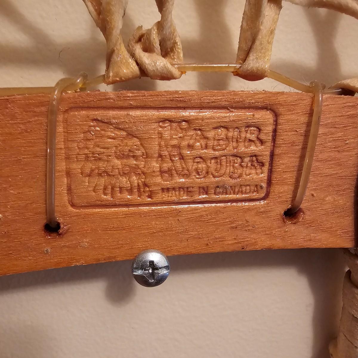 One pair of Canadian made snowshoes for decor. Each piece is stamped with the Kabir Kouba logo across the front brace piece. Shoes are wood frames and twisted sinew baskets and base with leather foot attachment. Each measures 14" x 1" x 48"H. Shoes appear brand new, used for decor. See photos for details. Local pickup only.