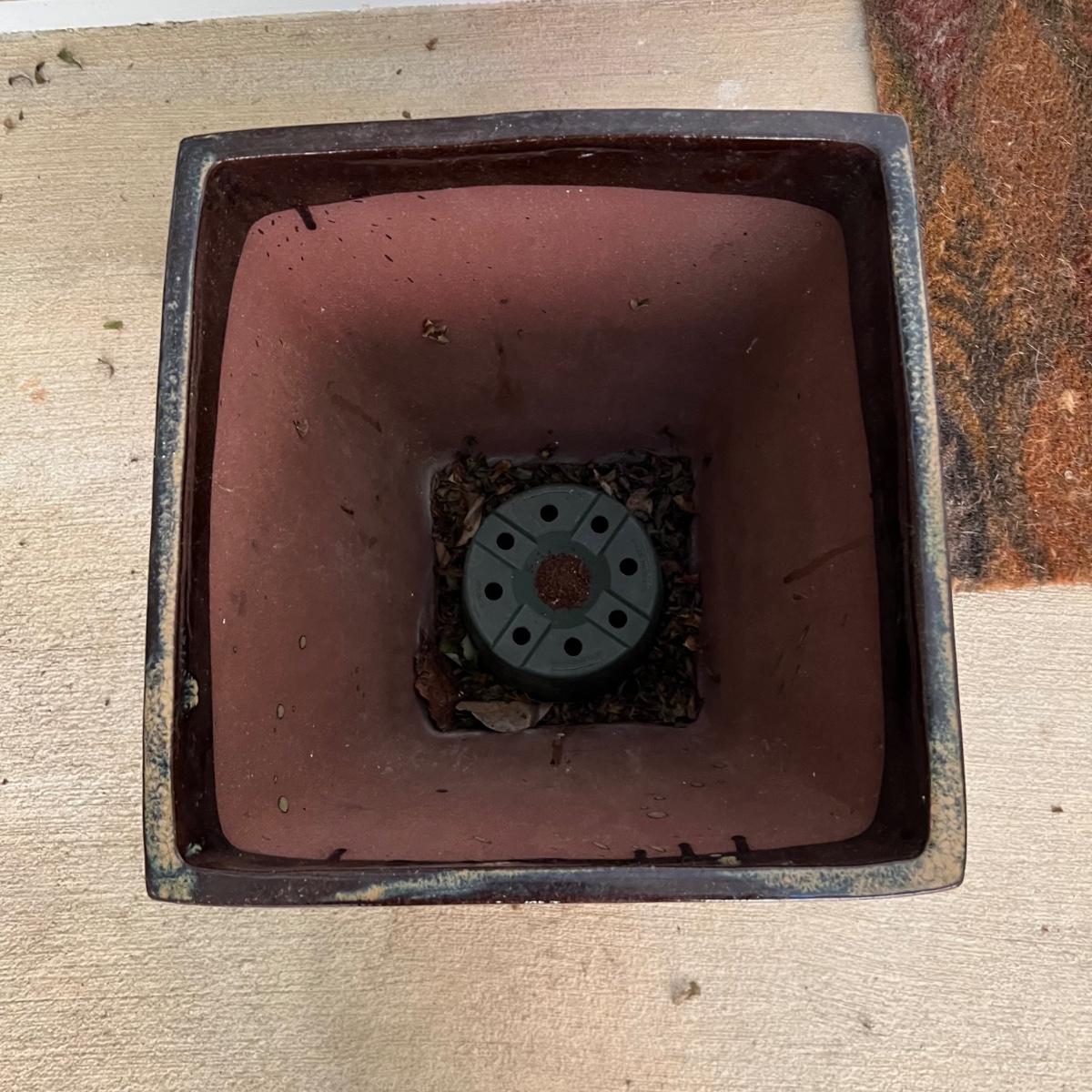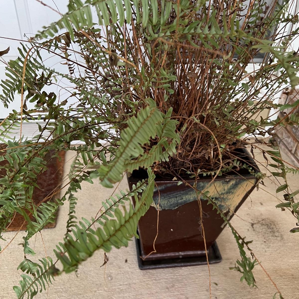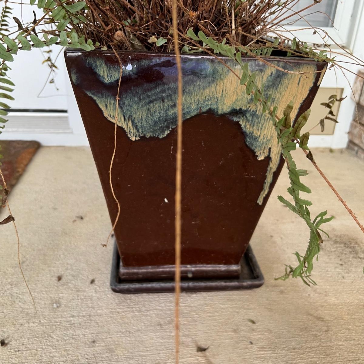 These two pottery plant pots have a brown glaze with a dripped glaze design; one drainage dish is broken, it could be glued back together but a small section is missing. Once glued and with pot in place it is hard to notice the defect. These pots house two ferns, they were very dry and should regain health now they have been watered and a slightly larger pot would also help. Winning bidder isn’t required to take the plants if not desired.