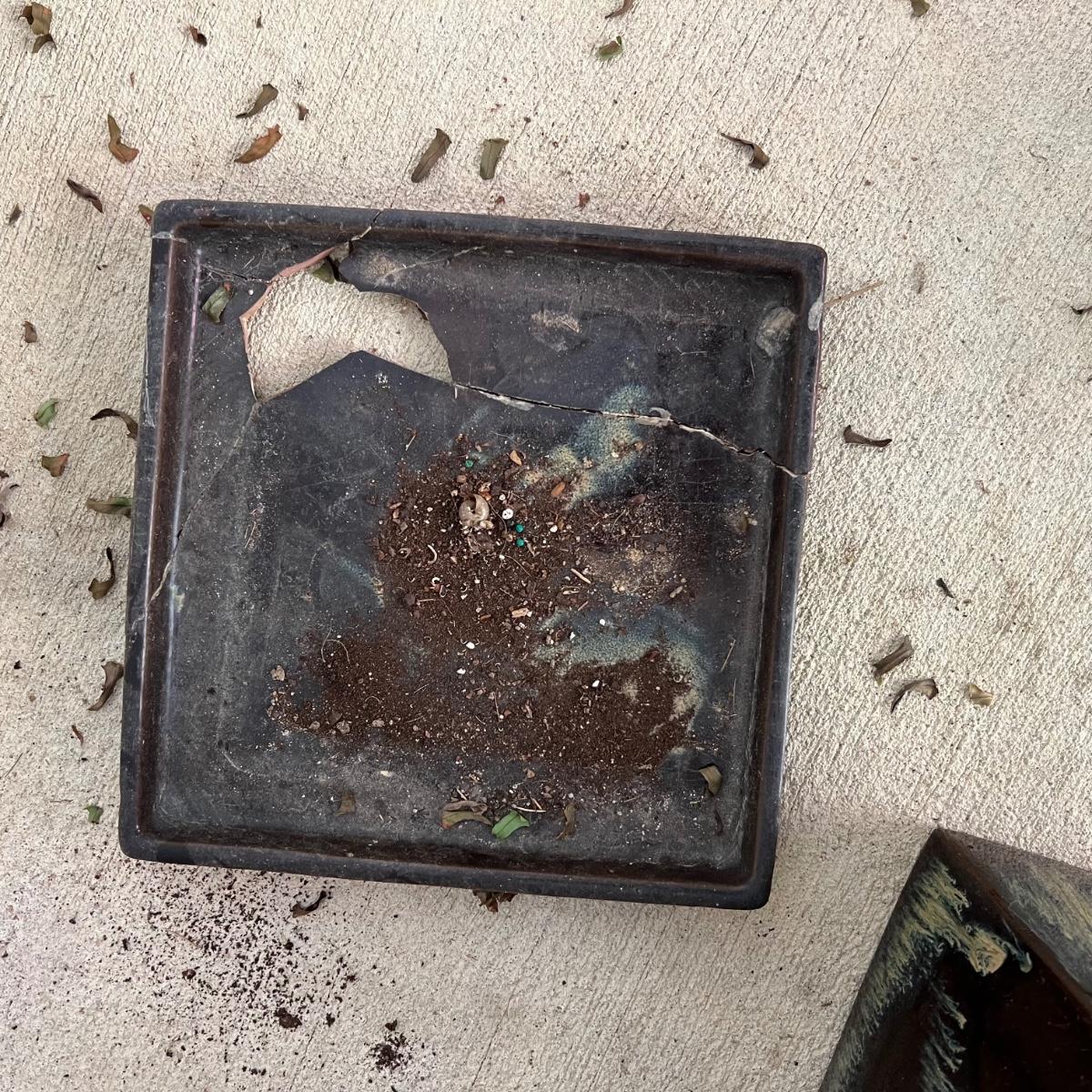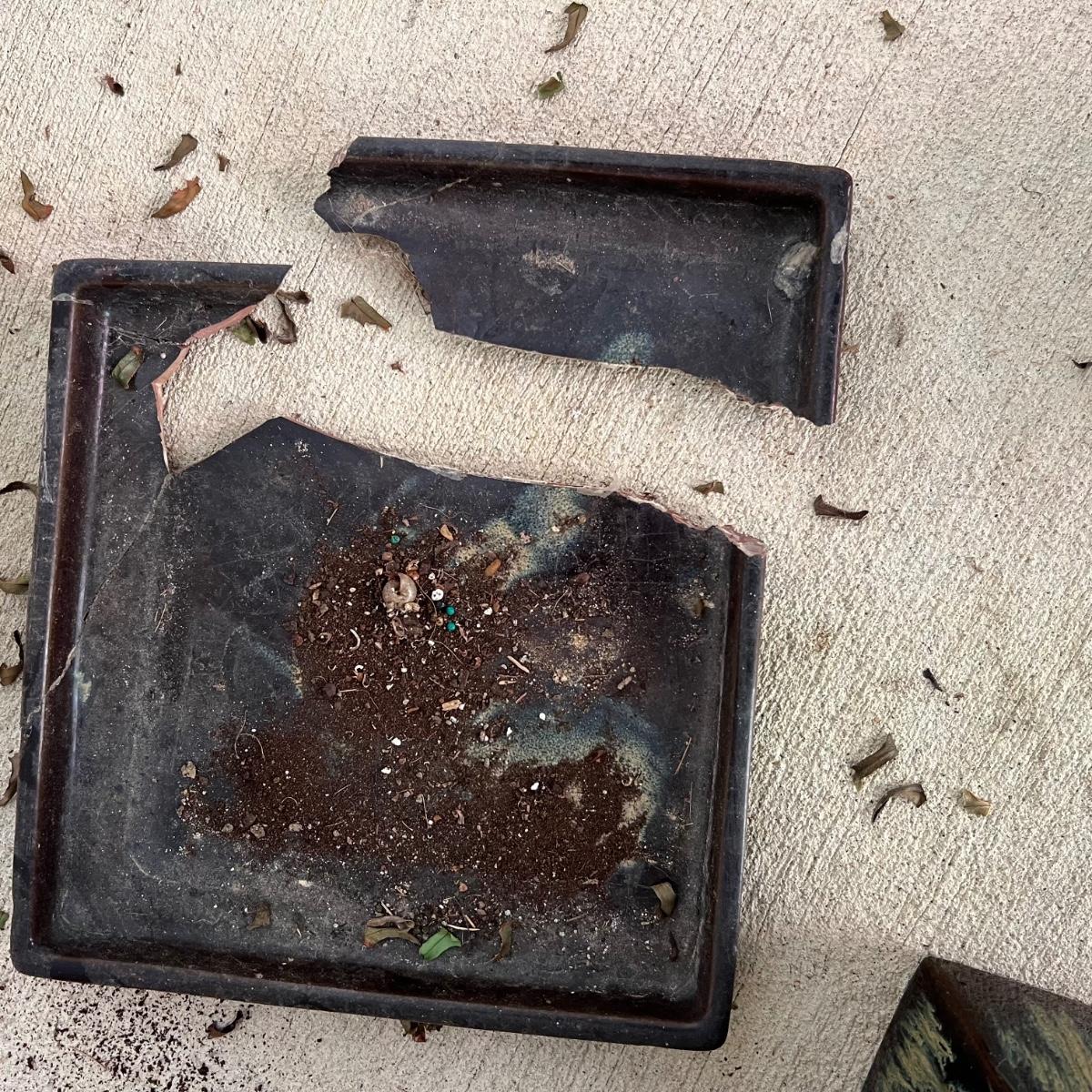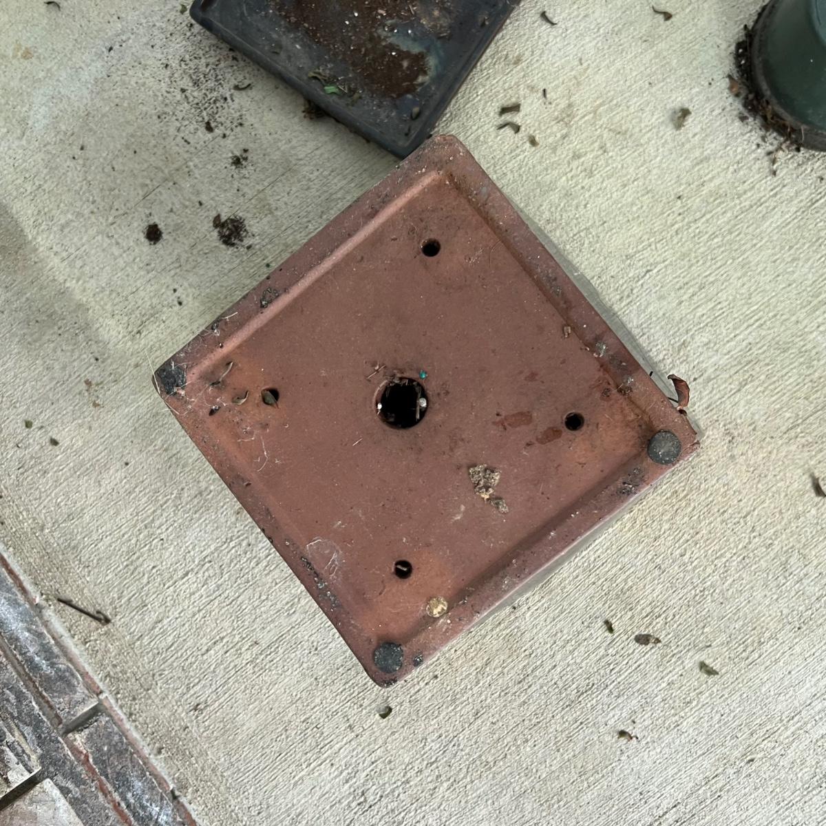 These two pottery plant pots have a brown glaze with a dripped glaze design; one drainage dish is broken, it could be glued back together but a small section is missing. Once glued and with pot in place it is hard to notice the defect. These pots house two ferns, they were very dry and should regain health now they have been watered and a slightly larger pot would also help. Winning bidder isn’t required to take the plants if not desired.