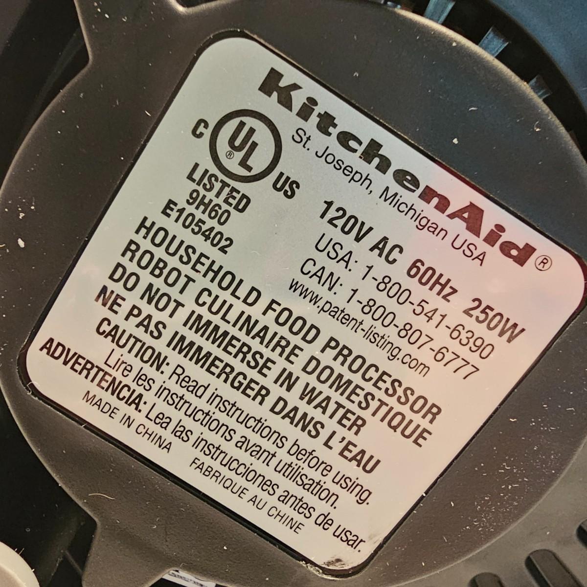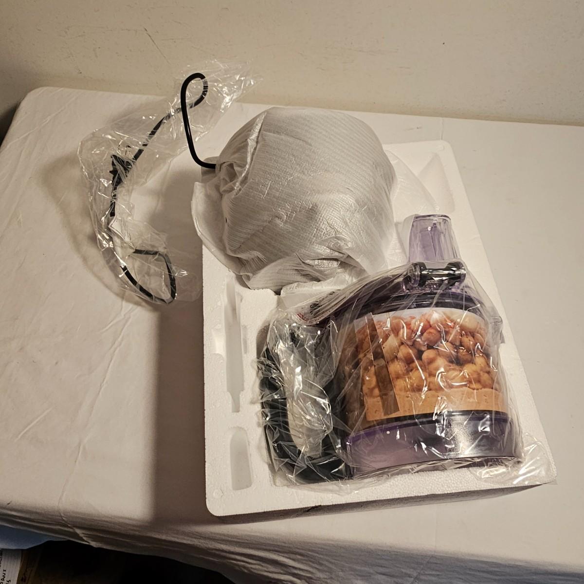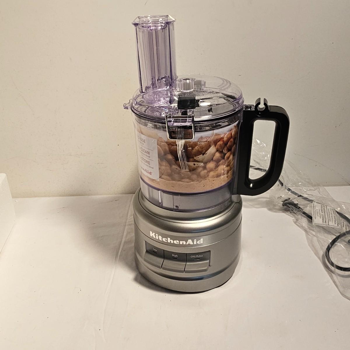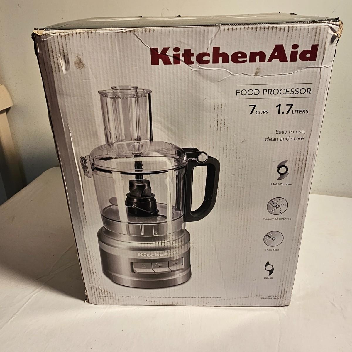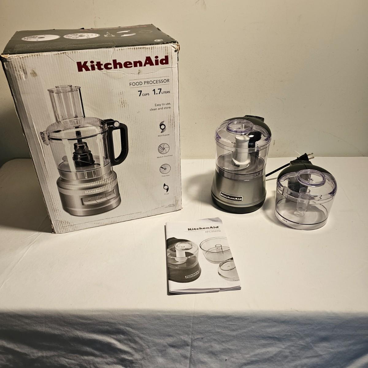 Two food processors by Kitchen Aid. Smaller unit comes with extra top cup, measures 5.5"D x 9"H. Larger item has seven cup capacity, food chute on top for feeding items in. Measures 9" x 9" x 15"H. Both items new in box, not tested. See photos for details. Shipping available.