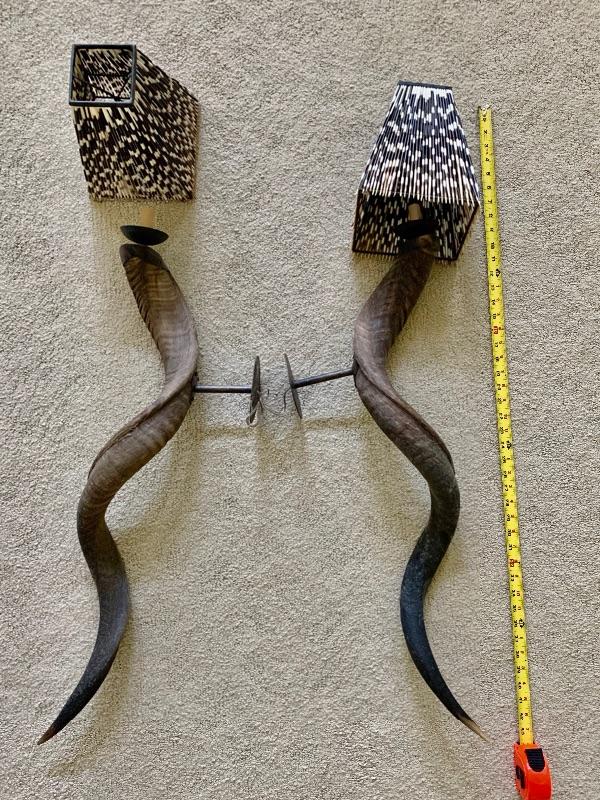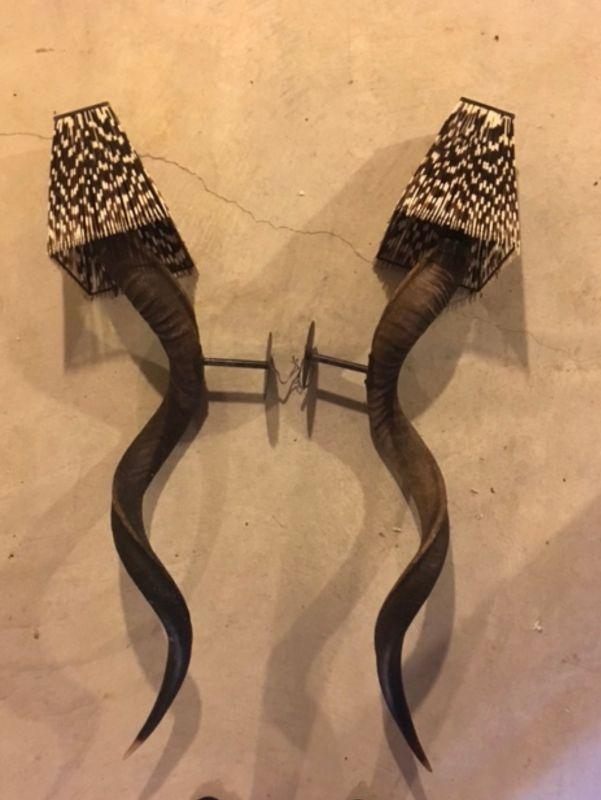 Lot # 434 Pair of Kudo Horn Lighted Sconces with Porcupine Quill Shades