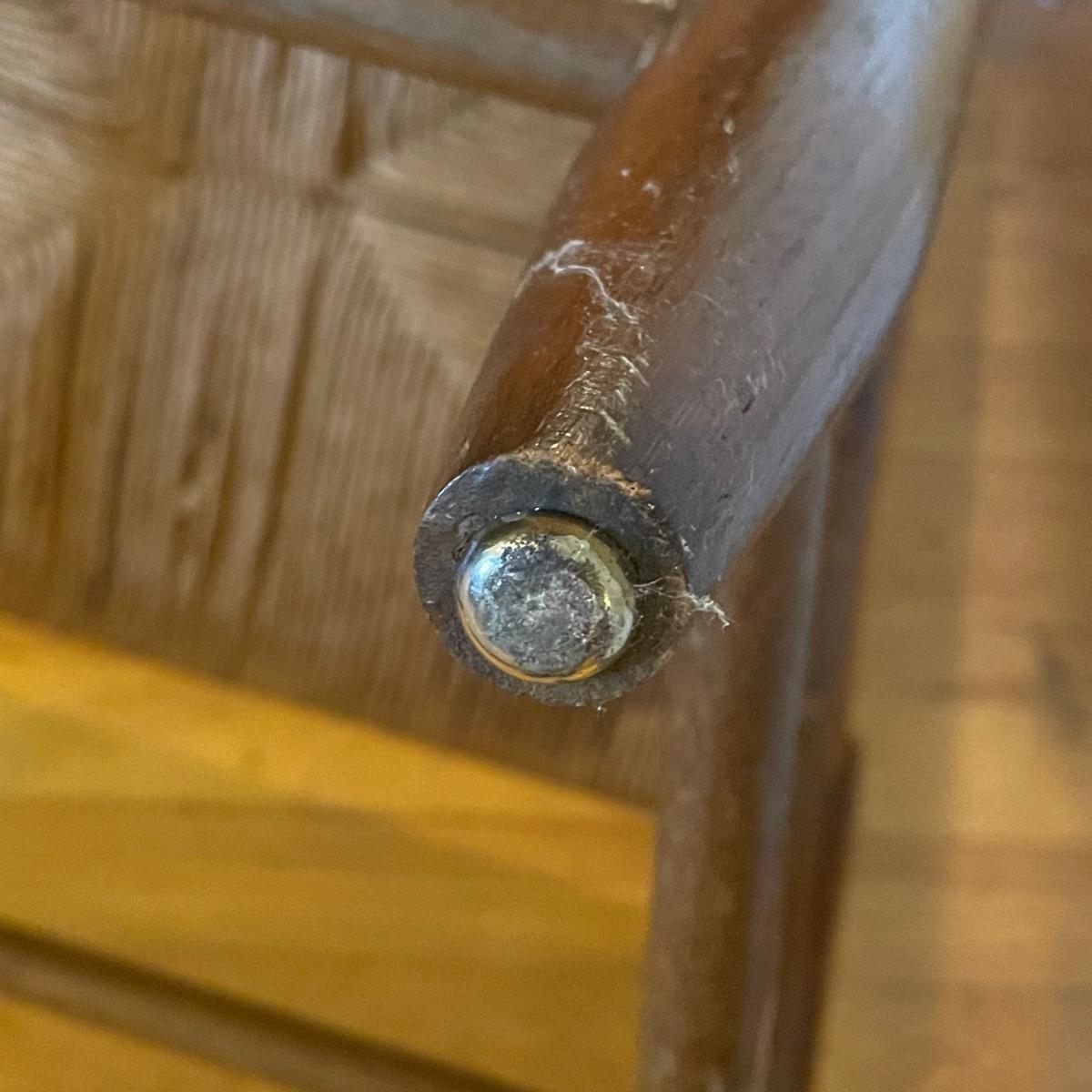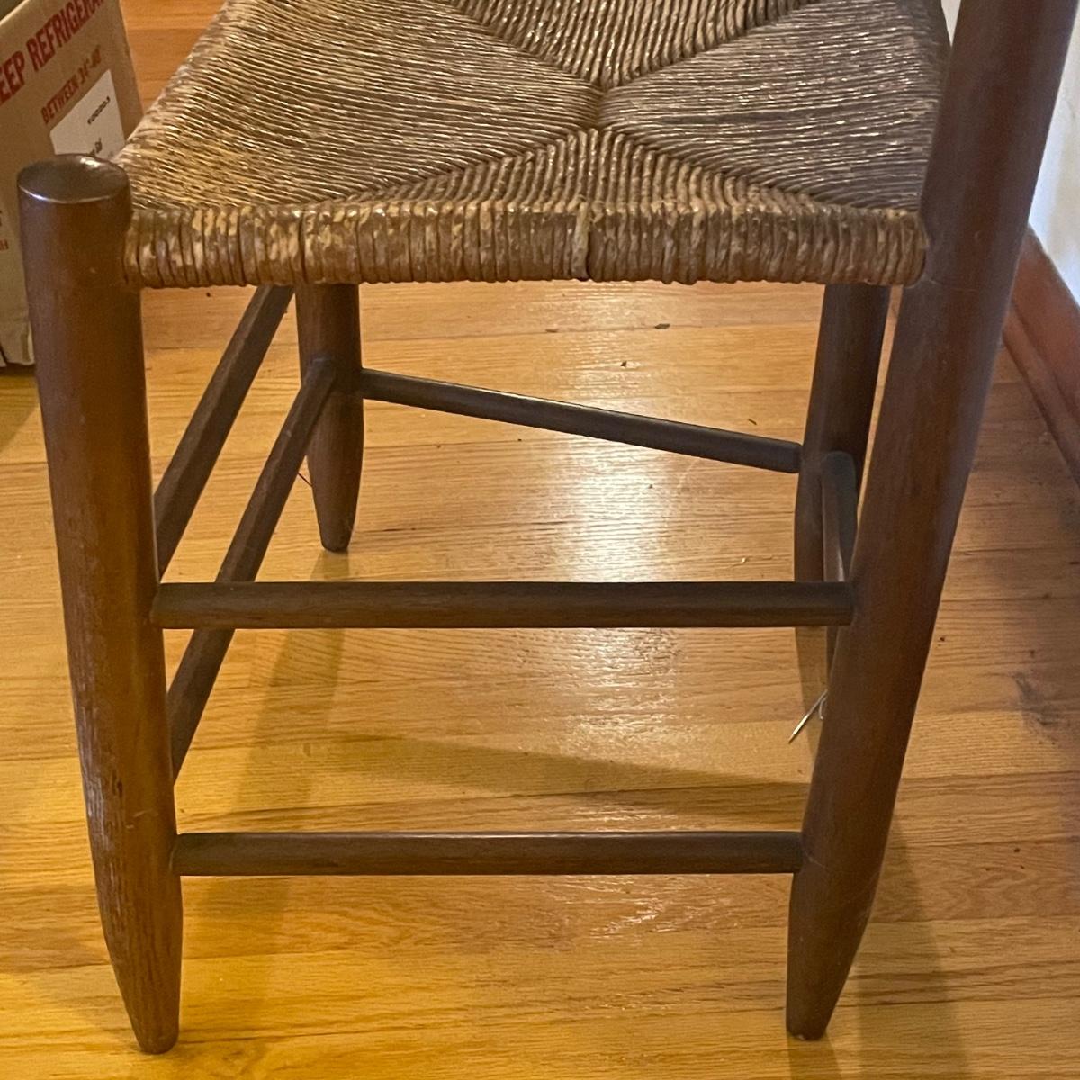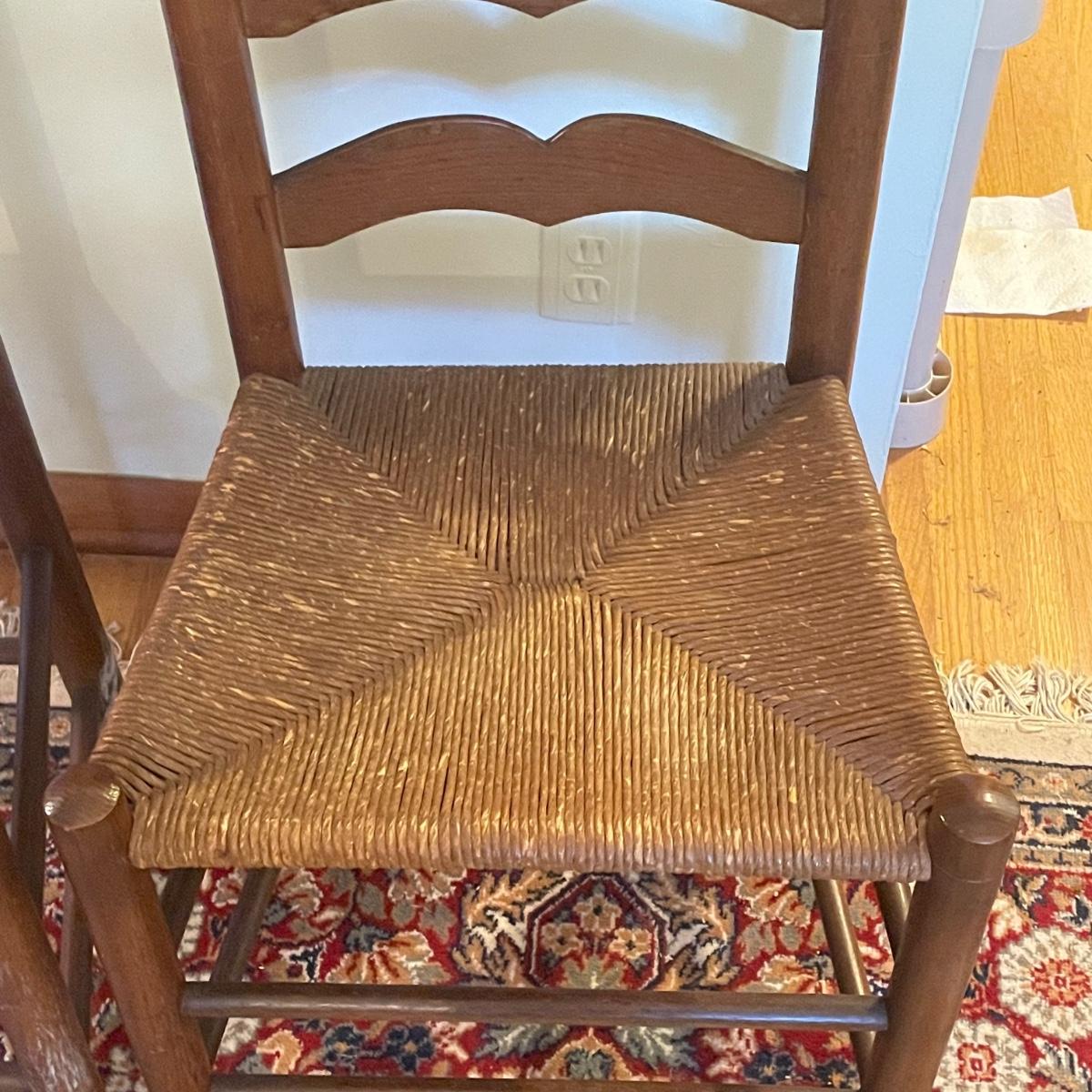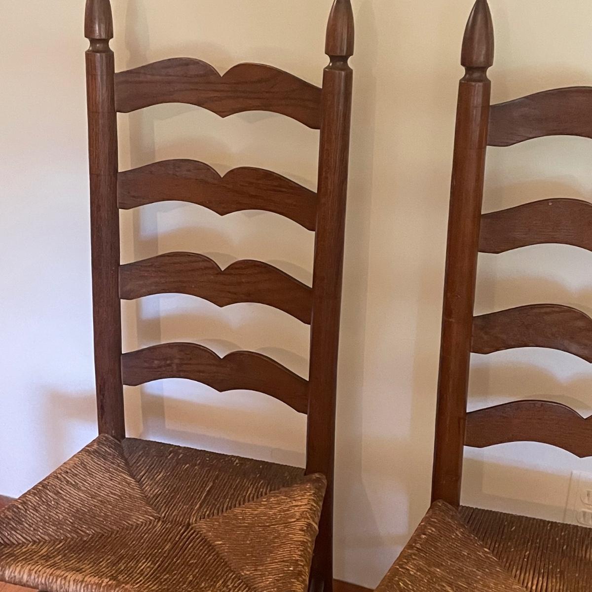 This matching pair of ladderback chairs are in good condition; their rush woven reed seats are also in good condition. The legs have metal tips on the ends, one of which is missing on one chair. and their are some minor scuff marks in the wood frames of both chairs, shown in images.