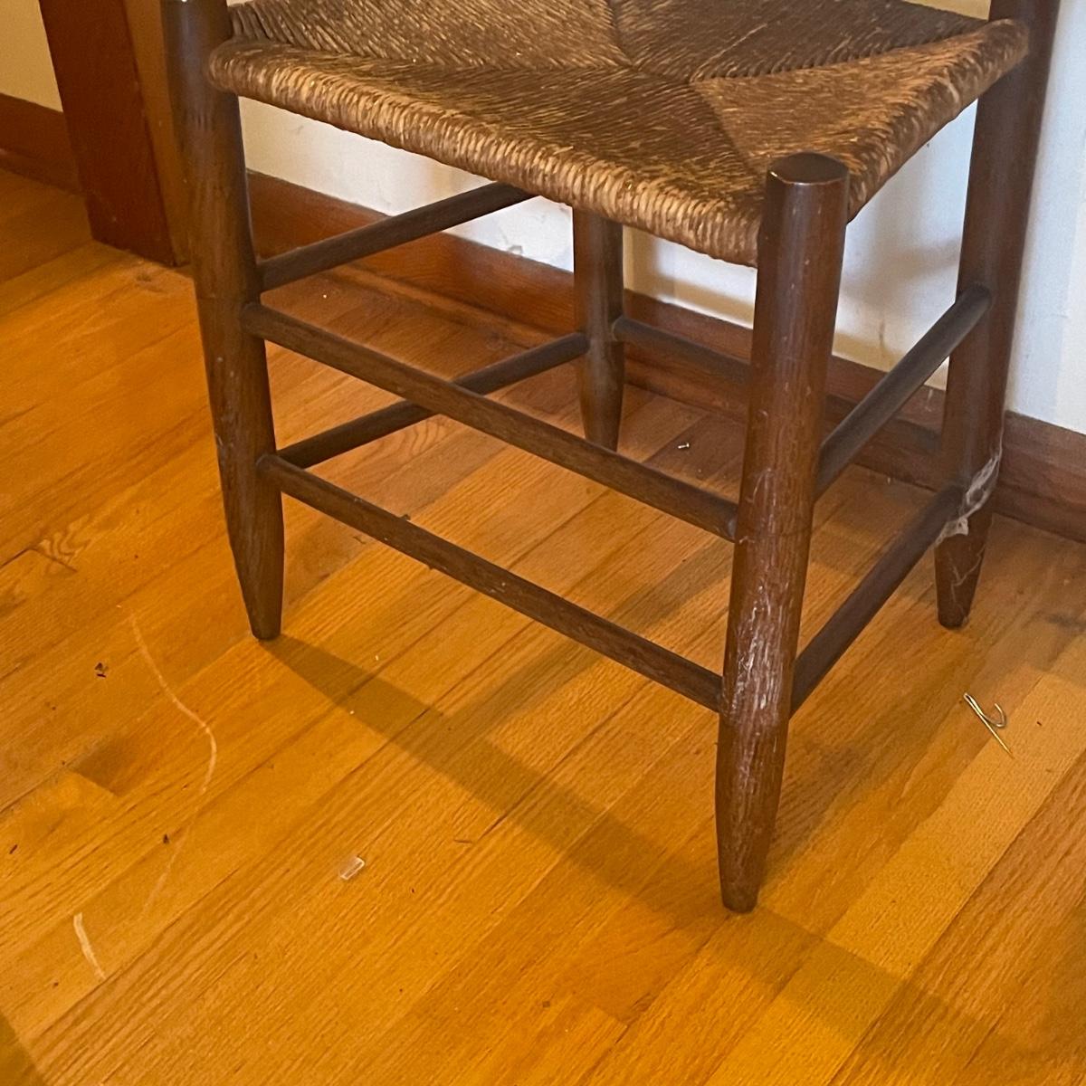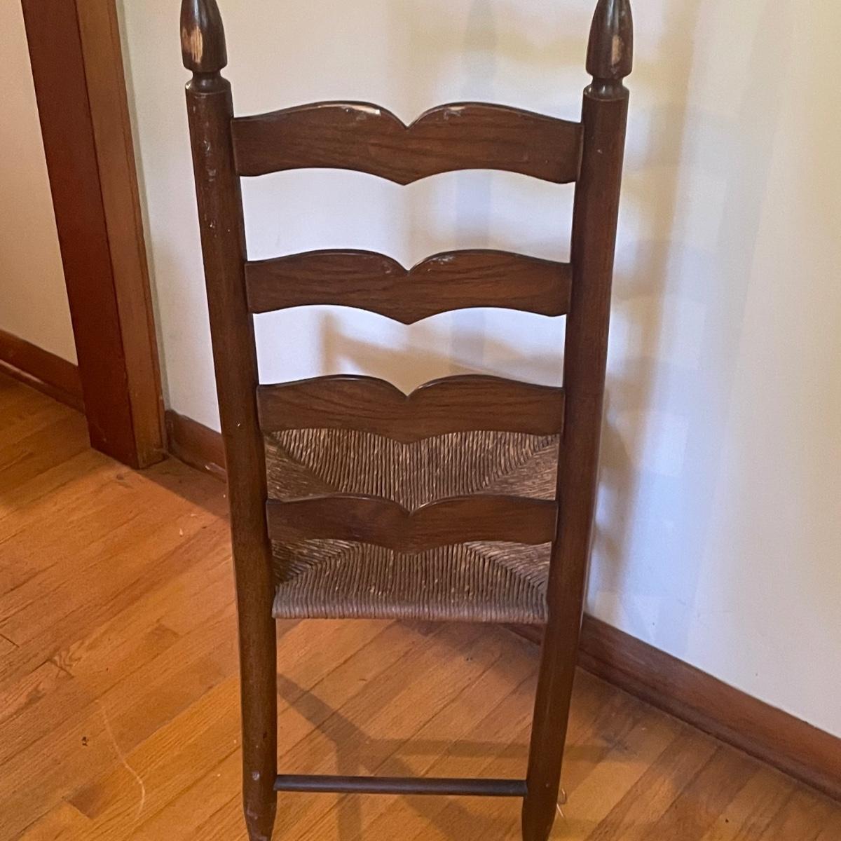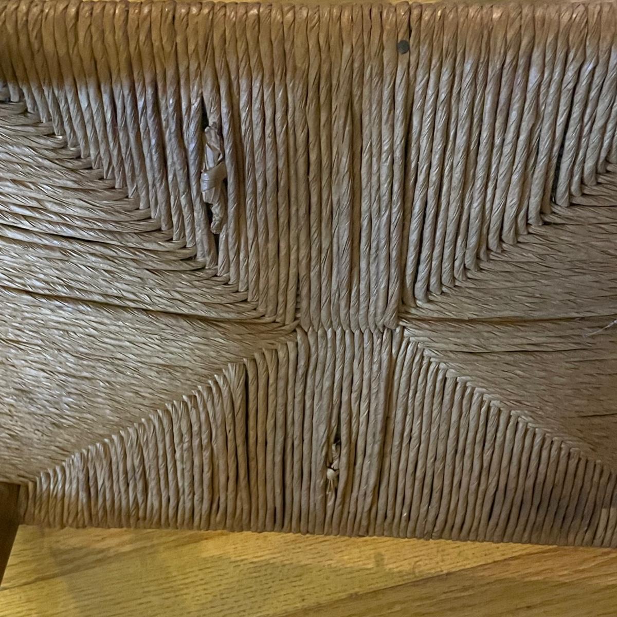 This matching pair of ladderback chairs are in good condition; their rush woven reed seats are also in good condition. The legs have metal tips on the ends, one of which is missing on one chair. and their are some minor scuff marks in the wood frames of both chairs, shown in images.