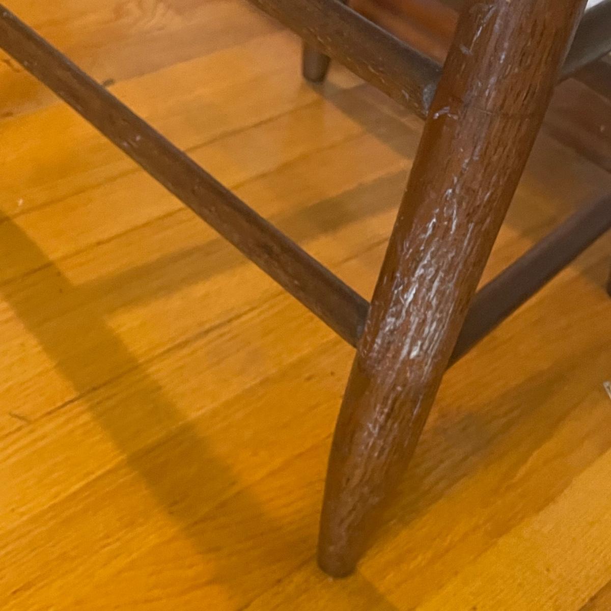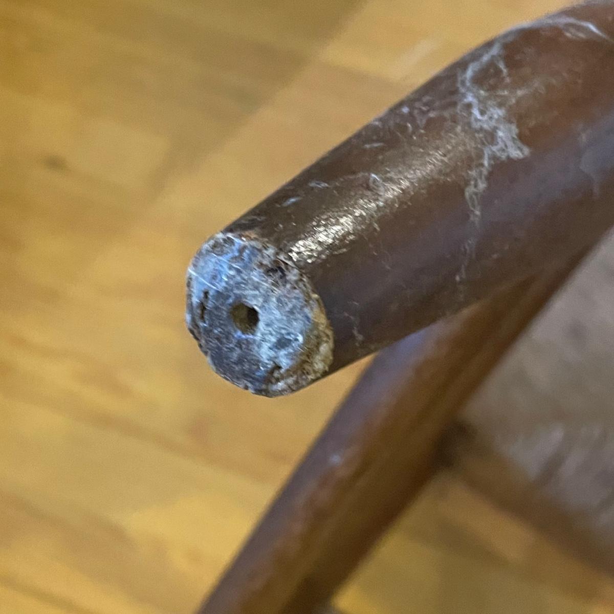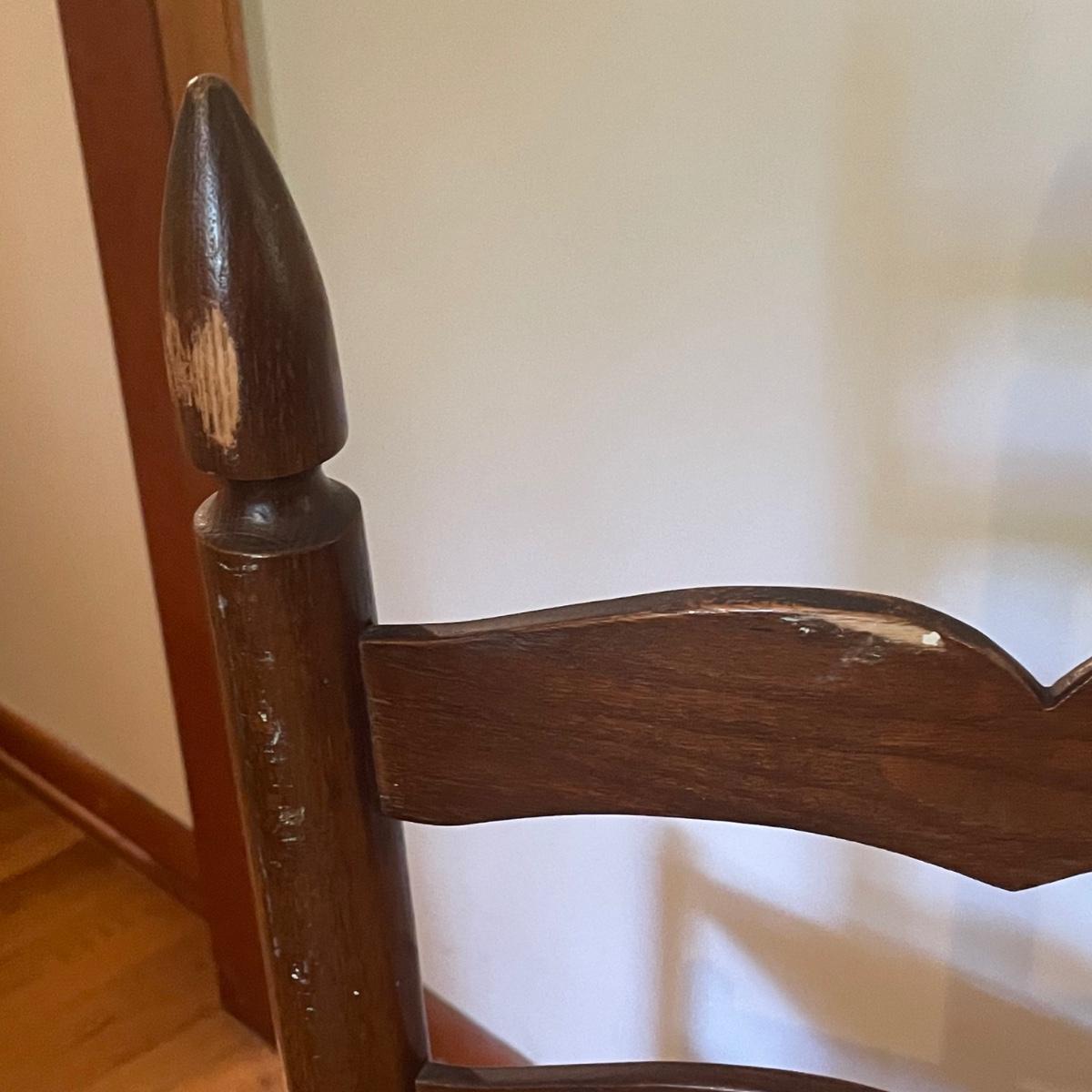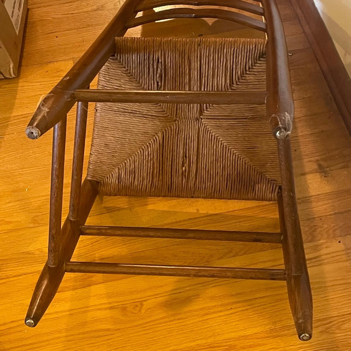 This matching pair of ladderback chairs are in good condition; their rush woven reed seats are also in good condition. The legs have metal tips on the ends, one of which is missing on one chair. and their are some minor scuff marks in the wood frames of both chairs, shown in images.