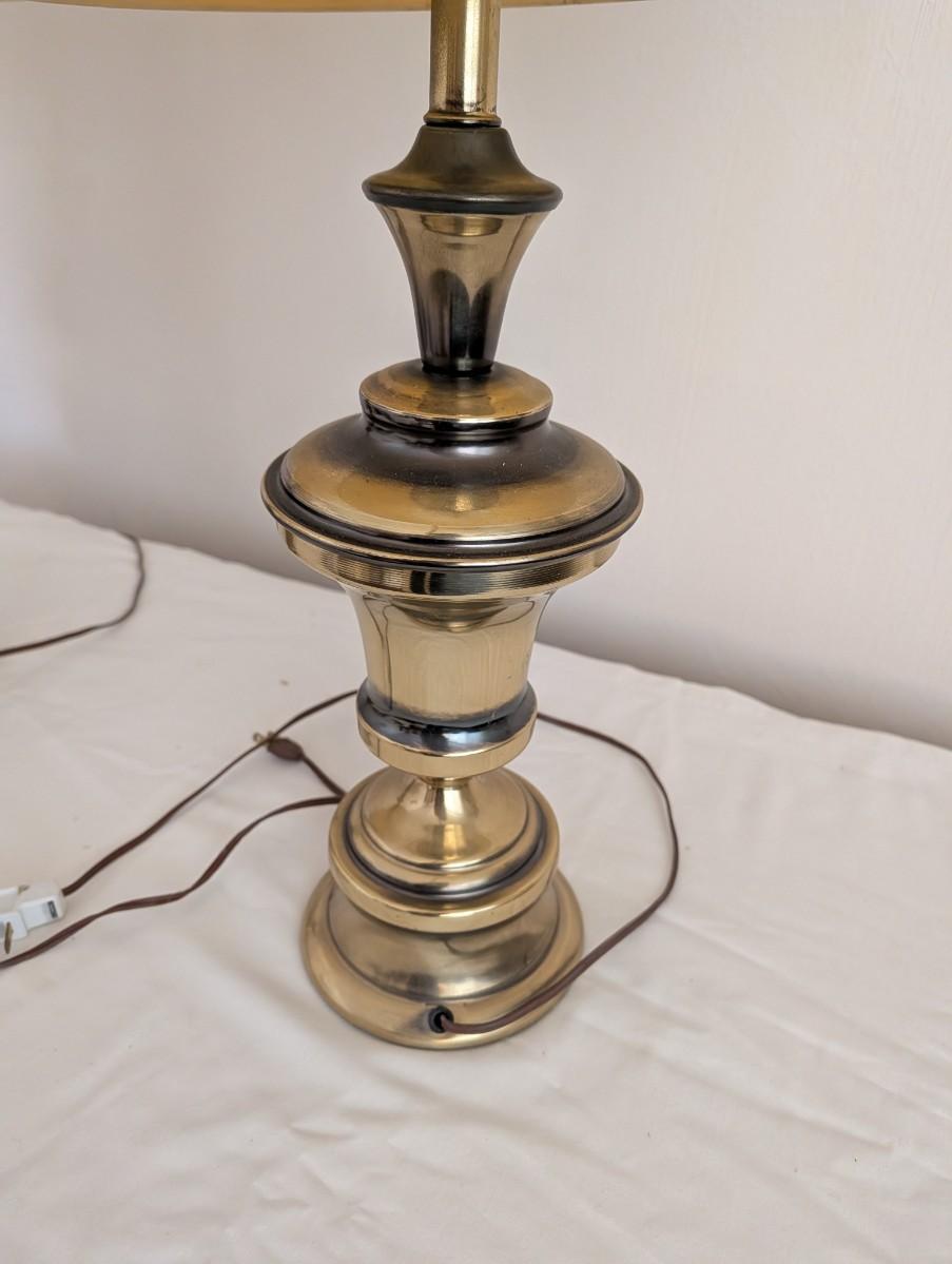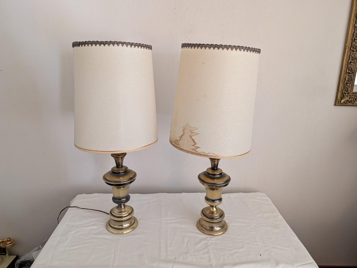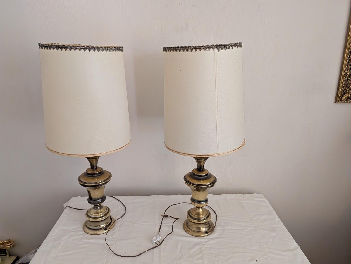 Pair of Vintage brass lamps, with a black and gold material added to the top of the lamp shade. They do work, One has a stained lamp shade.