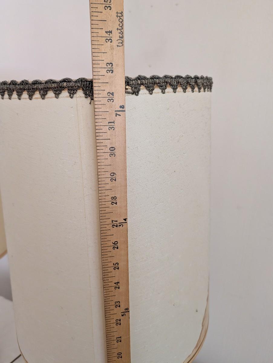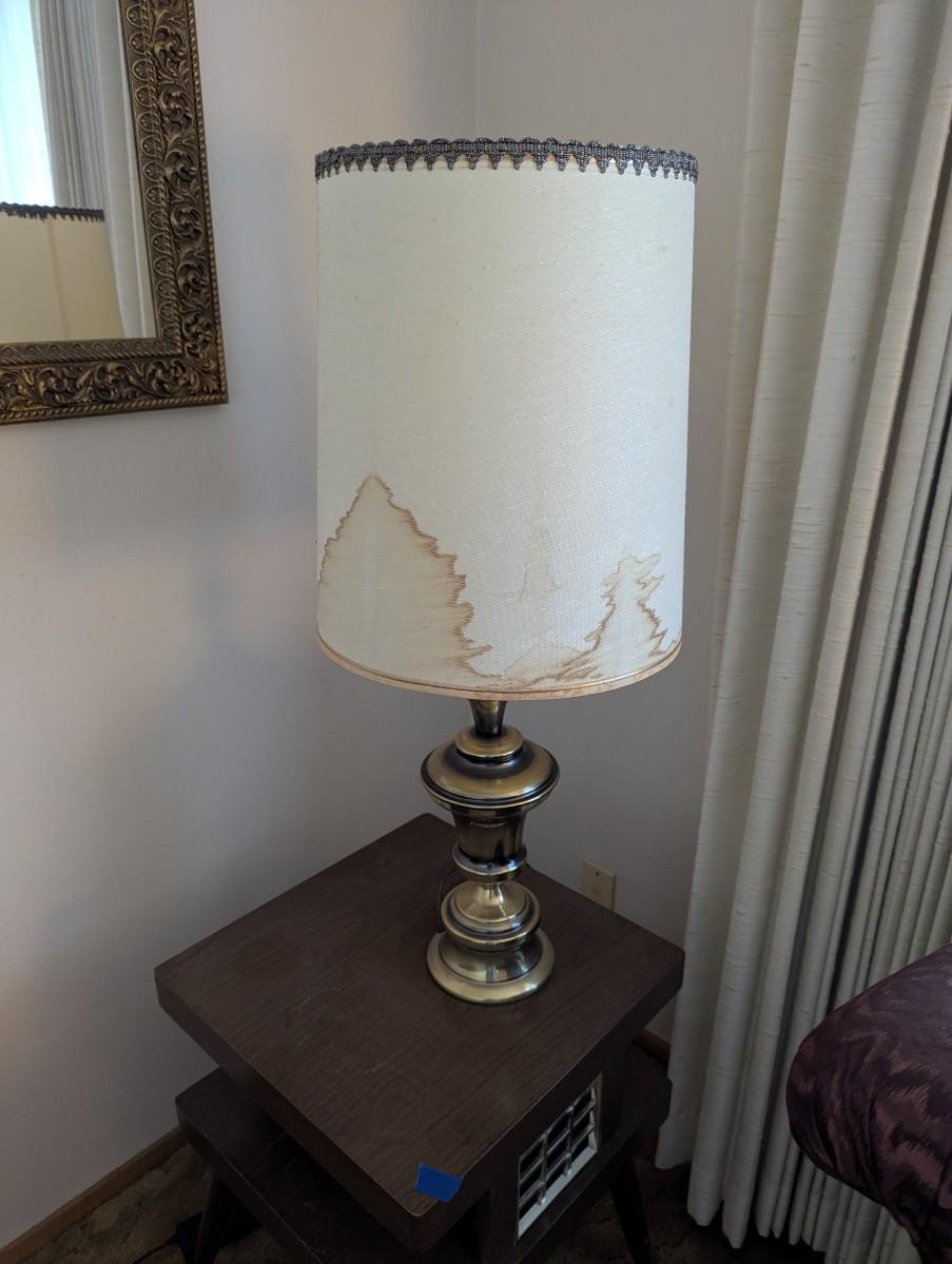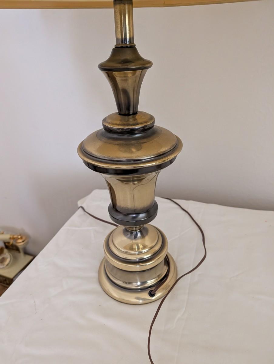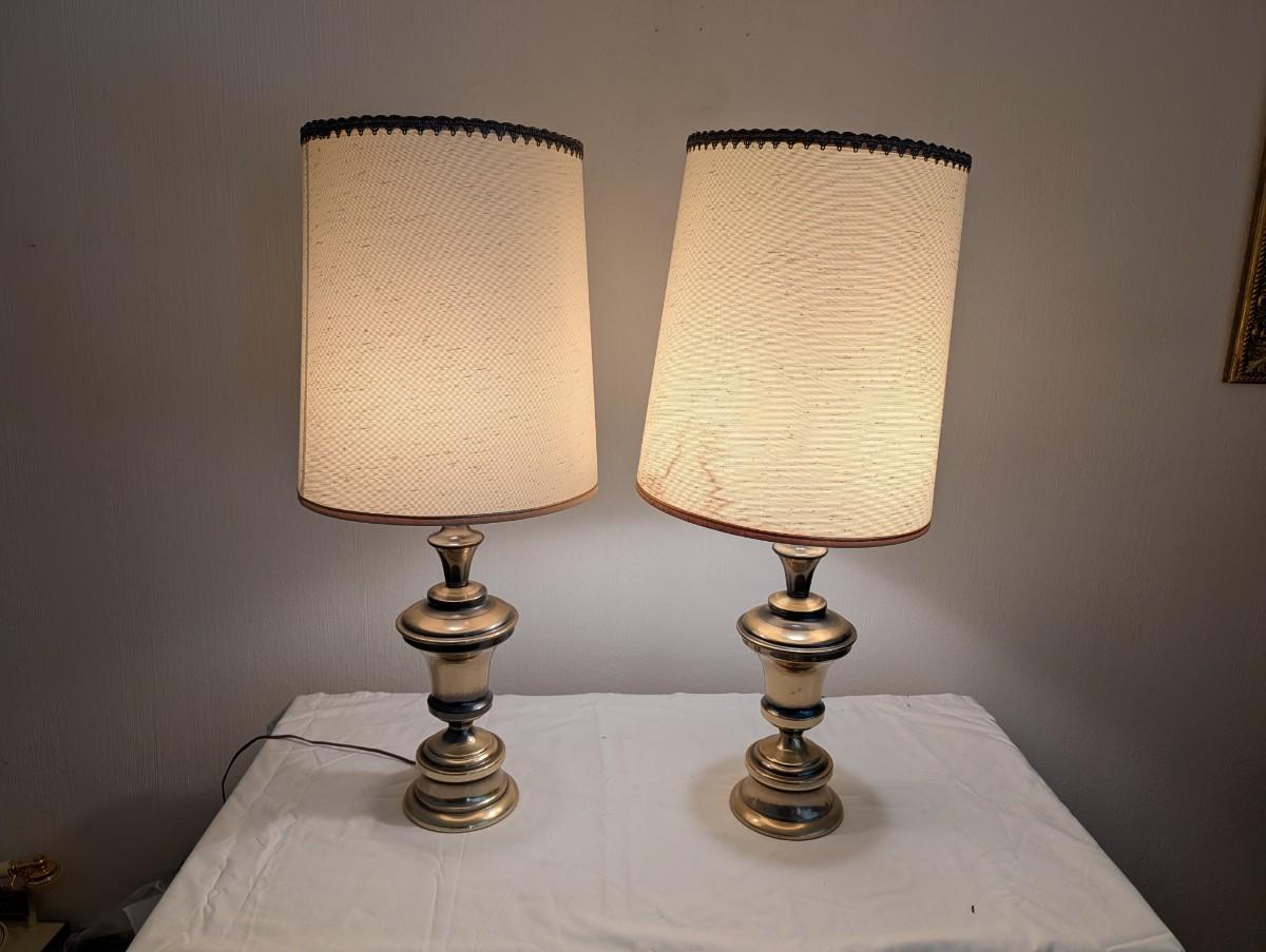 Pair of Vintage brass lamps, with a black and gold material added to the top of the lamp shade. They do work, One has a stained lamp shade.