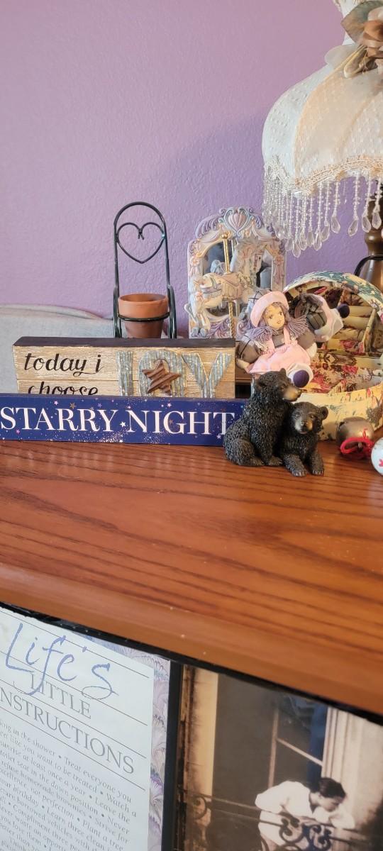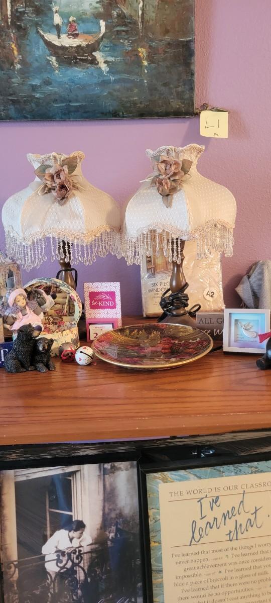 Pair of lamps, three invitational wall hangings. Other decor abd signs. Excludes table and art on wall.