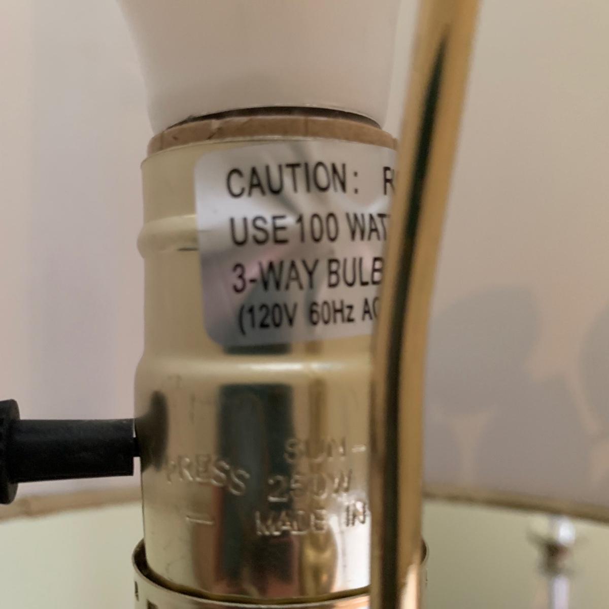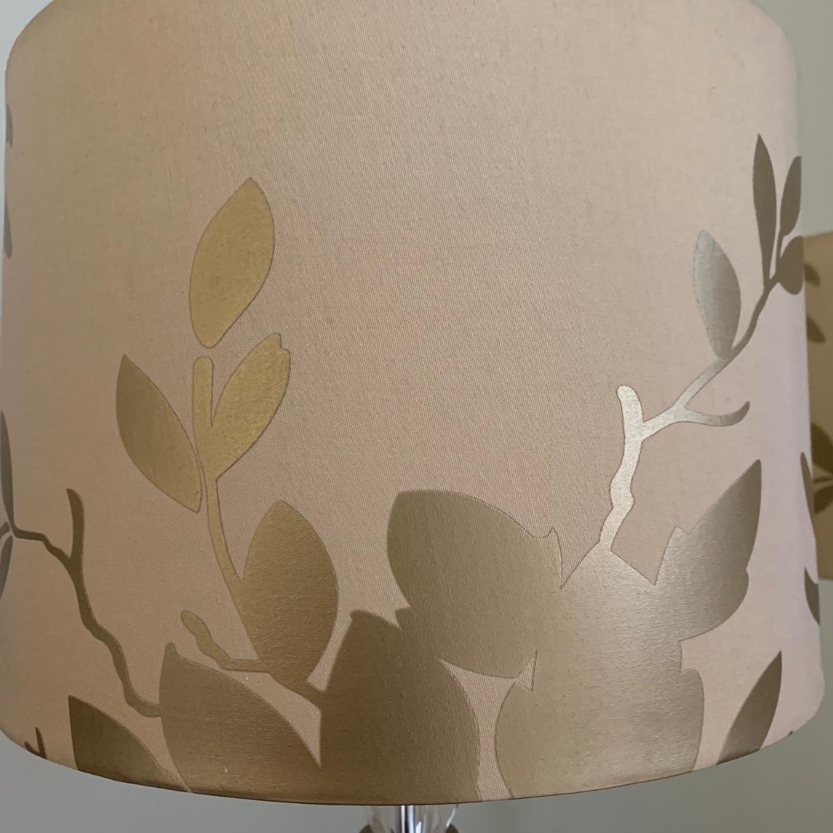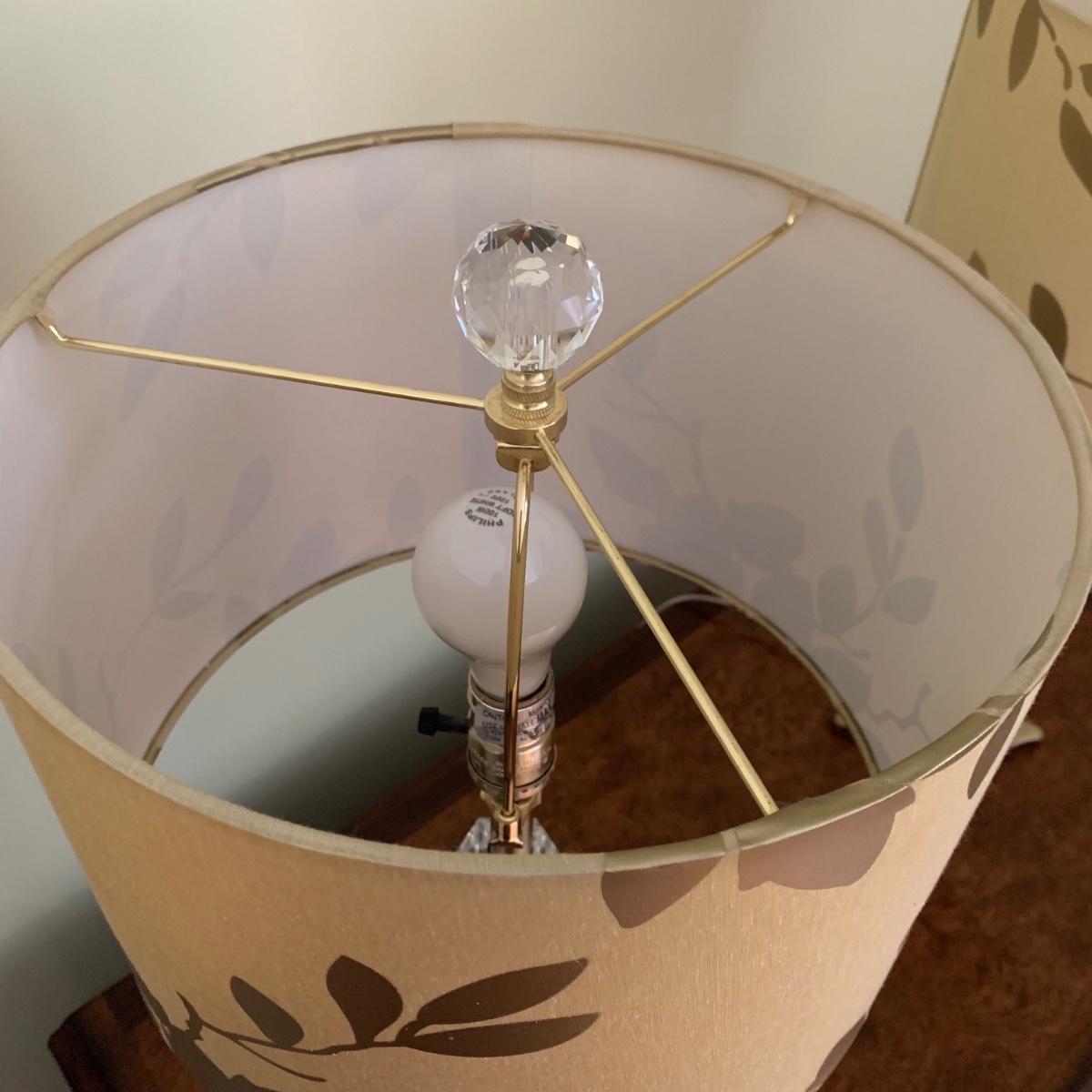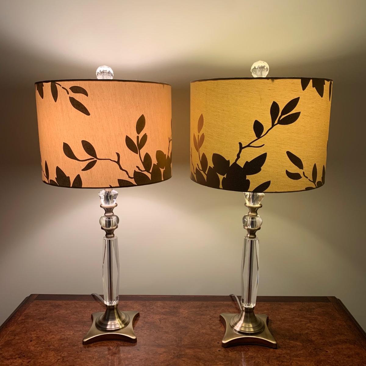 Two matching lamps with metal bases and acrylic bodies and finials. Shallow drum lampshades have a beige background with a metallic golden plant design. Lamps are 27.5”H and shades are 12.5”D. Both lamps powered on when plugged in. Sticker indicates that they have a three-way bulb capacity.