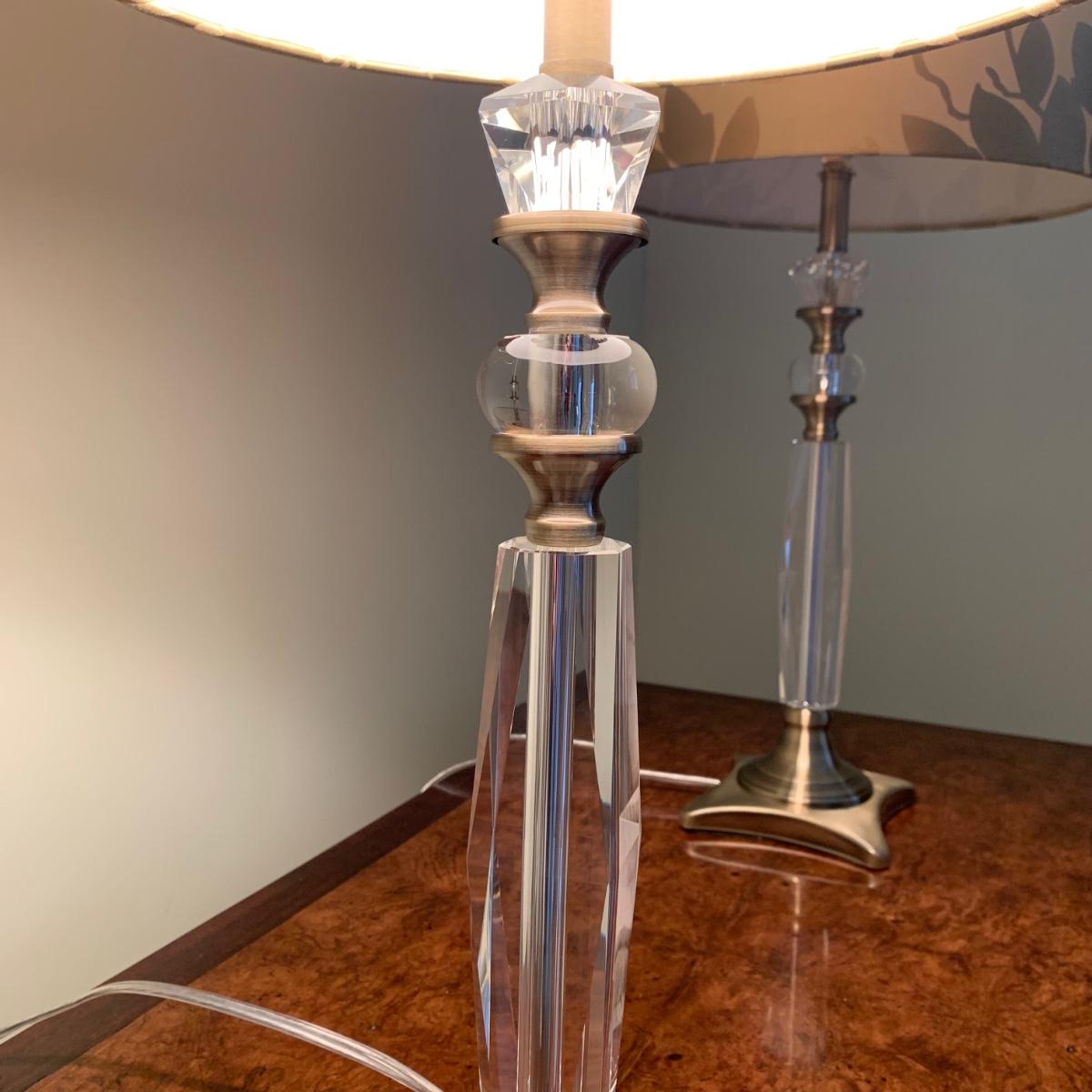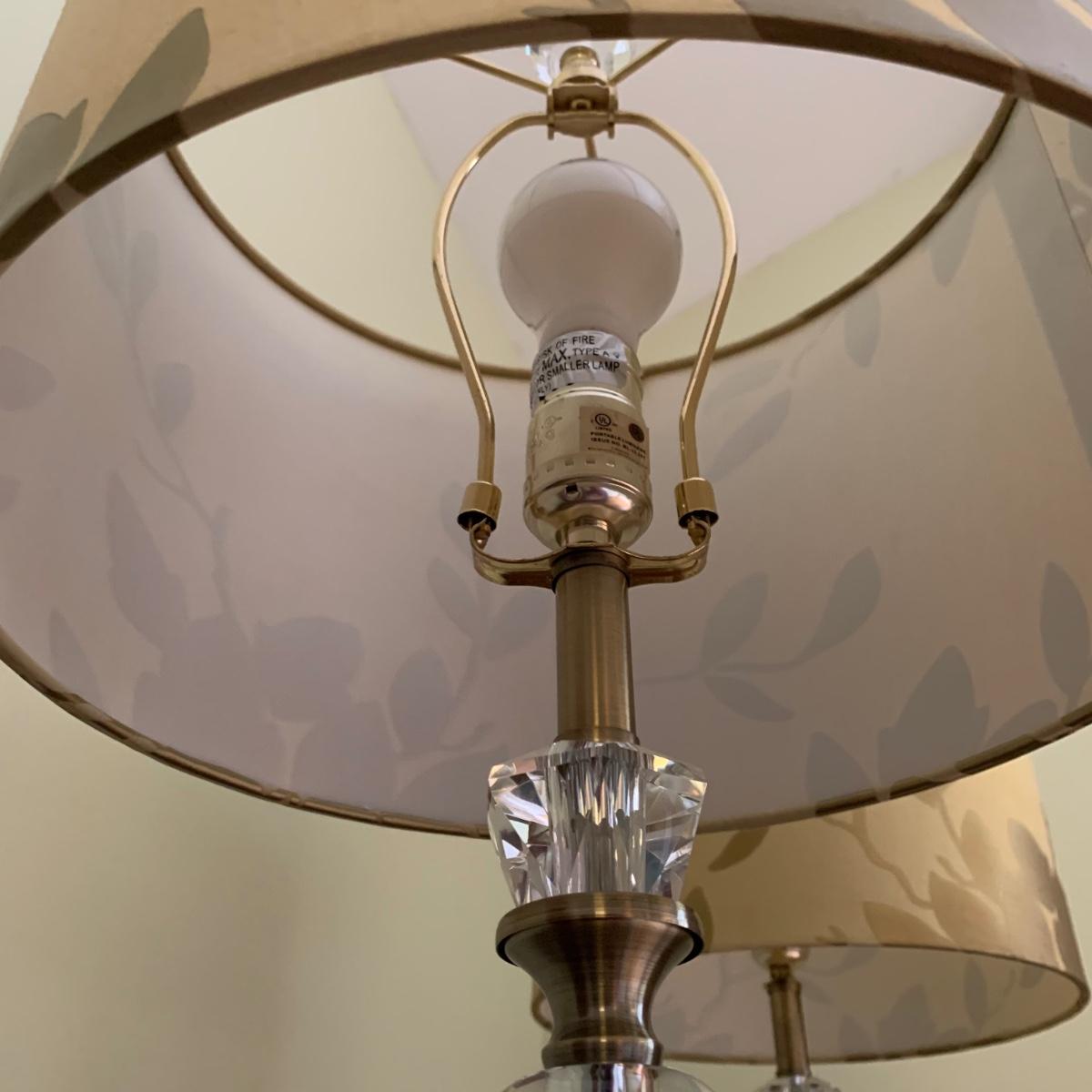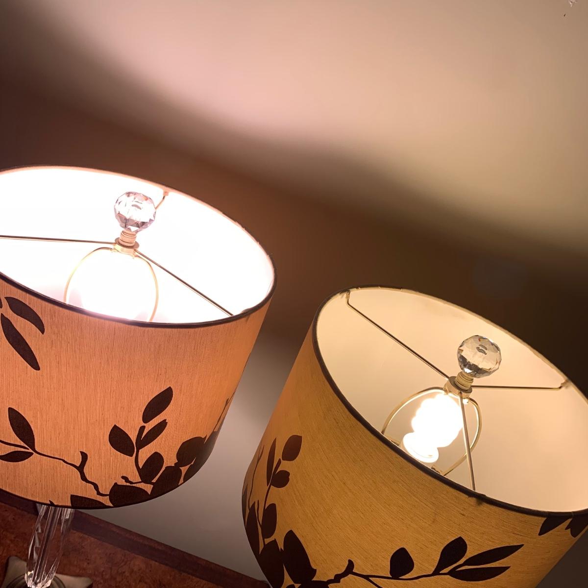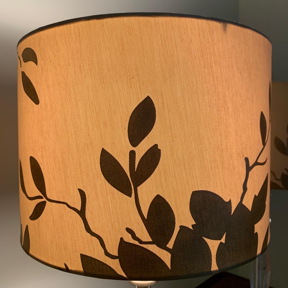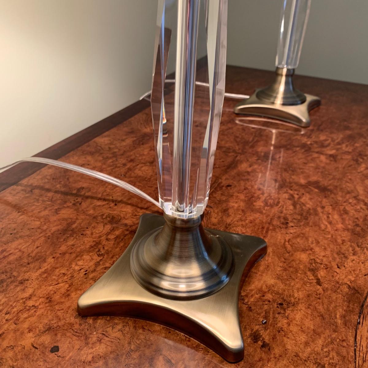 Two matching lamps with metal bases and acrylic bodies and finials. Shallow drum lampshades have a beige background with a metallic golden plant design. Lamps are 27.5”H and shades are 12.5”D. Both lamps powered on when plugged in. Sticker indicates that they have a three-way bulb capacity.