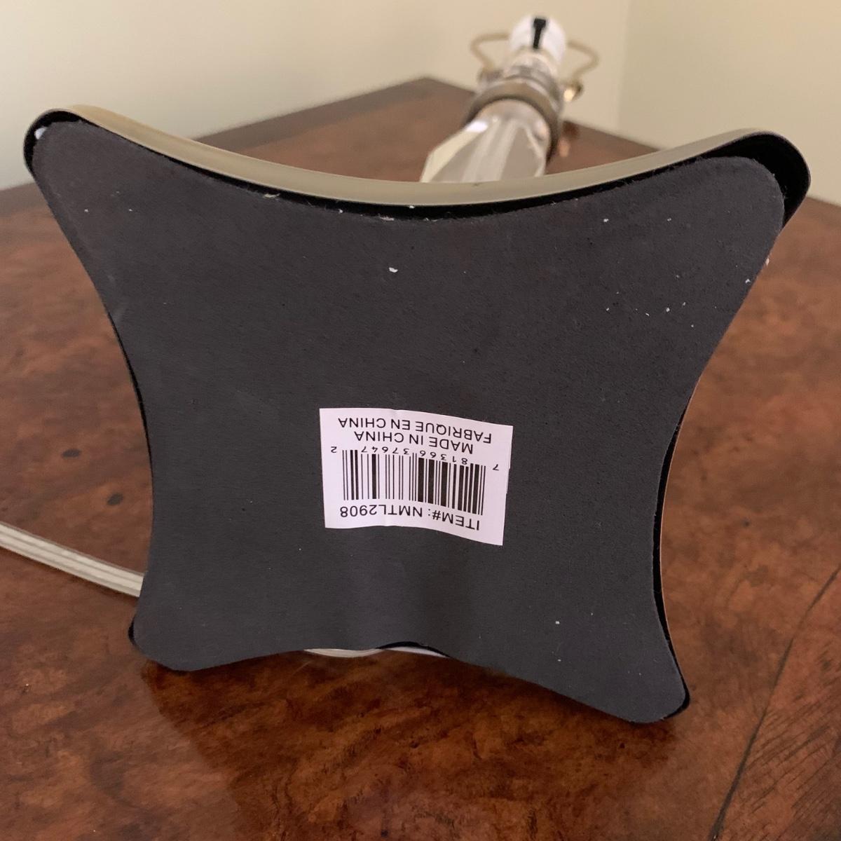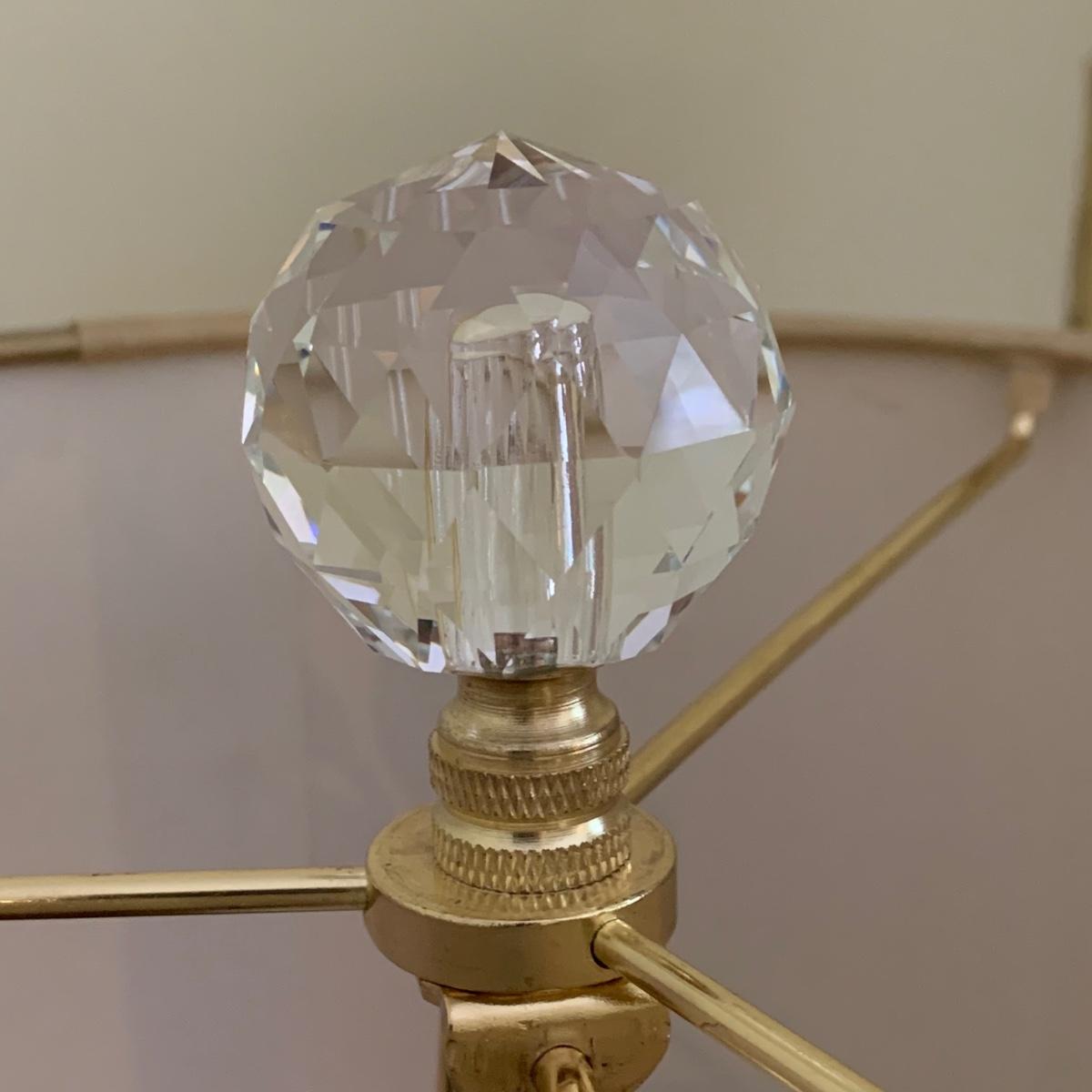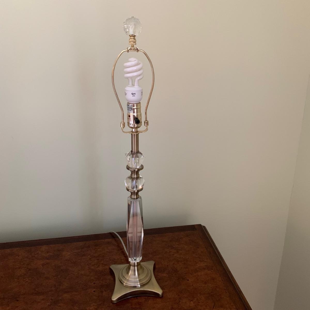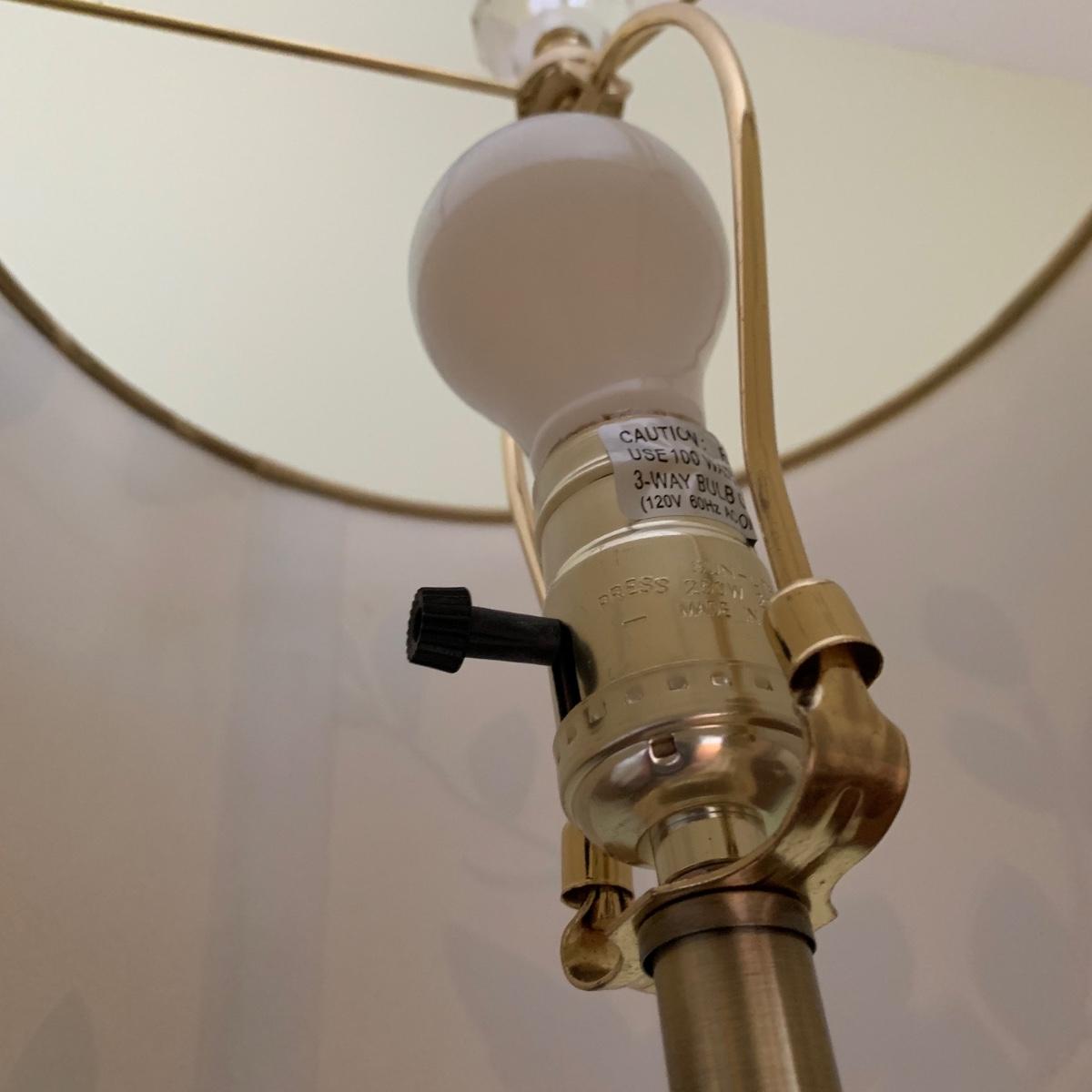Two matching lamps with metal bases and acrylic bodies and finials. Shallow drum lampshades have a beige background with a metallic golden plant design. Lamps are 27.5”H and shades are 12.5”D. Both lamps powered on when plugged in. Sticker indicates that they have a three-way bulb capacity.