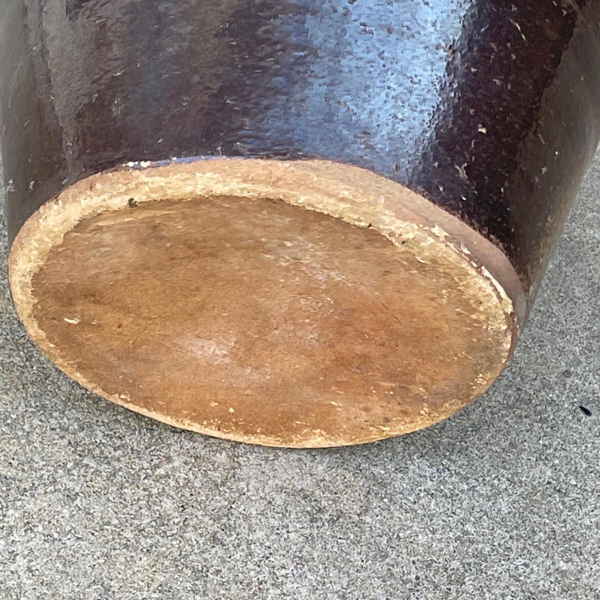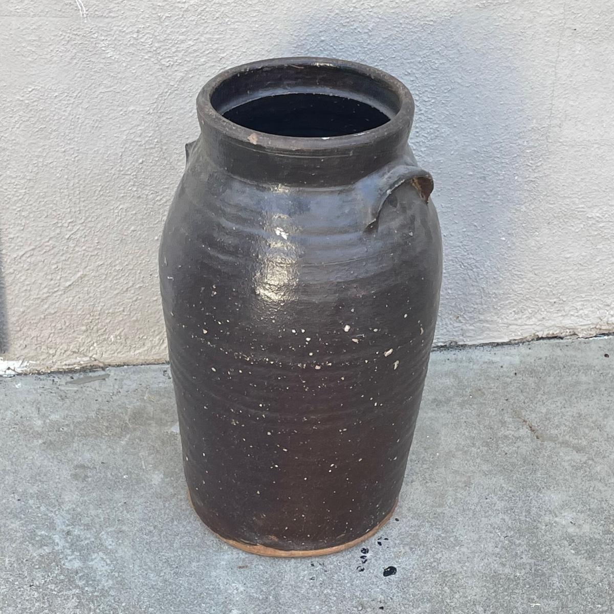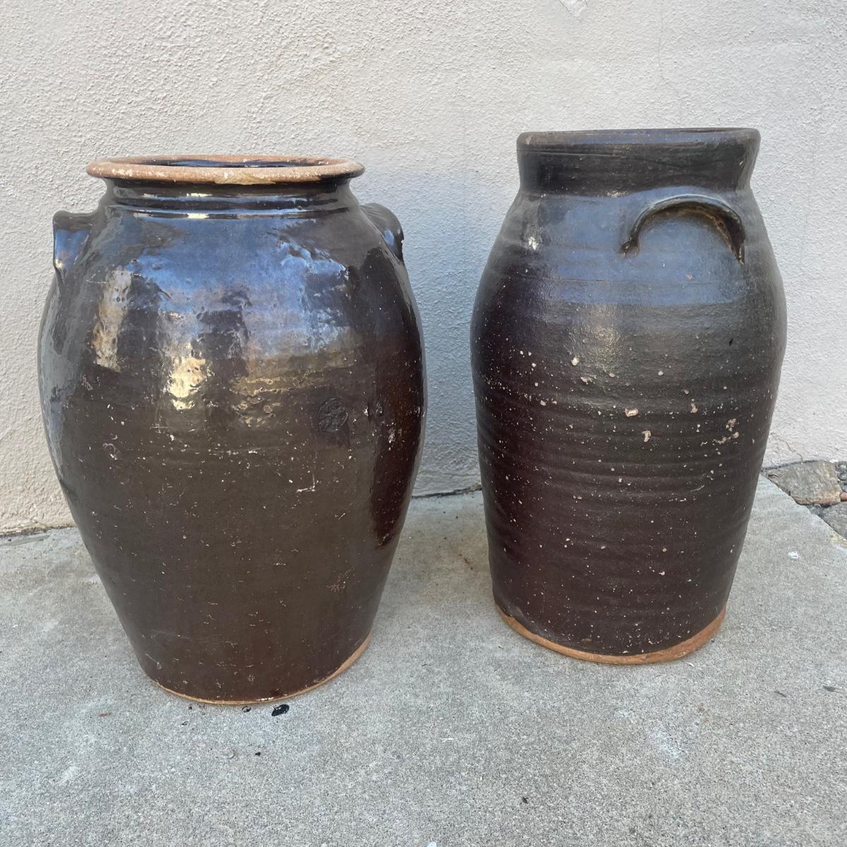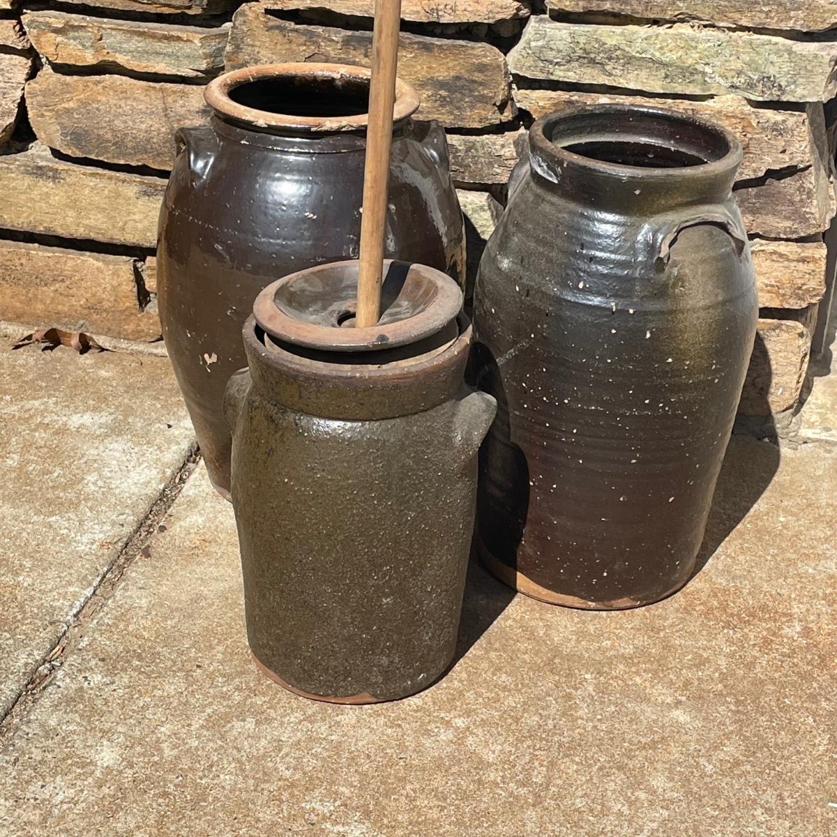 Two large stoneware pots with brown glaze and handles and a smaller one with its original butter churn parts intact. The lesser bellied larger pot appears to have been a butter churn also, but has no top. All have handles, the slightly taller pot measures 8” d x 18” tall and does have one broken handle. The other larger one has a few chips in the rim, see images.