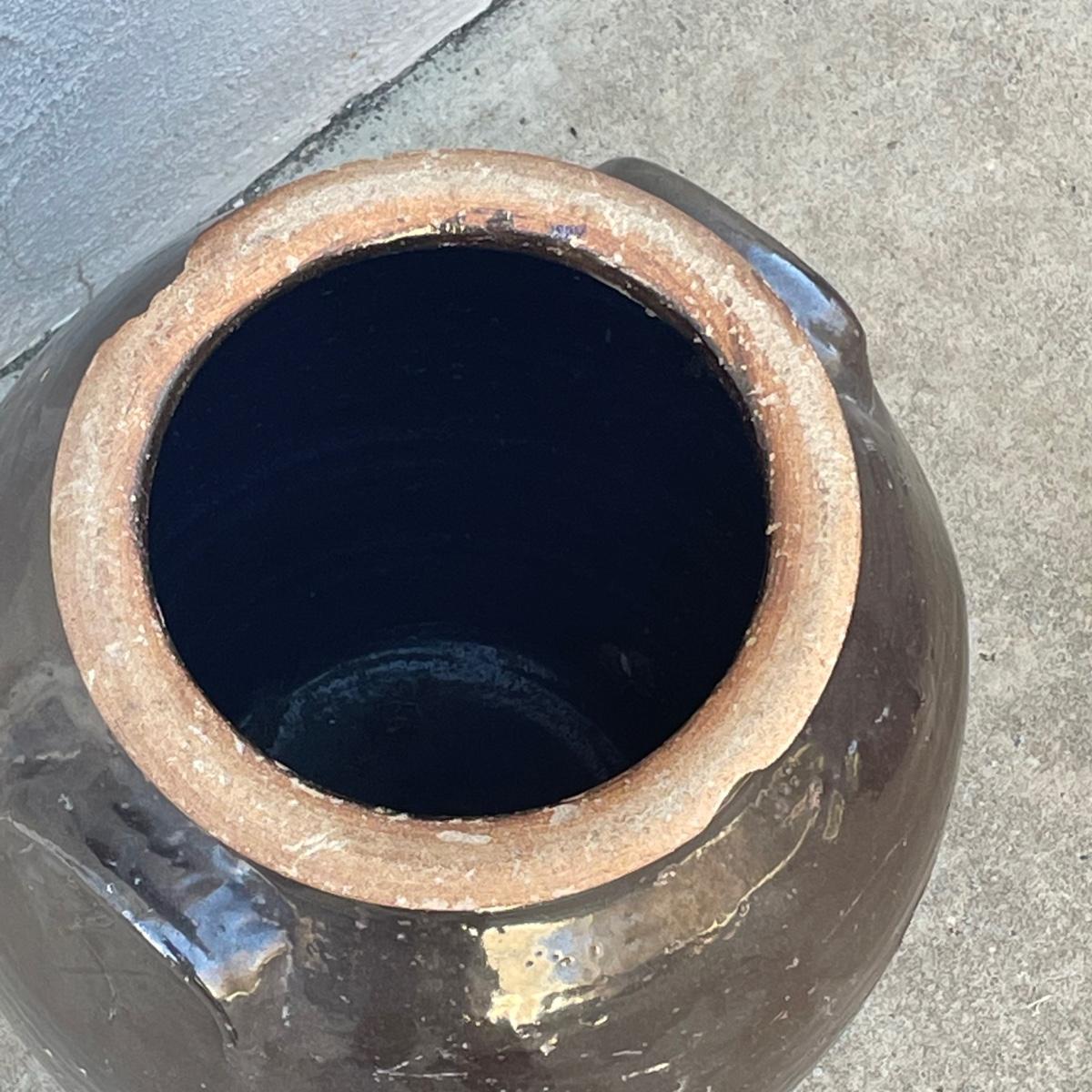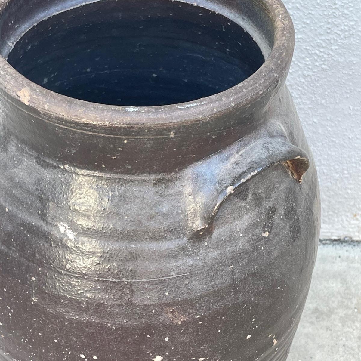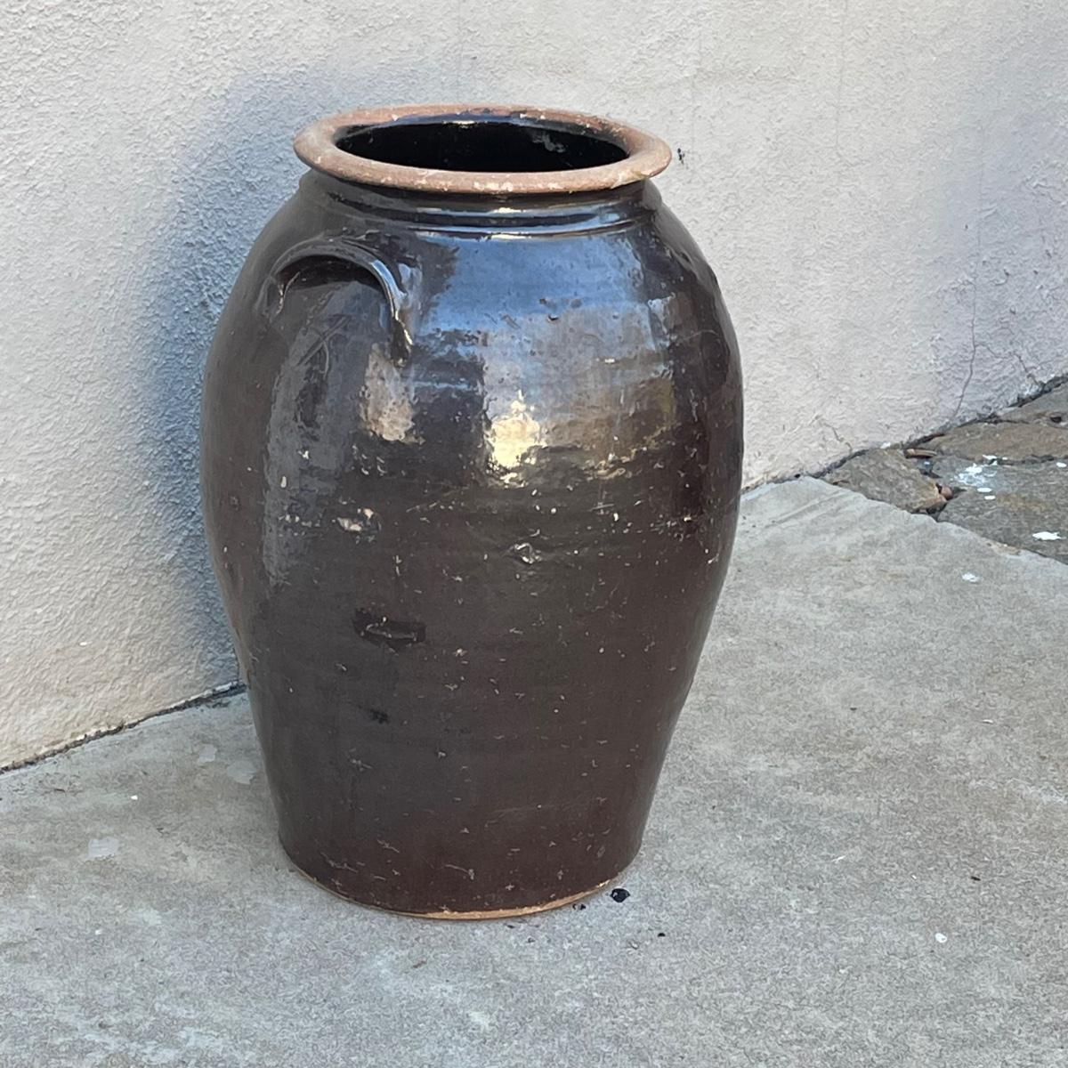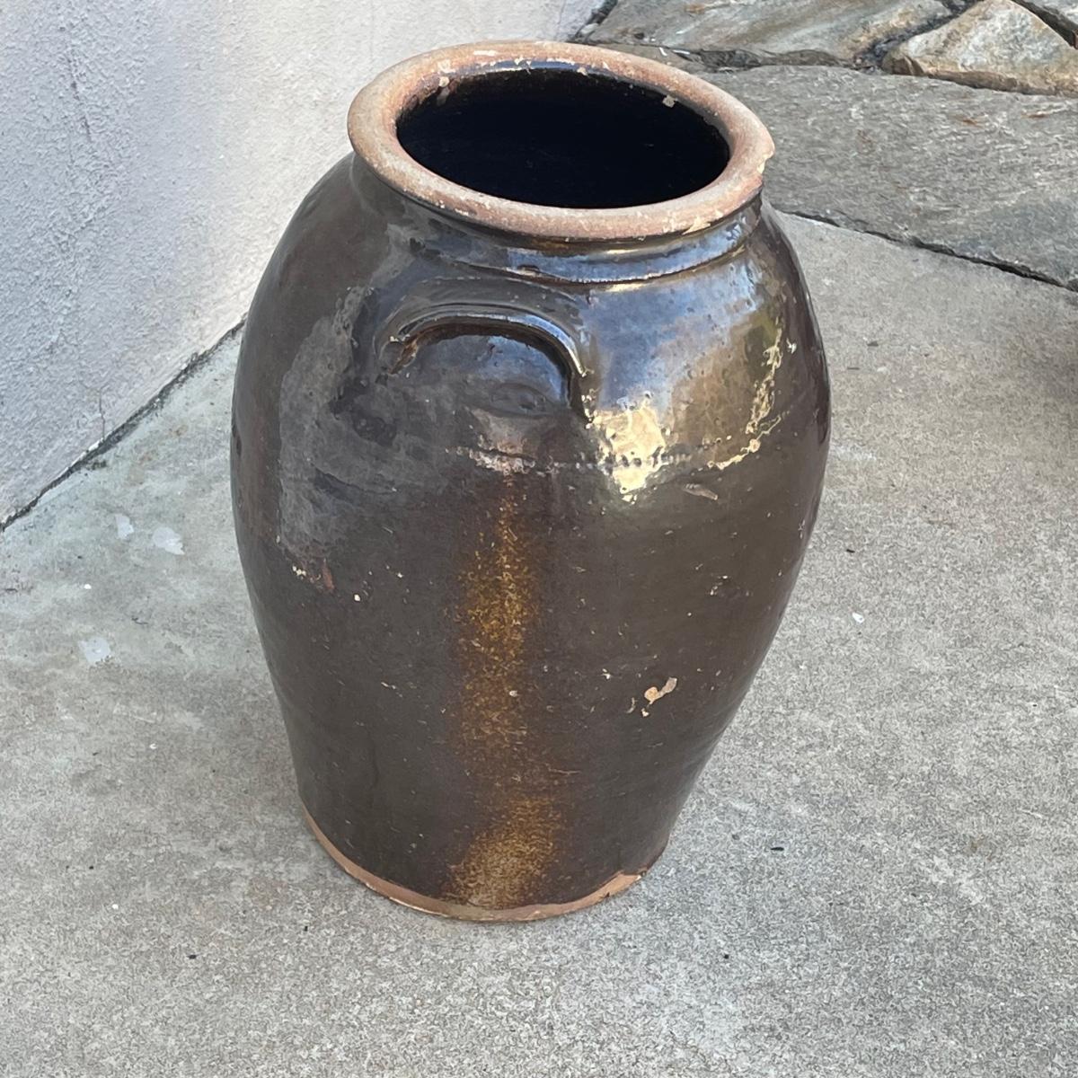 Two large stoneware pots with brown glaze and handles and a smaller one with its original butter churn parts intact. The lesser bellied larger pot appears to have been a butter churn also, but has no top. All have handles, the slightly taller pot measures 8” d x 18” tall and does have one broken handle. The other larger one has a few chips in the rim, see images.