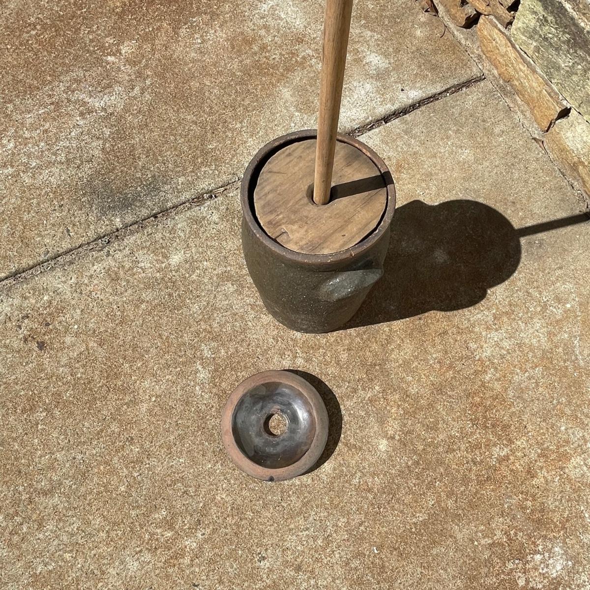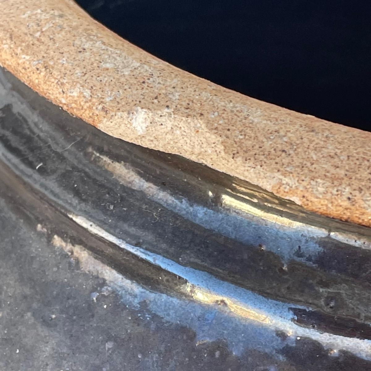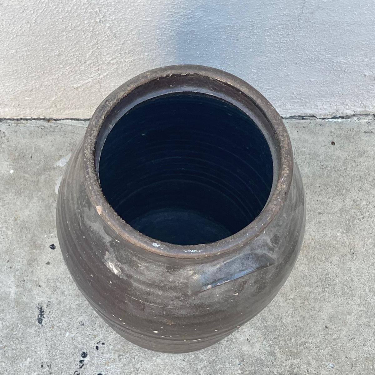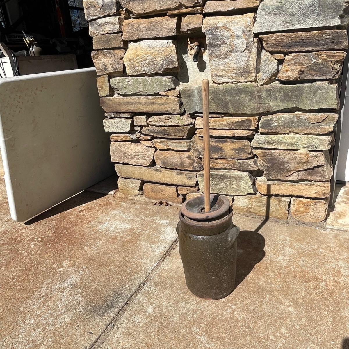 Two large stoneware pots with brown glaze and handles and a smaller one with its original butter churn parts intact. The lesser bellied larger pot appears to have been a butter churn also, but has no top. All have handles, the slightly taller pot measures 8” d x 18” tall and does have one broken handle. The other larger one has a few chips in the rim, see images.