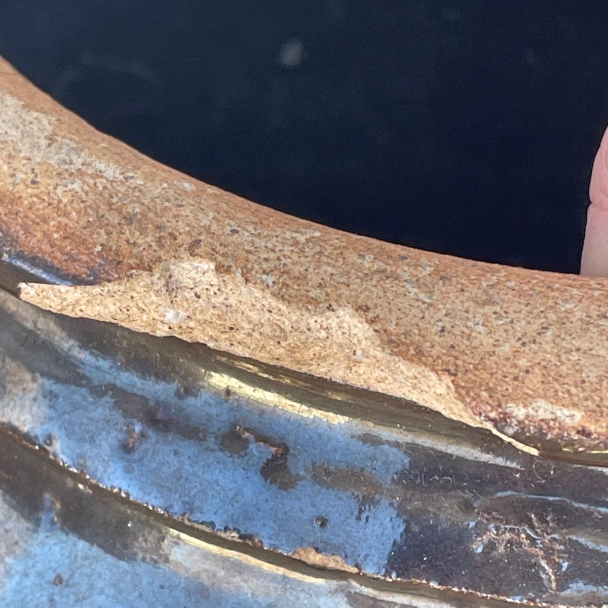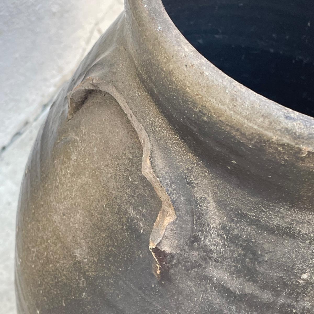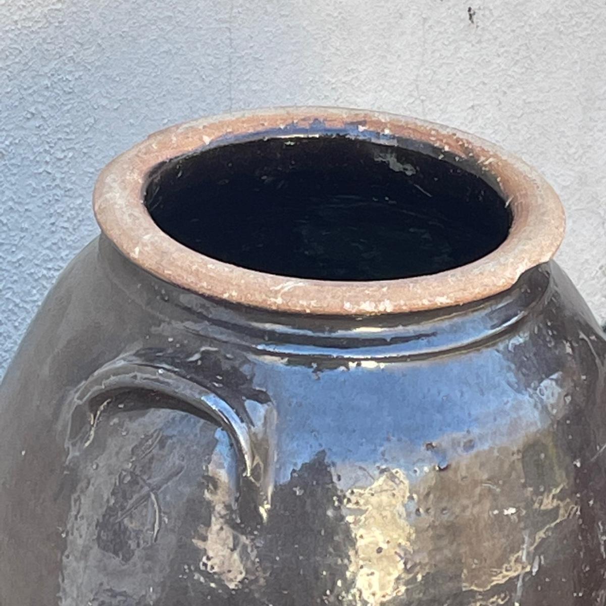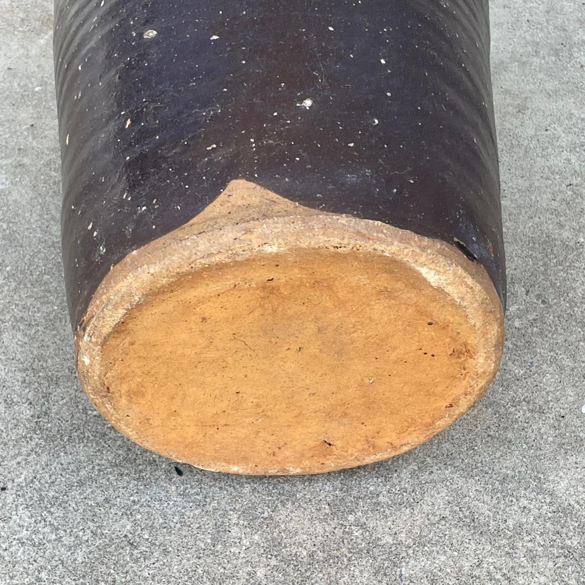 Two large stoneware pots with brown glaze and handles and a smaller one with its original butter churn parts intact. The lesser bellied larger pot appears to have been a butter churn also, but has no top. All have handles, the slightly taller pot measures 8” d x 18” tall and does have one broken handle. The other larger one has a few chips in the rim, see images.