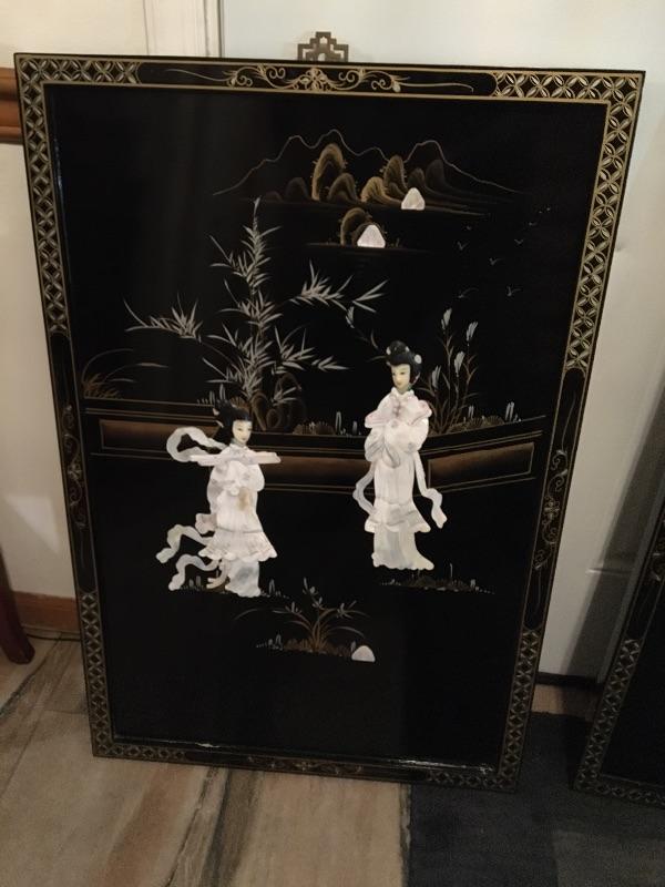 Pair of Large Asian Black Lacquer Wall Hangings with MOP Art 24” x 36” each. LOT A37