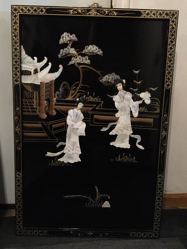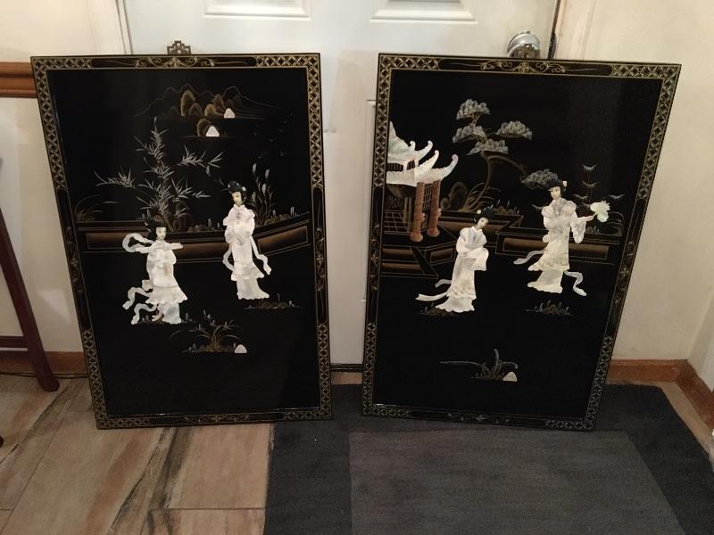 Pair of Large Asian Black Lacquer Wall Hangings with MOP Art 24” x 36” each.