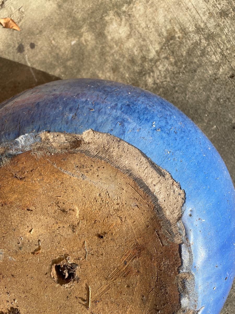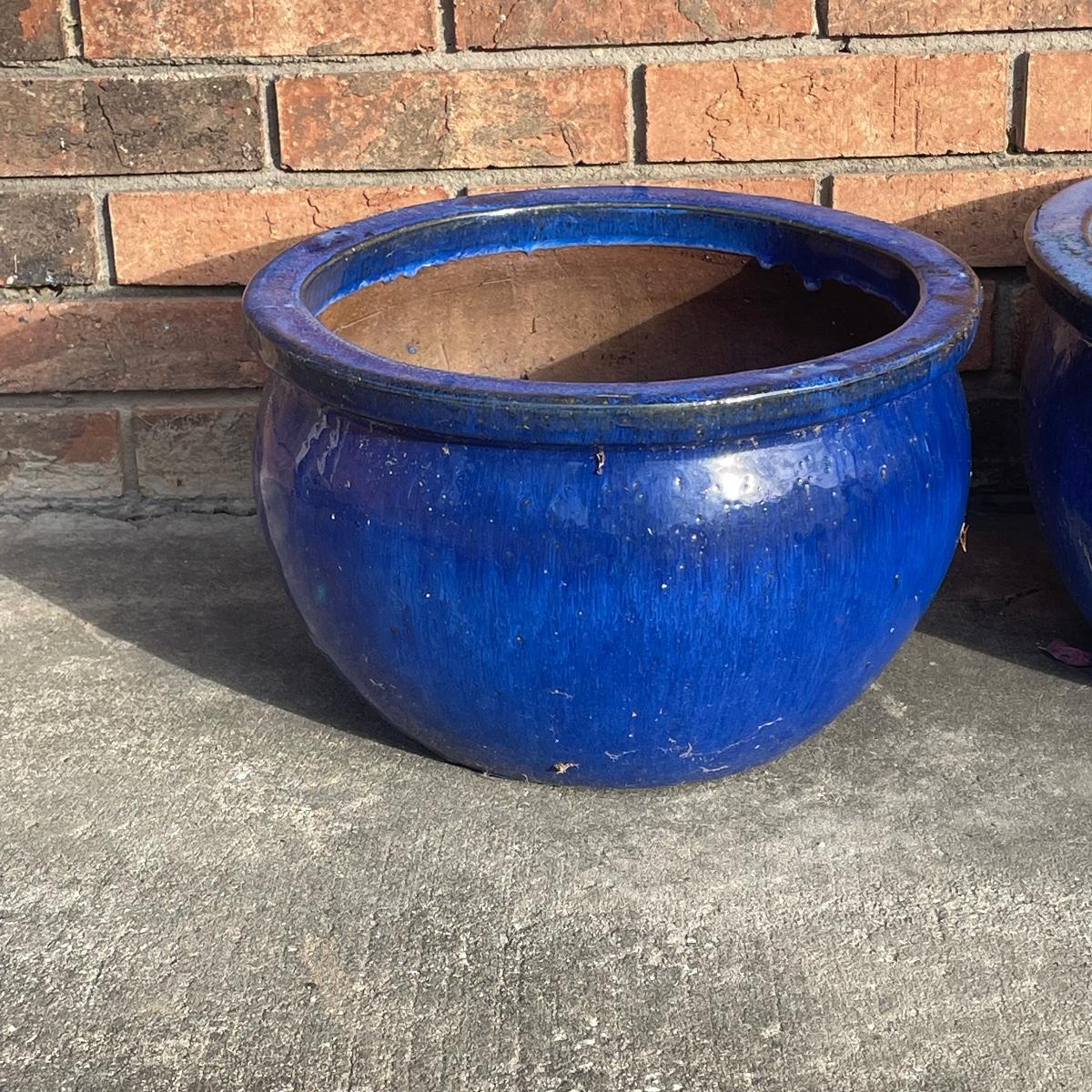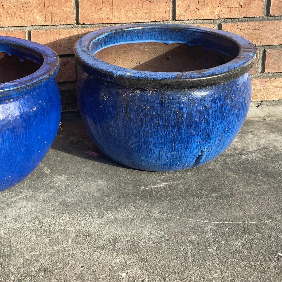 Identical in shape and size but with a slight variation in the shade of blue, one being lighter than the true cobalt blue planter. The lighter blue one has a chip on the underside not visible when it’s upright. Both are ceramic.