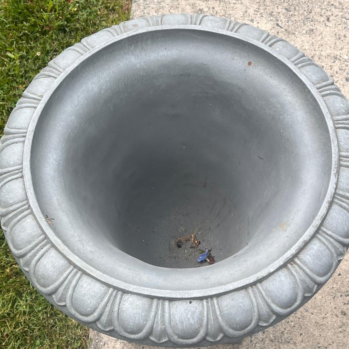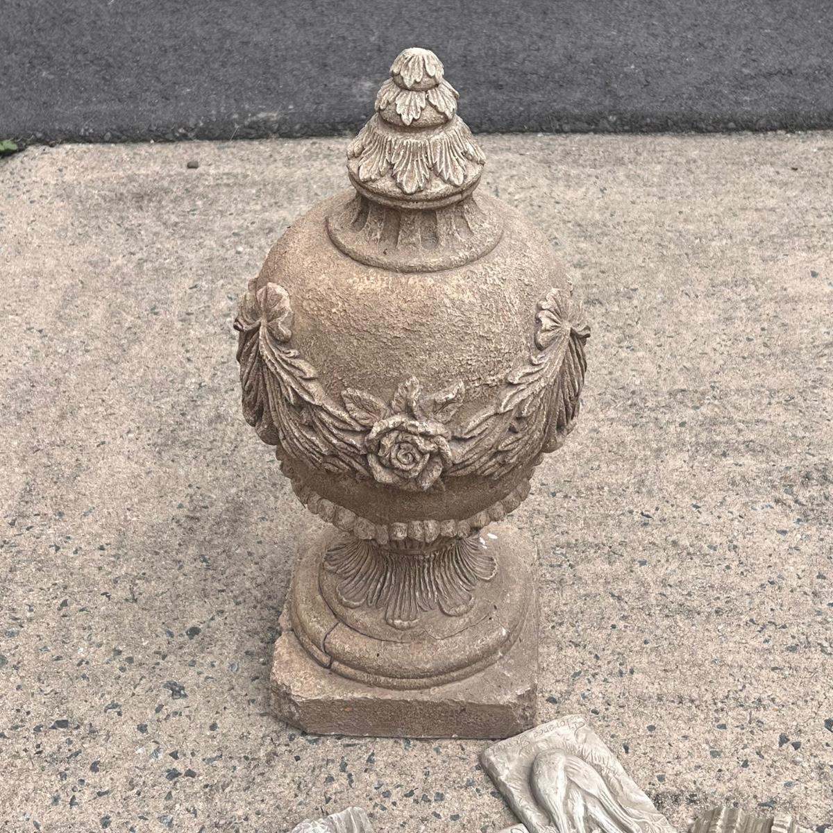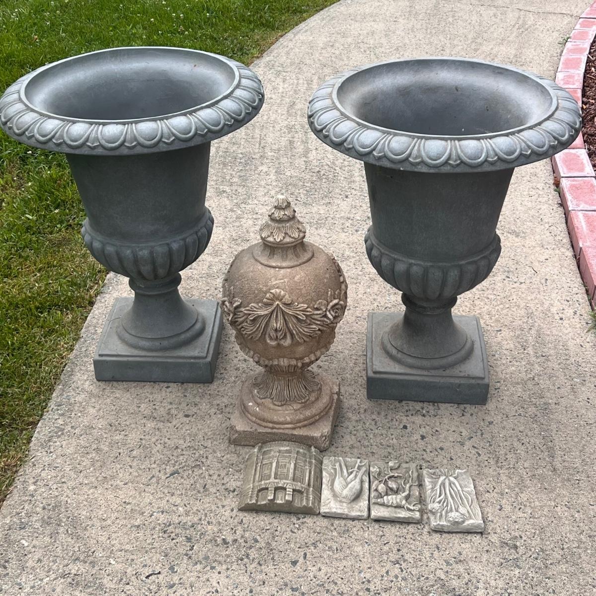 These two matching planters have the classic urn shape and pedestal bases. They are lightweight, made from some sort of resin and measure 20”D (top) x 24”H. The decorative finial shaped piece is also made from a similar material but it also gives the appearance of being real stone; a few cracks and chips on its base, see pics. Lastly there are four faux stone hanging plaques.