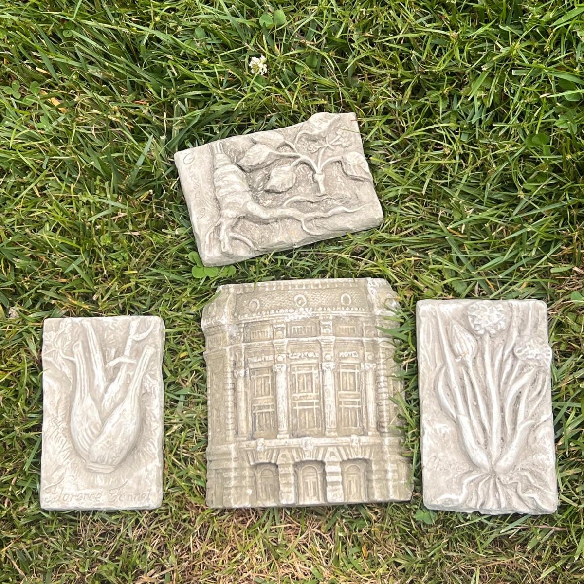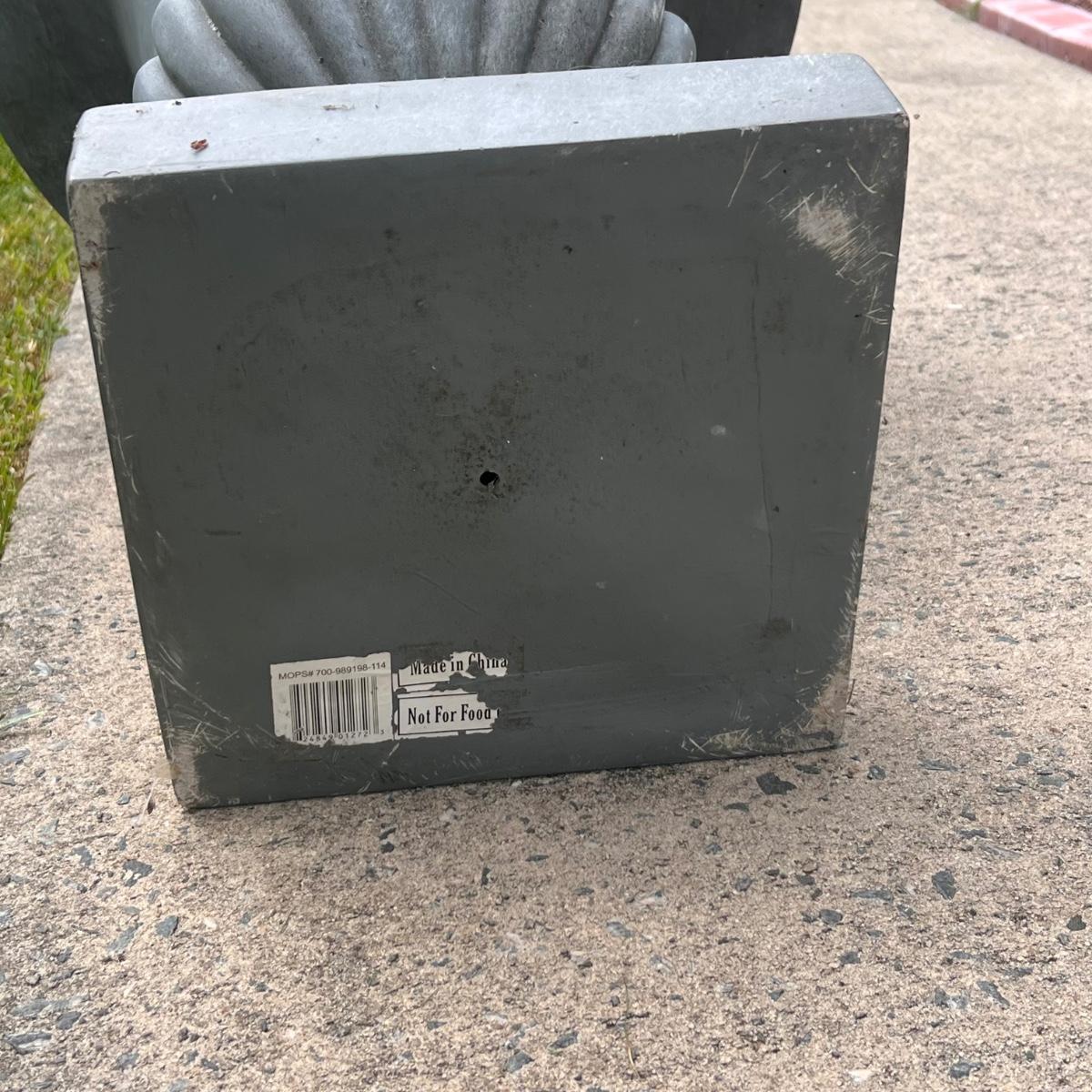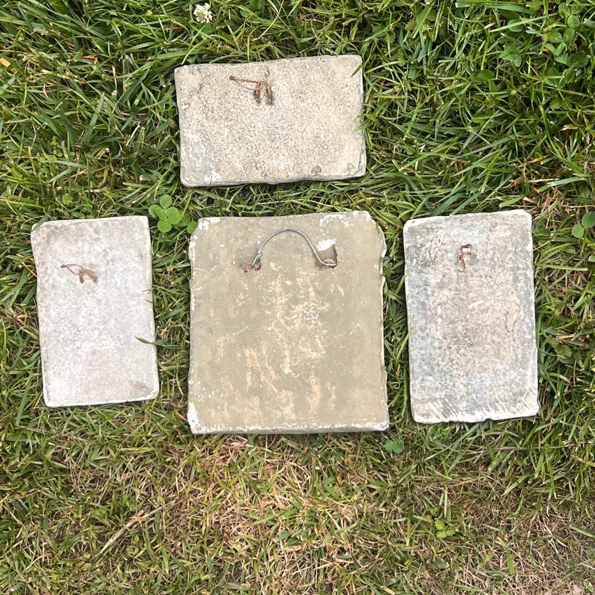 These two matching planters have the classic urn shape and pedestal bases. They are lightweight, made from some sort of resin and measure 20”D (top) x 24”H. The decorative finial shaped piece is also made from a similar material but it also gives the appearance of being real stone; a few cracks and chips on its base, see pics. Lastly there are four faux stone hanging plaques.