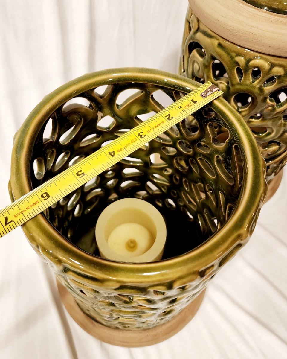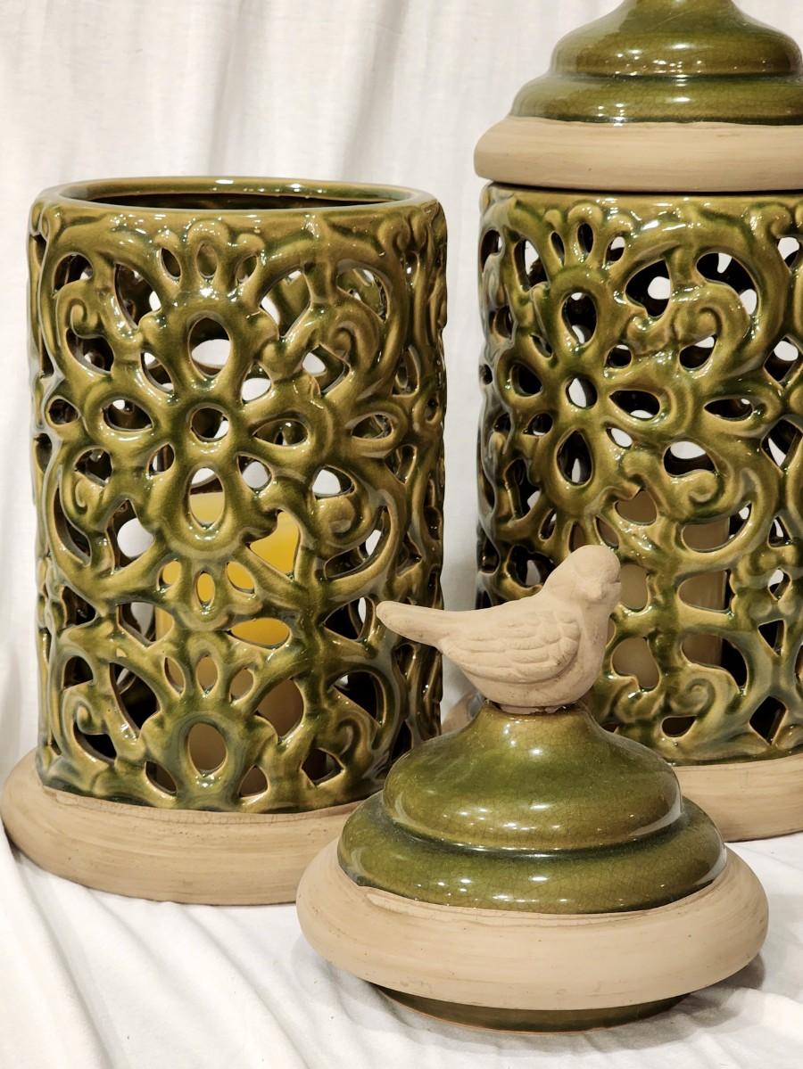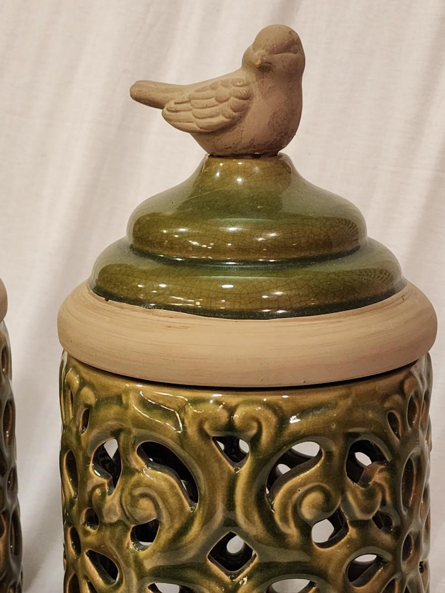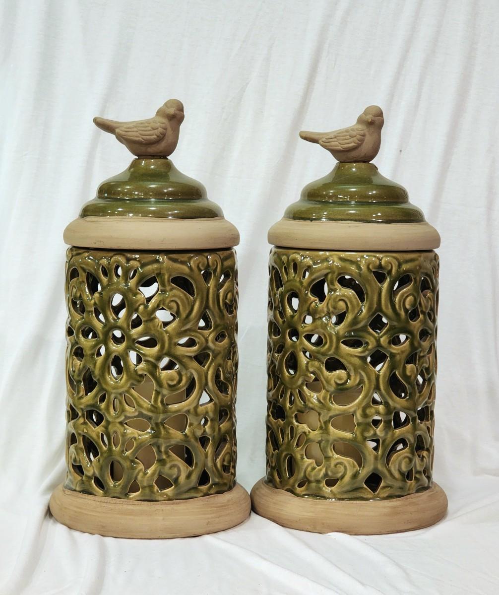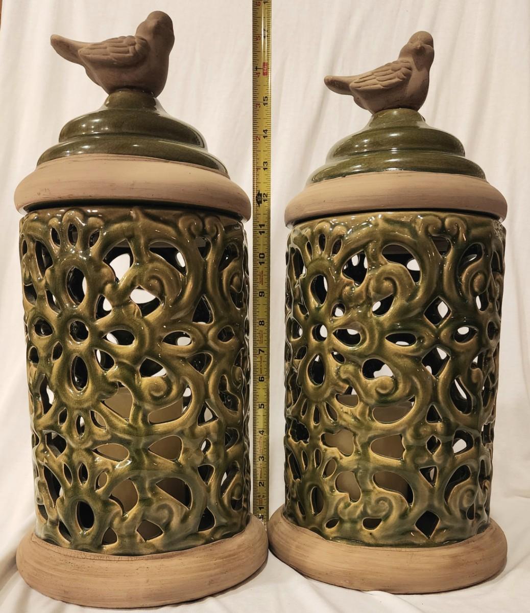 2 Large Bird Luminaria Jars - 18" tall x 6 1/2" wide. Each contains a battery powered (working) candle. The jars are beautiful avocado green over natural brown clay.
