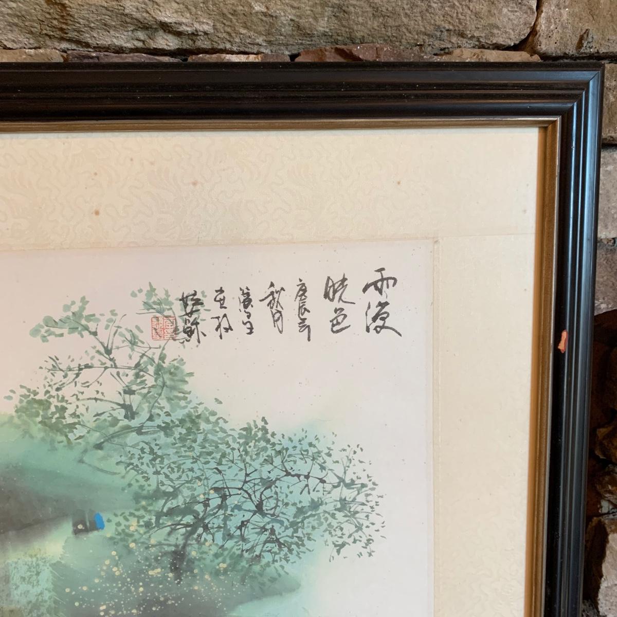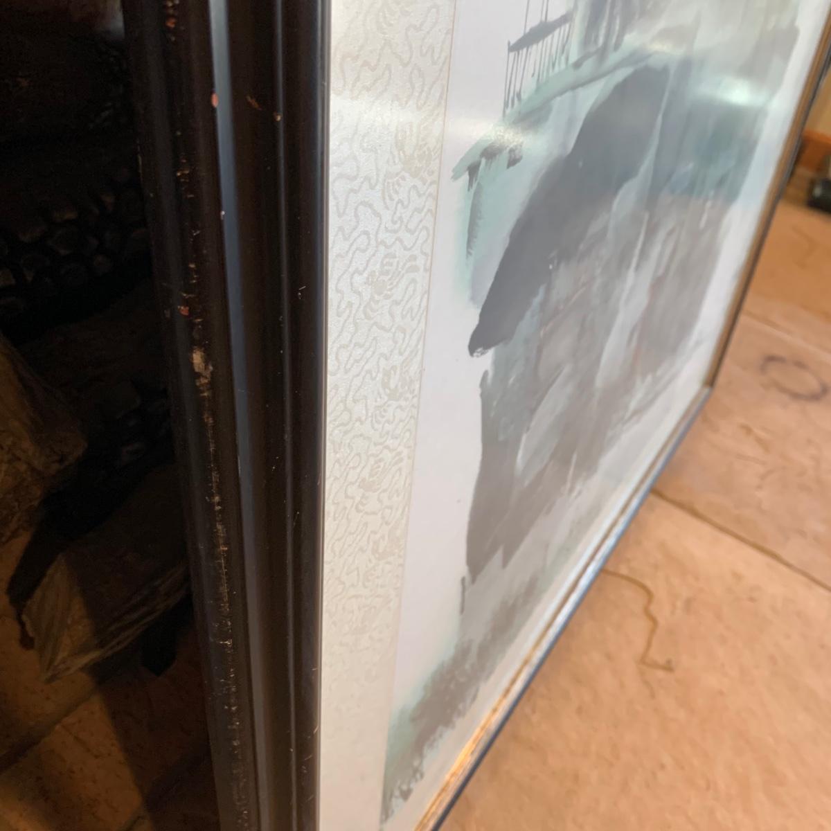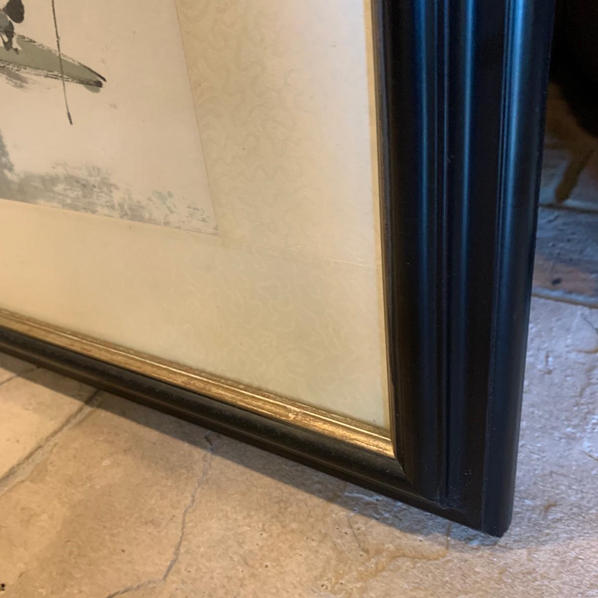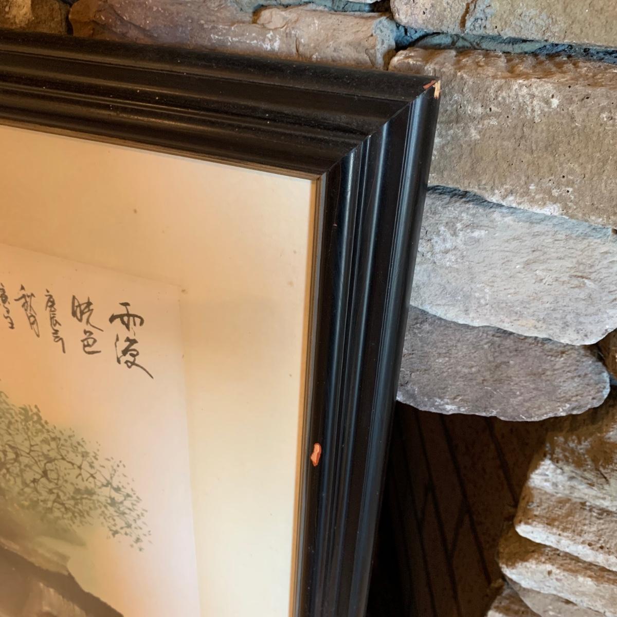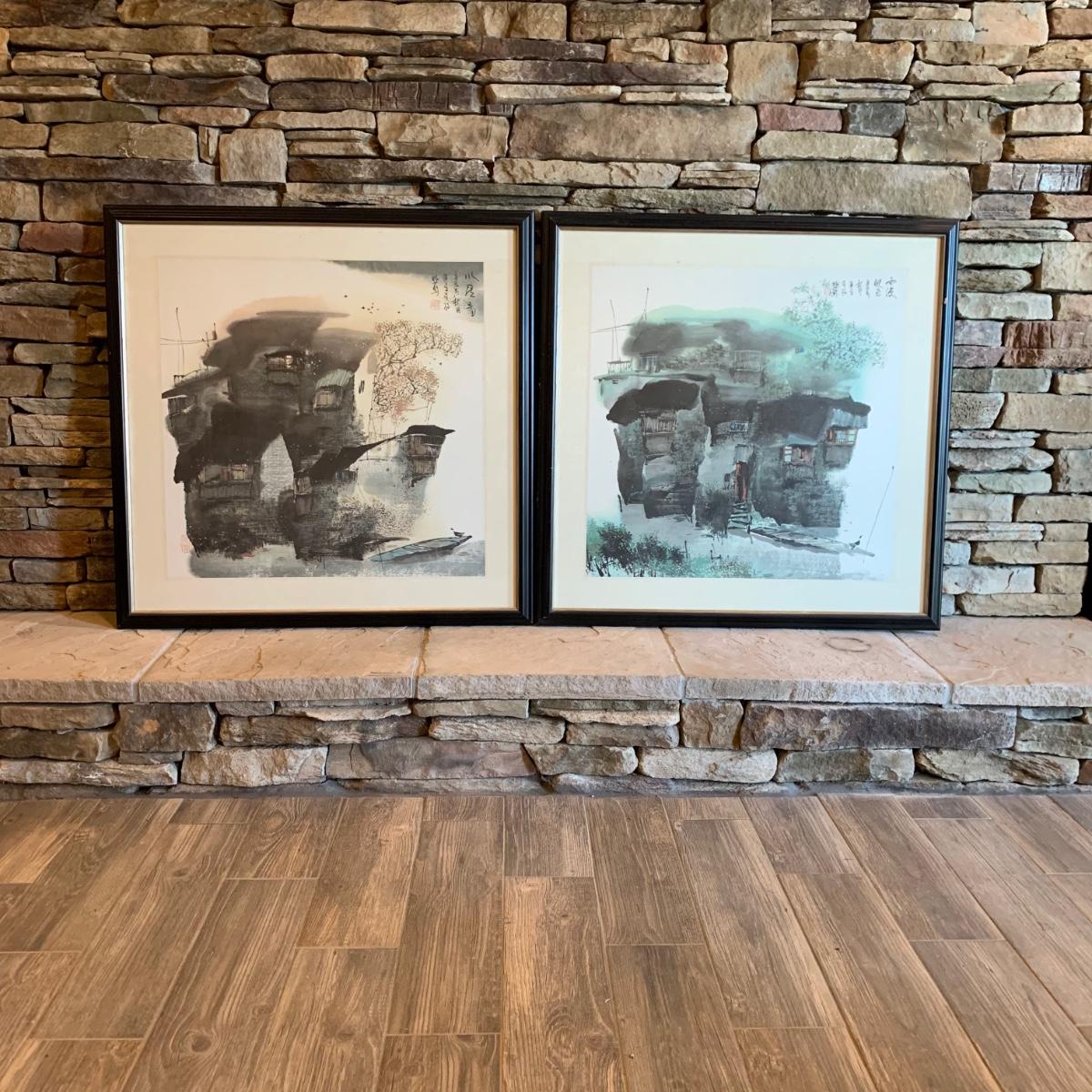 Two framed Asian paintings in black ink brush stroke style. They appear to be originals, and owner said they are but we can not verify. Both paintings have cream colored fabric matting and black colored wood frames. The frames measure 35” x 35”. The frames show some wear, and there appears to be moisture on the matting underneath the glass, see photos. Besides the blemishes on the frames and some dust on the glass, these both seem to be in good condition. They have glass fronts and wood backings and are quite heavy.