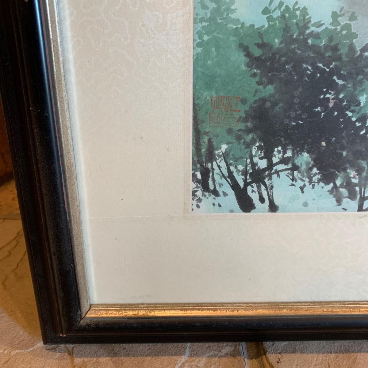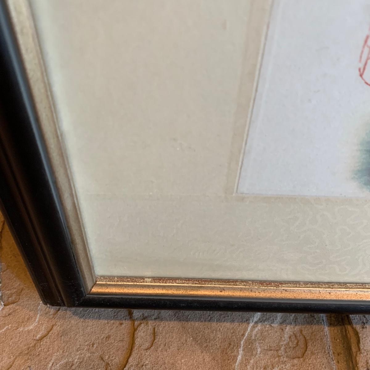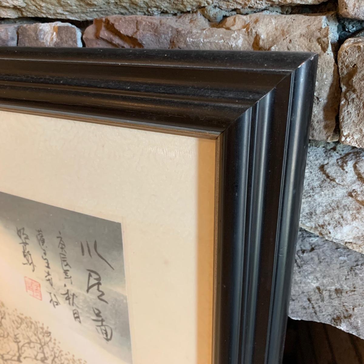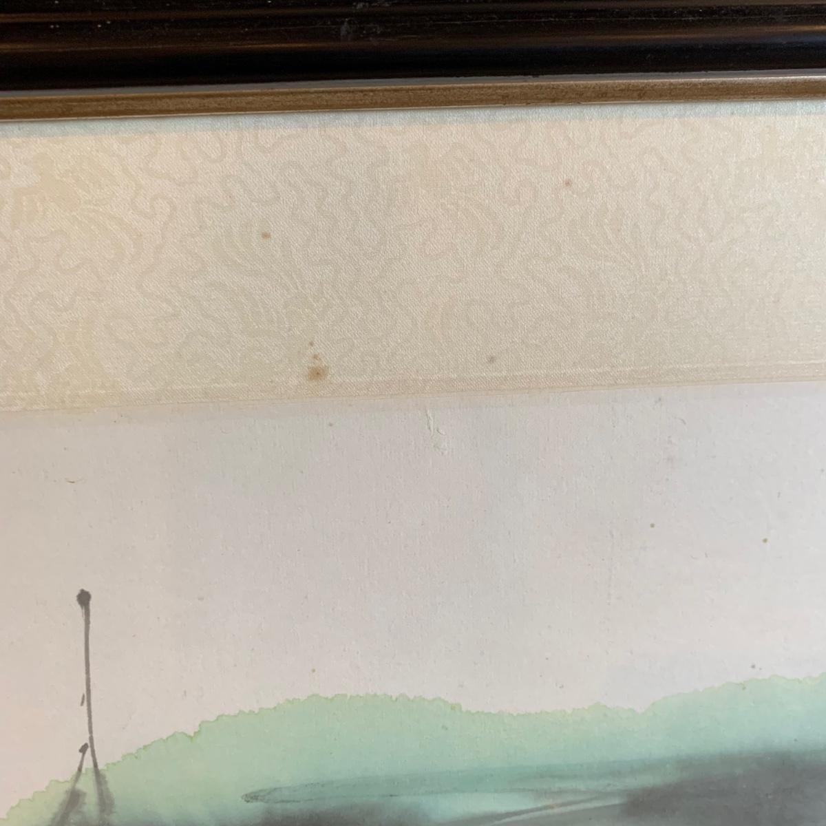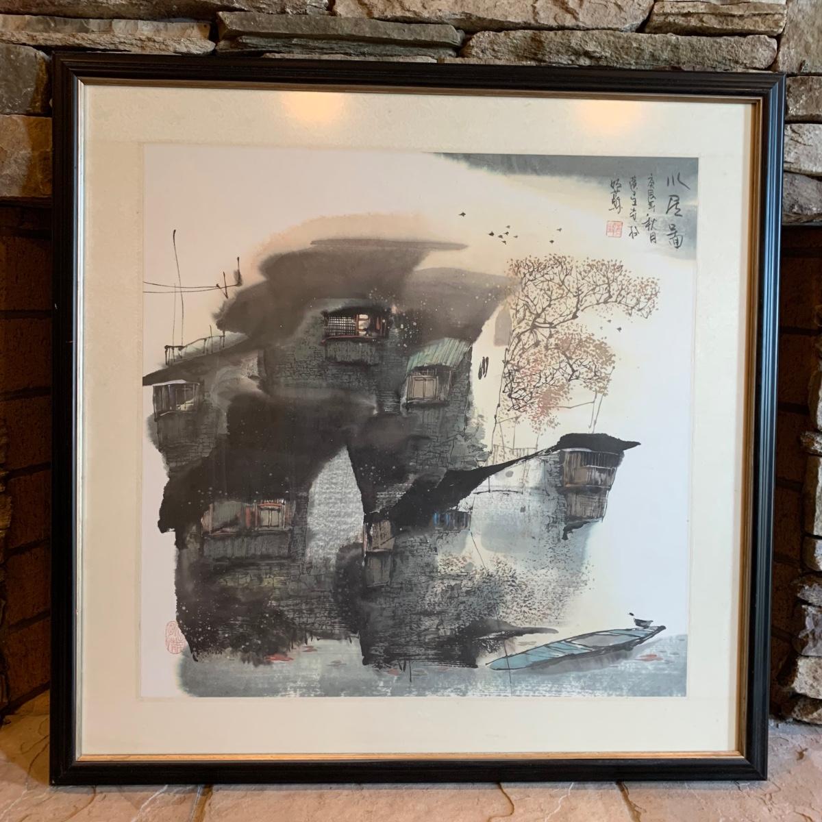 Two framed Asian paintings in black ink brush stroke style. They appear to be originals, and owner said they are but we can not verify. Both paintings have cream colored fabric matting and black colored wood frames. The frames measure 35” x 35”. The frames show some wear, and there appears to be moisture on the matting underneath the glass, see photos. Besides the blemishes on the frames and some dust on the glass, these both seem to be in good condition. They have glass fronts and wood backings and are quite heavy.