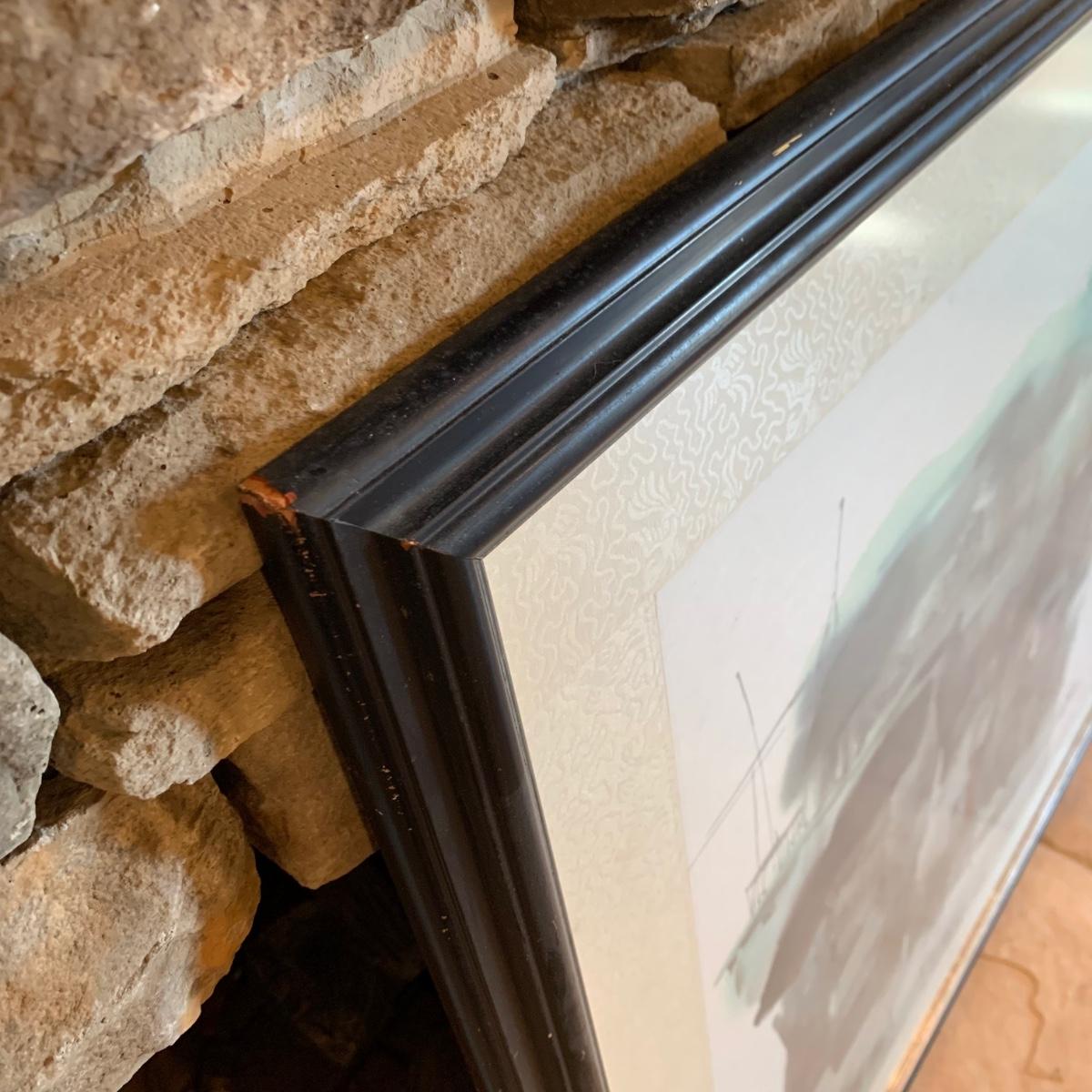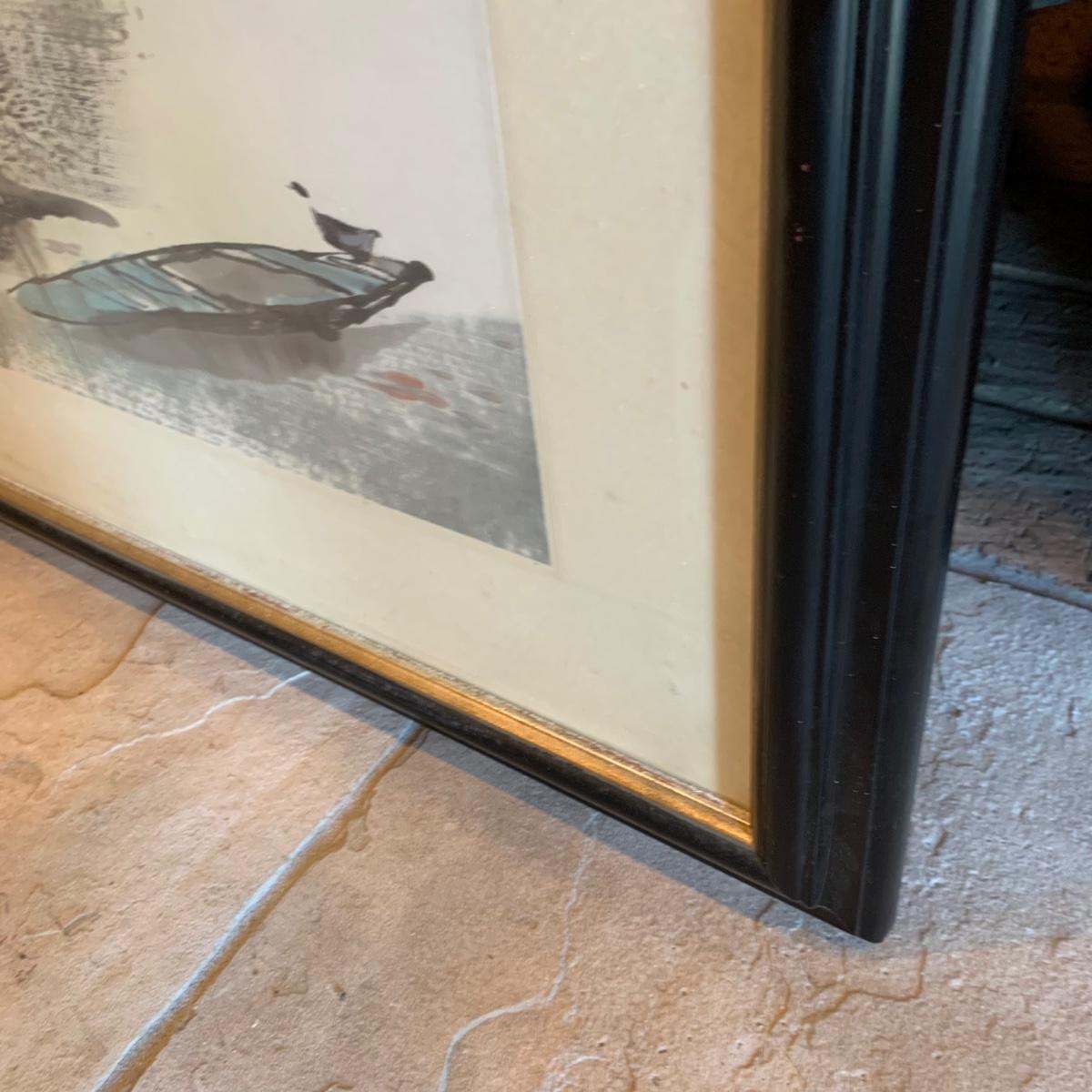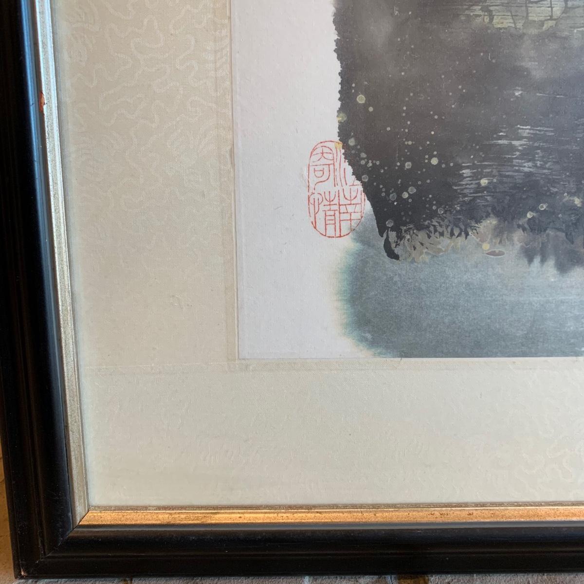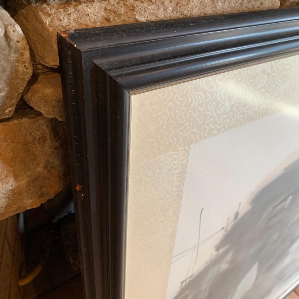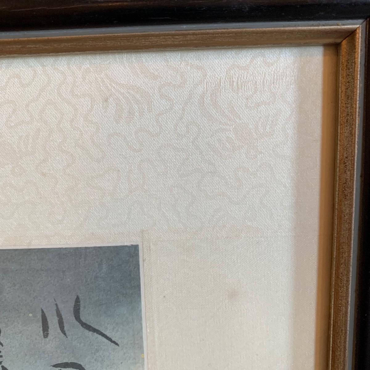 Two framed Asian paintings in black ink brush stroke style. They appear to be originals, and owner said they are but we can not verify. Both paintings have cream colored fabric matting and black colored wood frames. The frames measure 35” x 35”. The frames show some wear, and there appears to be moisture on the matting underneath the glass, see photos. Besides the blemishes on the frames and some dust on the glass, these both seem to be in good condition. They have glass fronts and wood backings and are quite heavy.