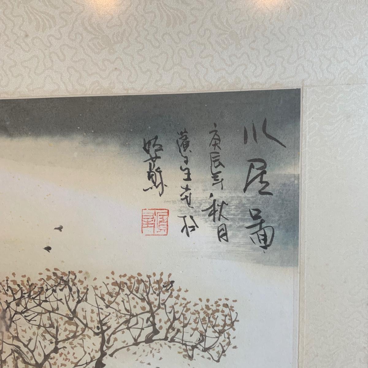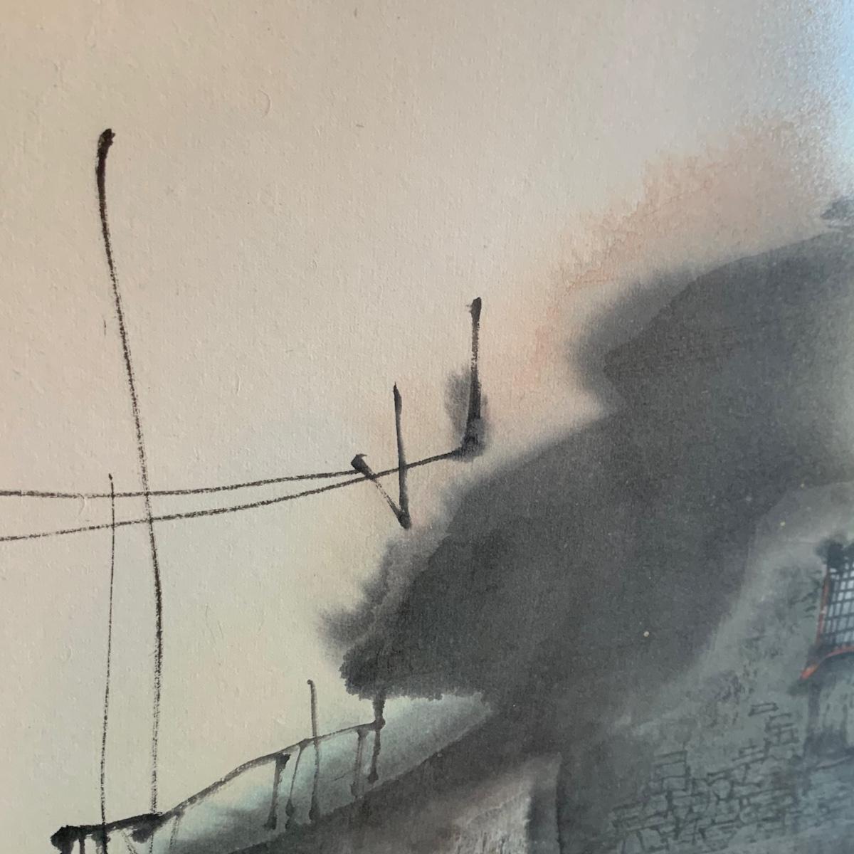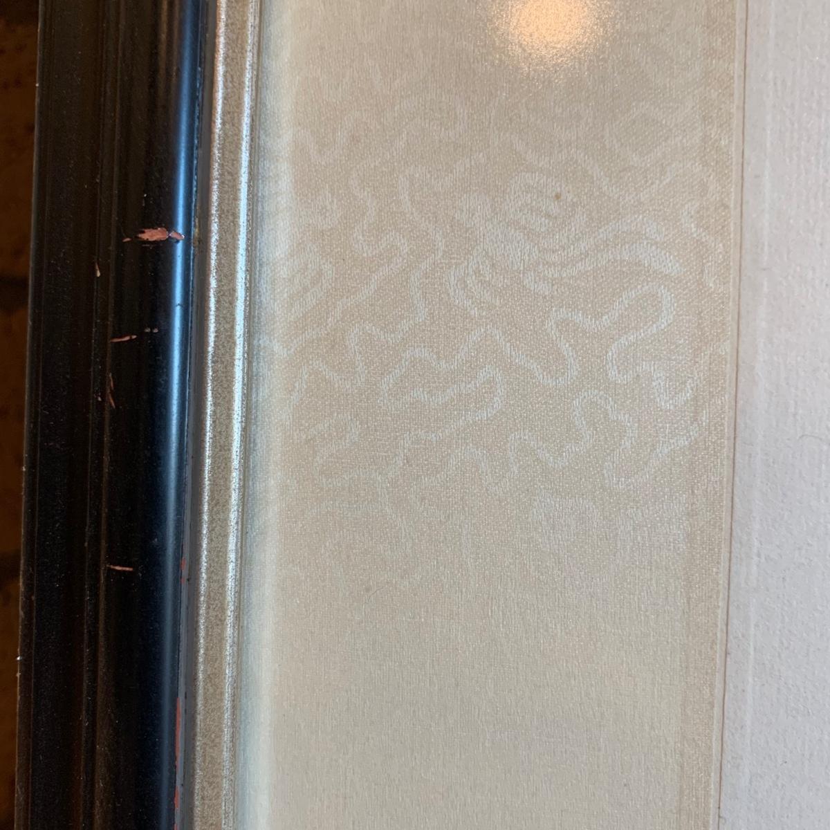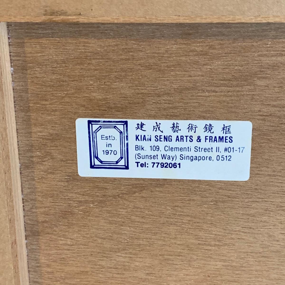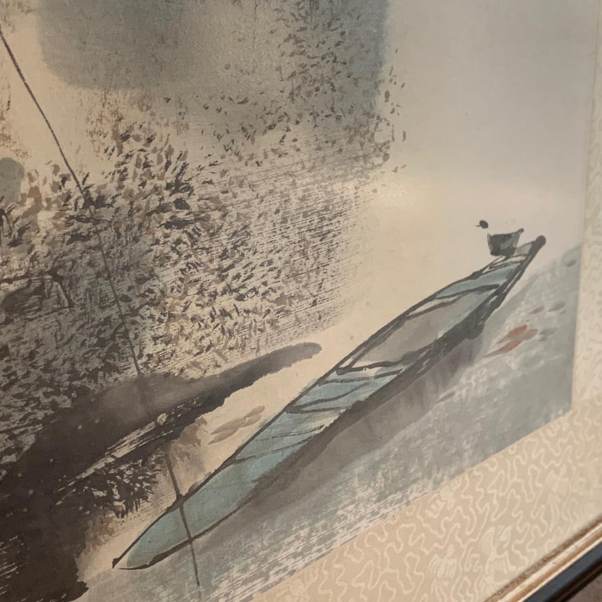 Two framed Asian paintings in black ink brush stroke style. They appear to be originals, and owner said they are but we can not verify. Both paintings have cream colored fabric matting and black colored wood frames. The frames measure 35” x 35”. The frames show some wear, and there appears to be moisture on the matting underneath the glass, see photos. Besides the blemishes on the frames and some dust on the glass, these both seem to be in good condition. They have glass fronts and wood backings and are quite heavy.