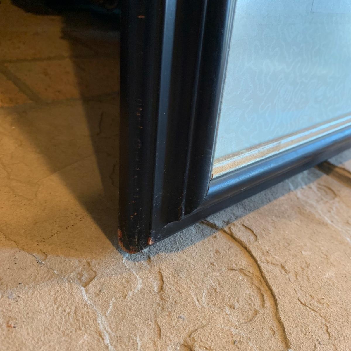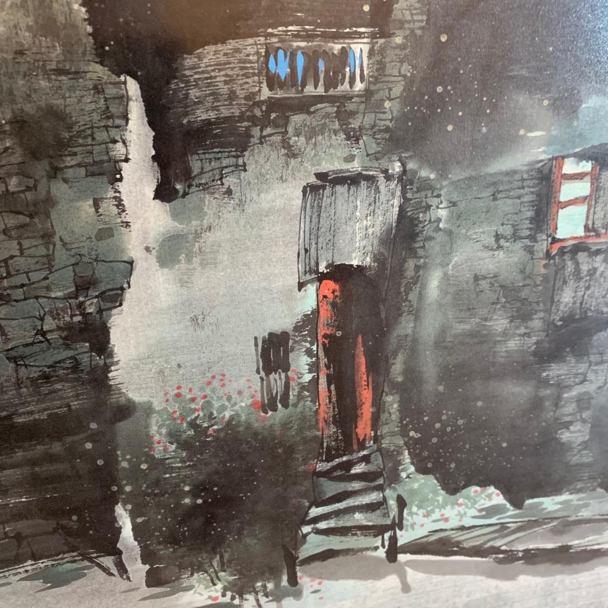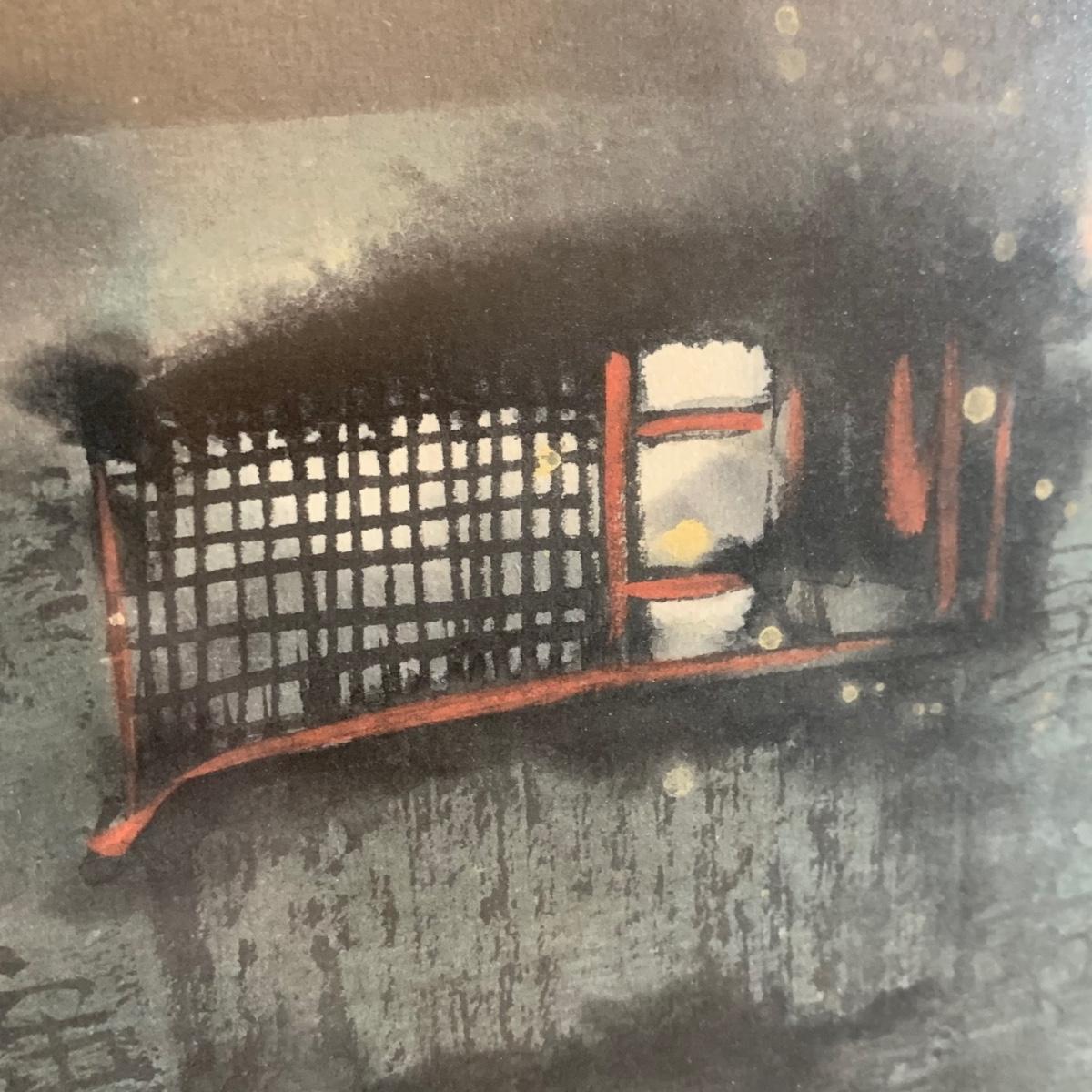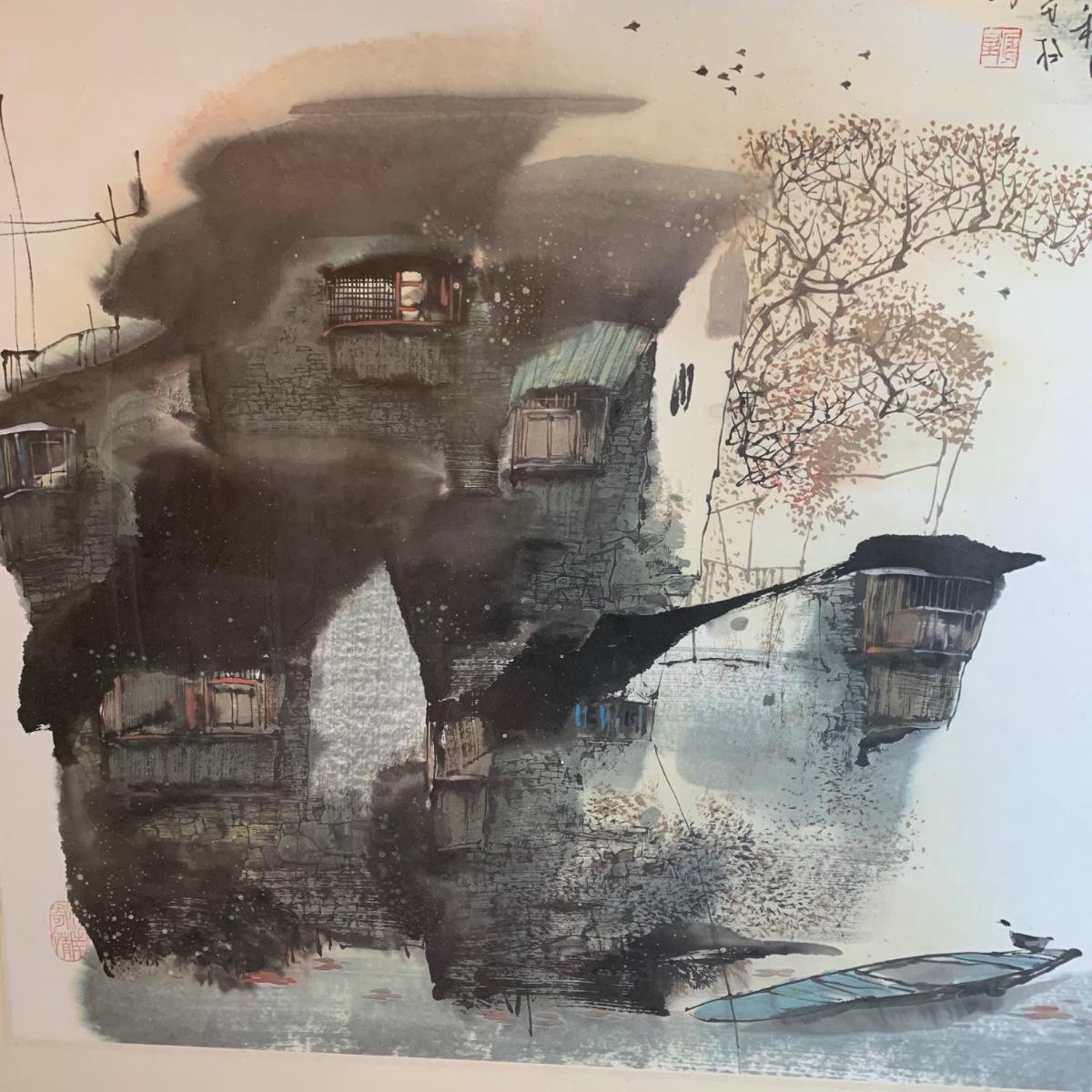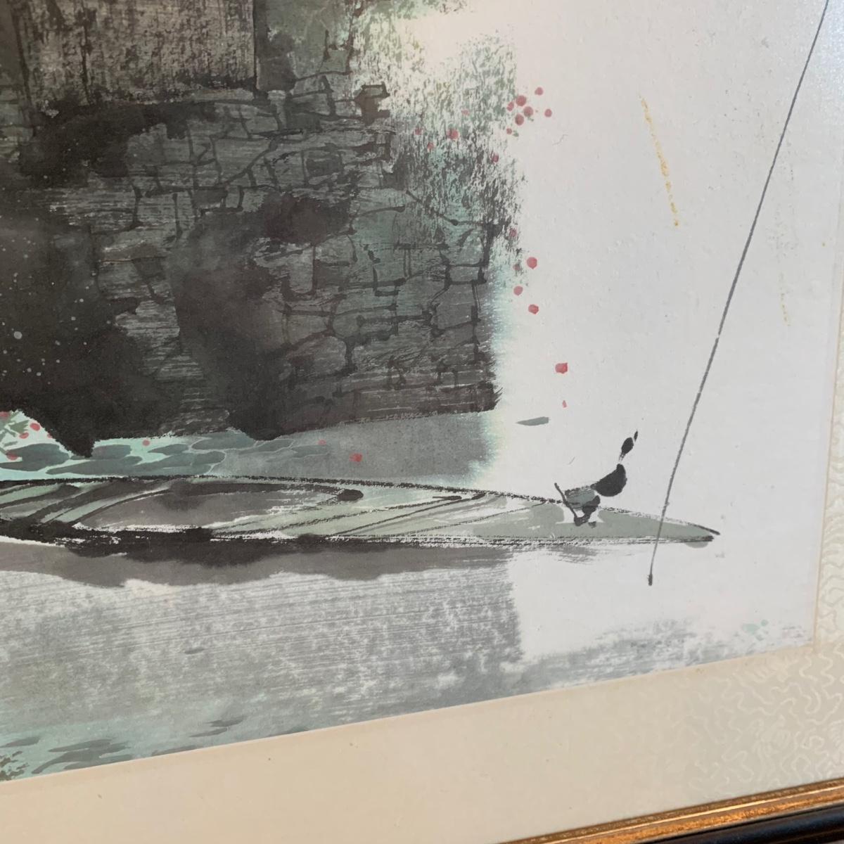 Two framed Asian paintings in black ink brush stroke style. They appear to be originals, and owner said they are but we can not verify. Both paintings have cream colored fabric matting and black colored wood frames. The frames measure 35” x 35”. The frames show some wear, and there appears to be moisture on the matting underneath the glass, see photos. Besides the blemishes on the frames and some dust on the glass, these both seem to be in good condition. They have glass fronts and wood backings and are quite heavy.