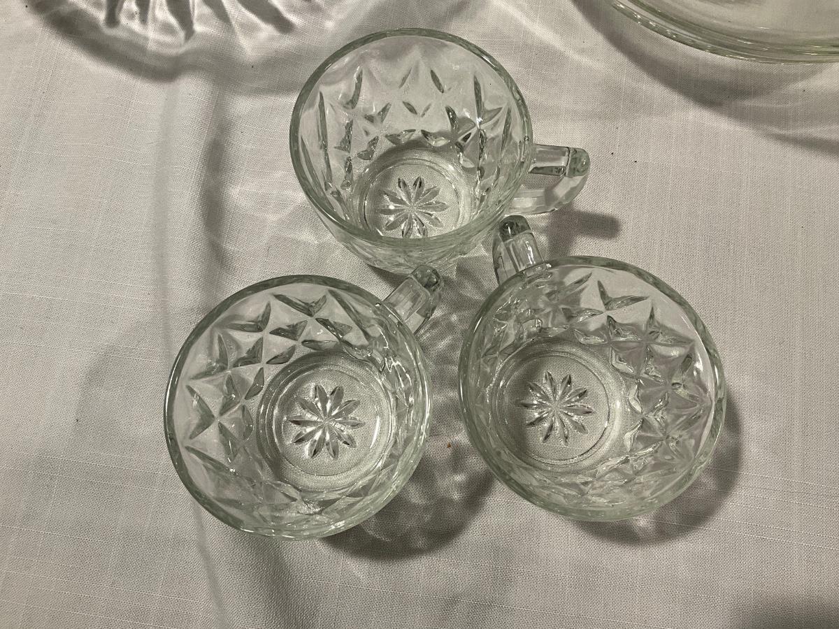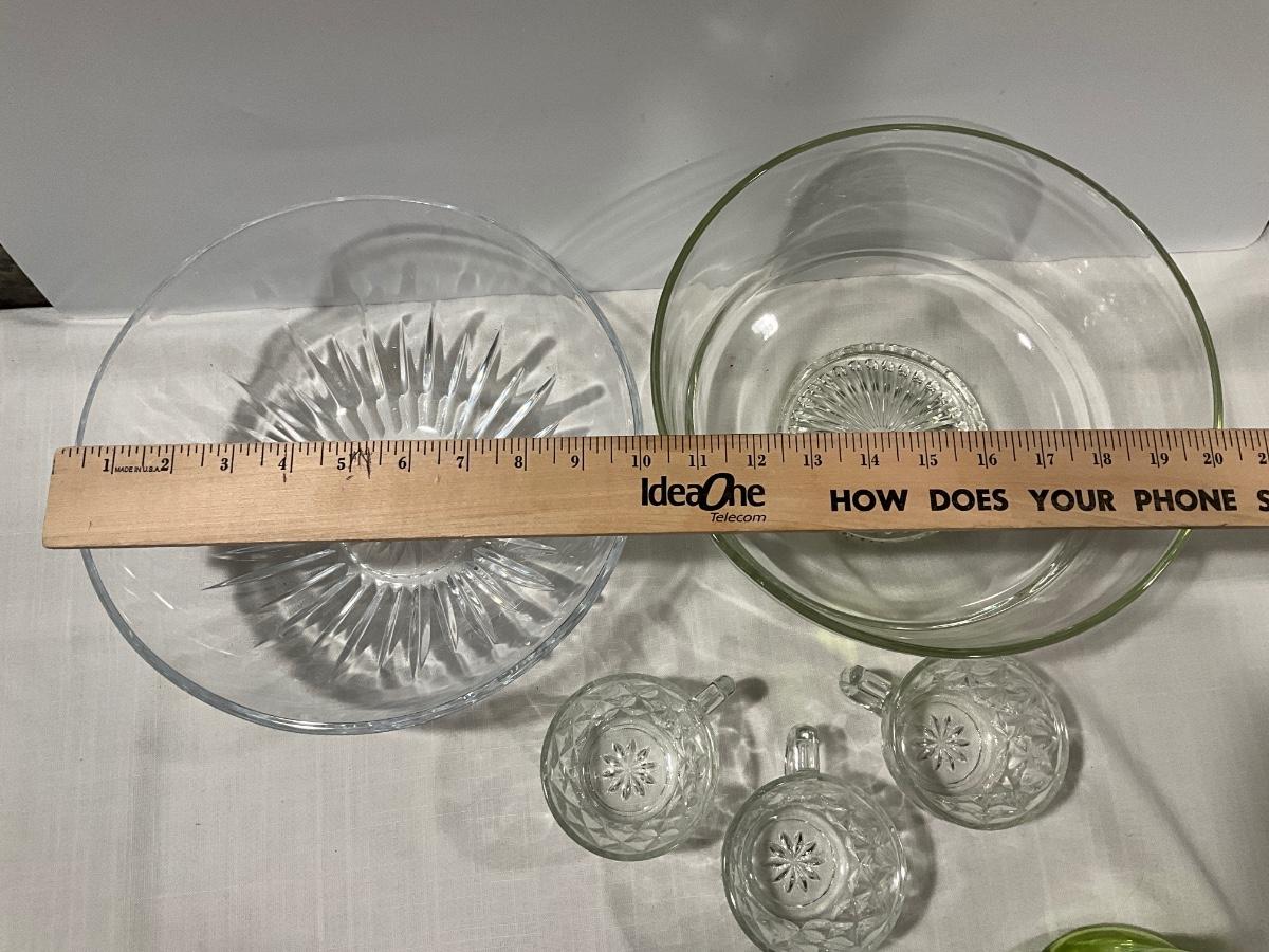 Pair of Large Glass Bowls, Green Vase, 3 glass cups