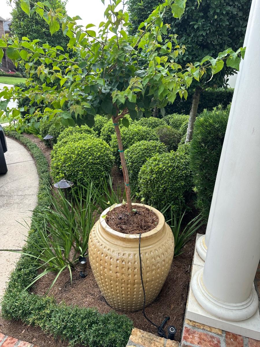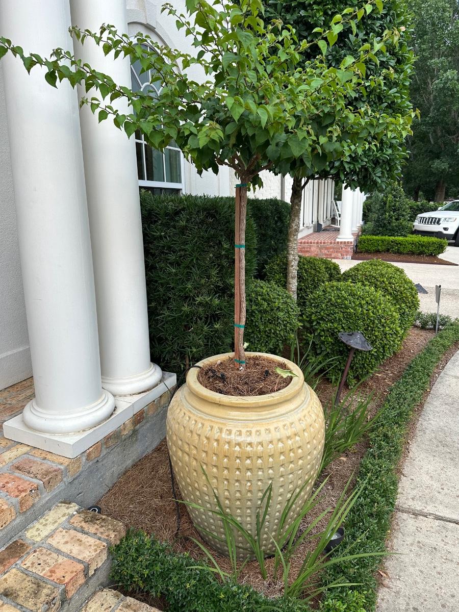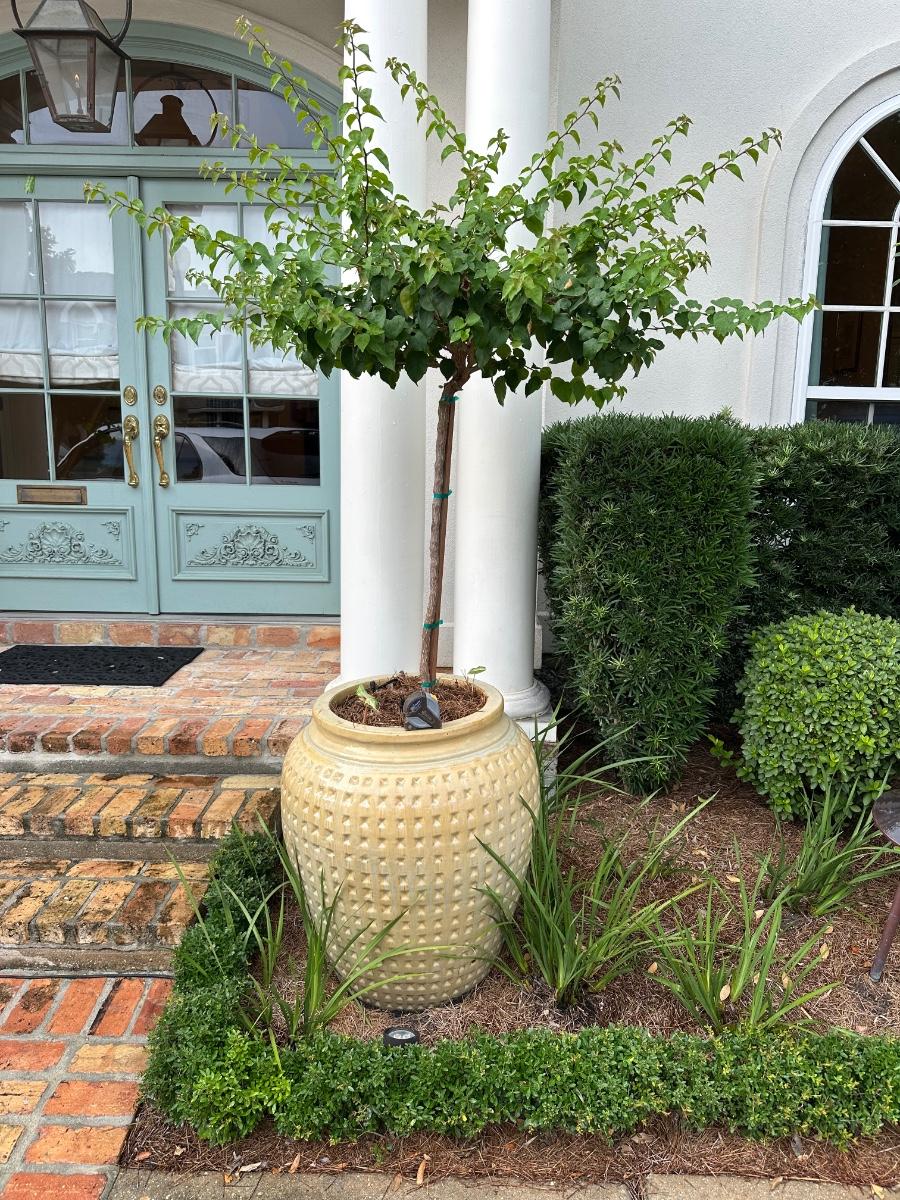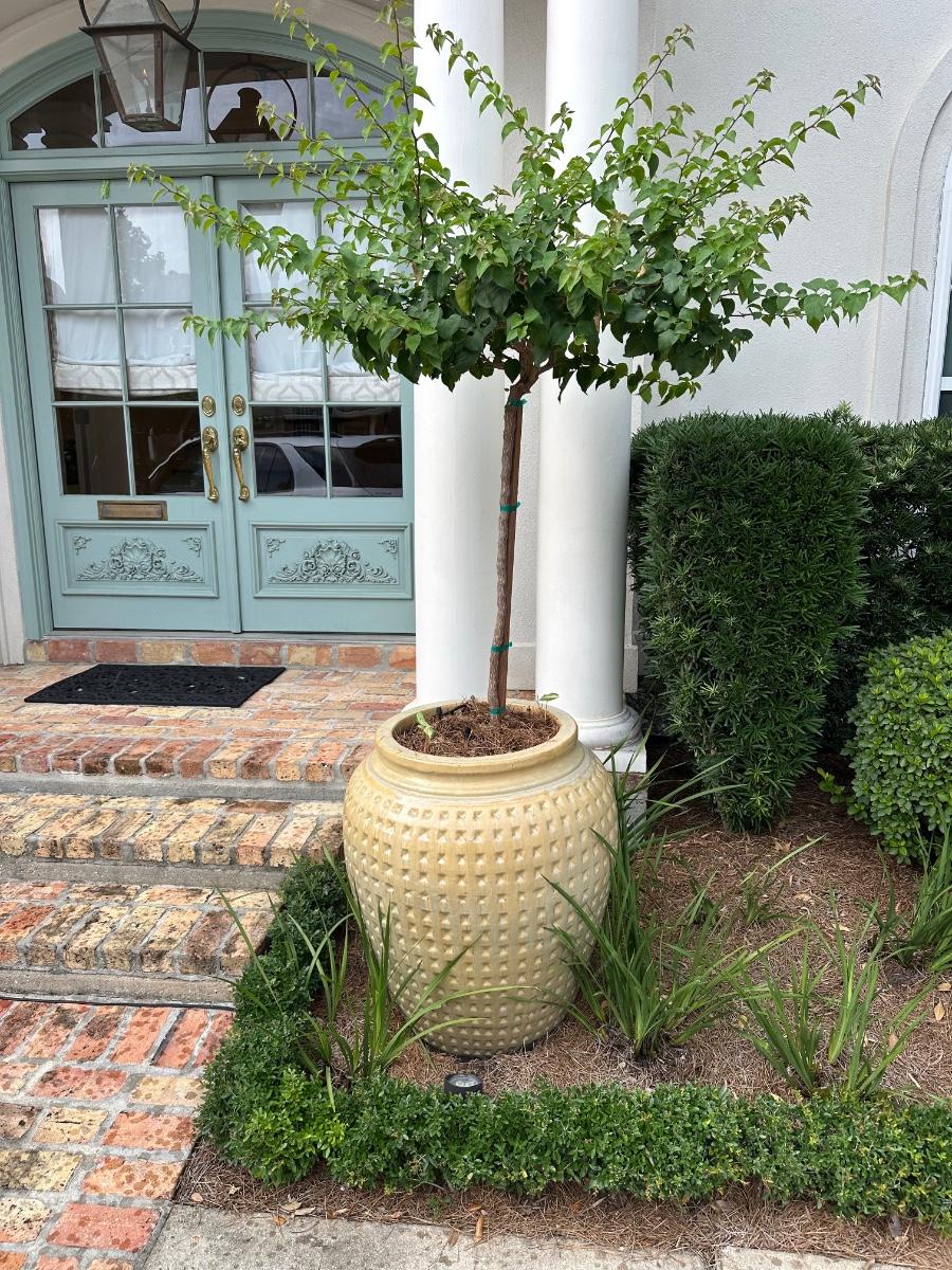 Pair of Large Glazed Ceramic Planters with Live Ornamental Trees – 30” Tall Pots