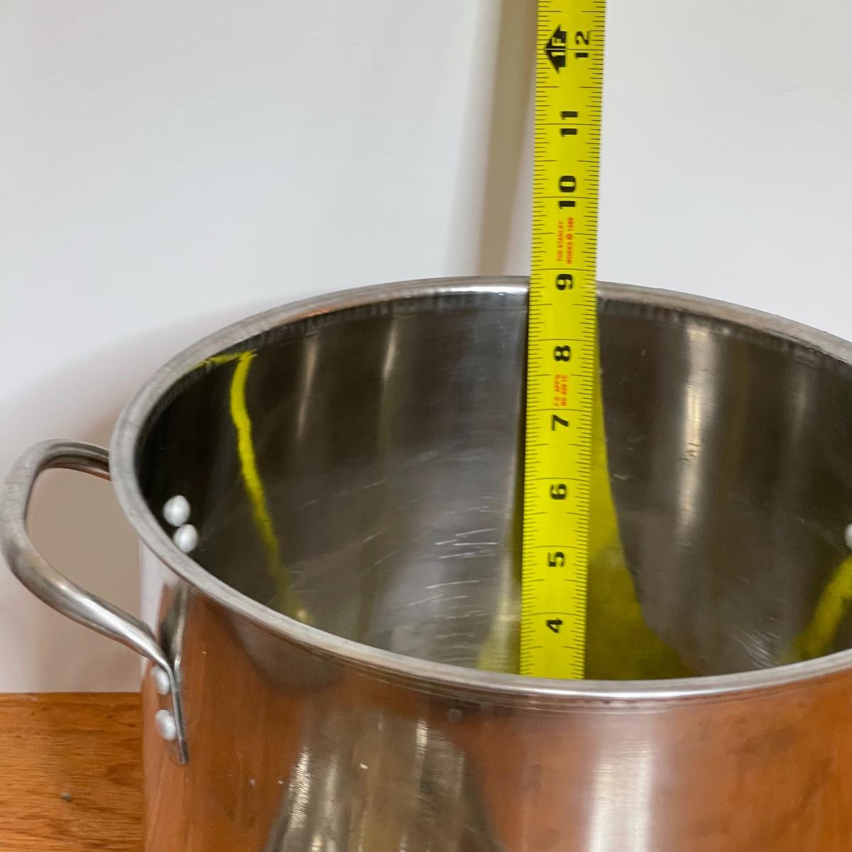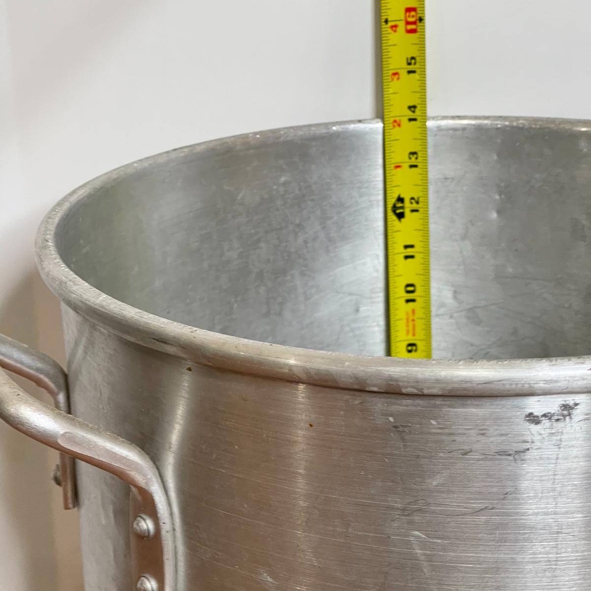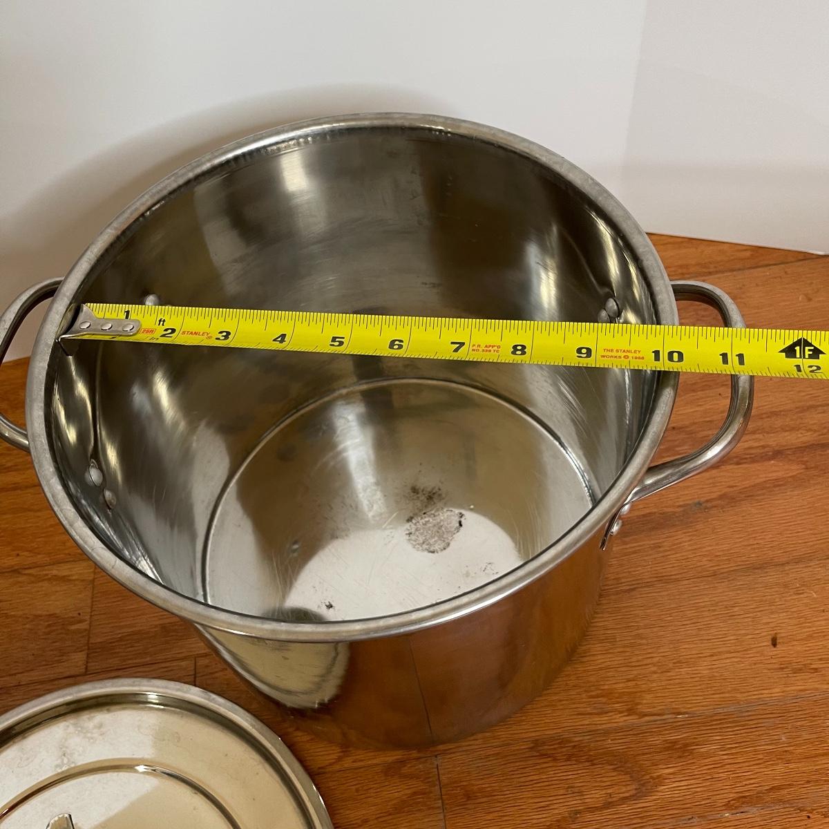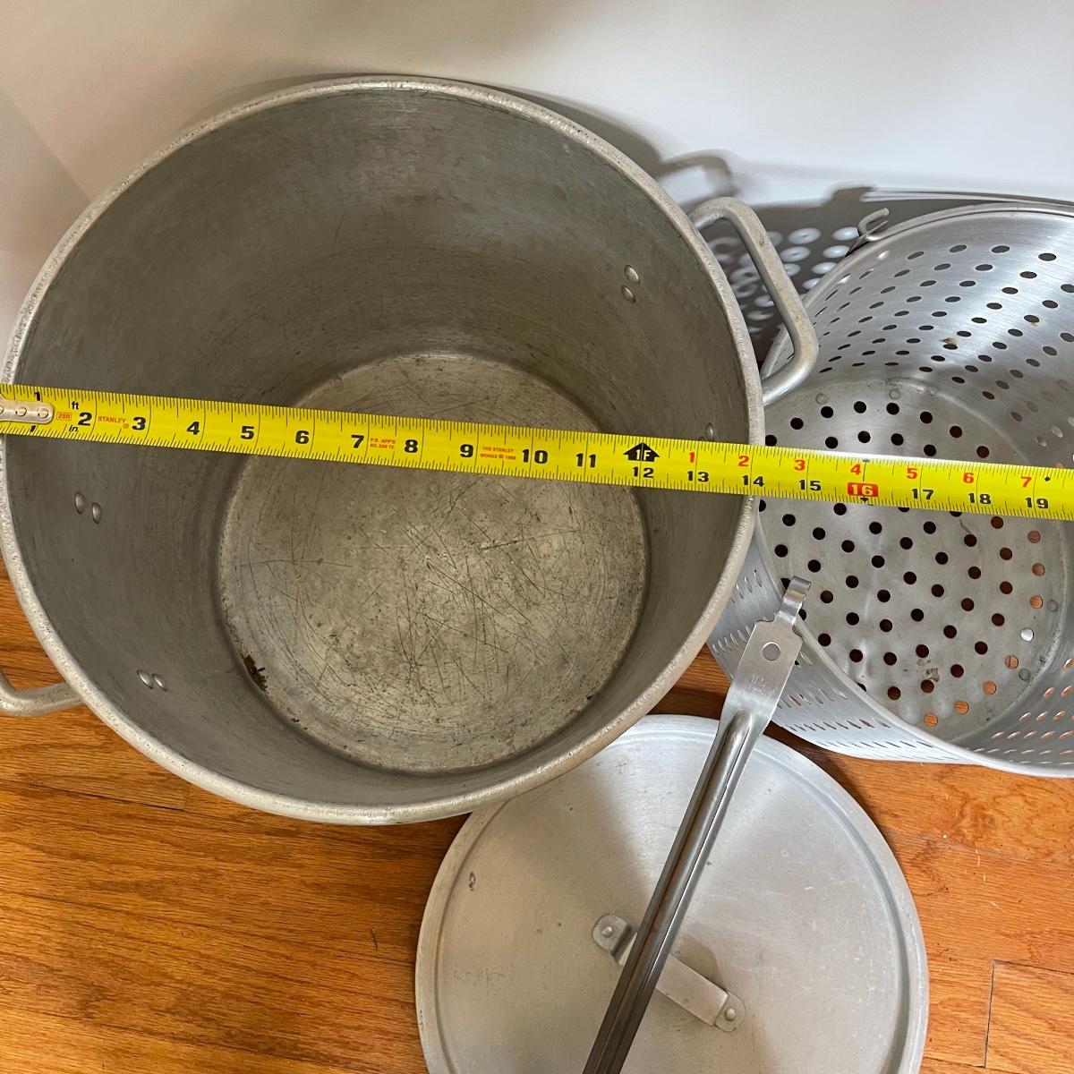 See photos for approx measurements. Smaller pot and ladle are stainless steel.