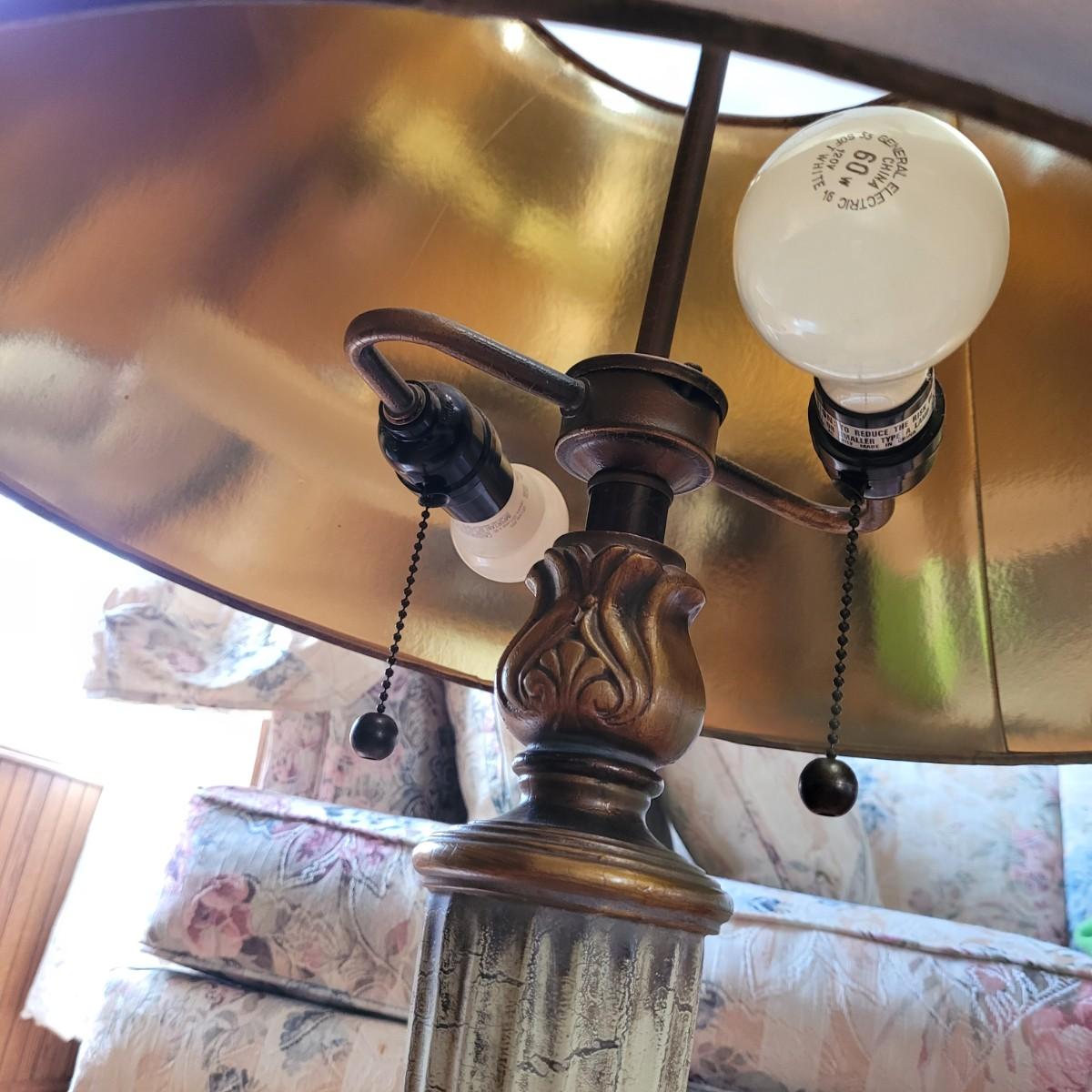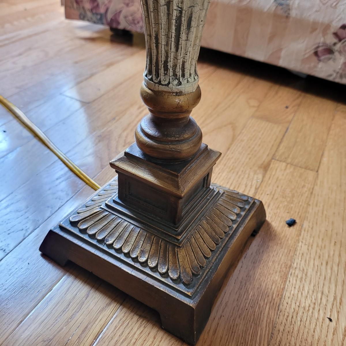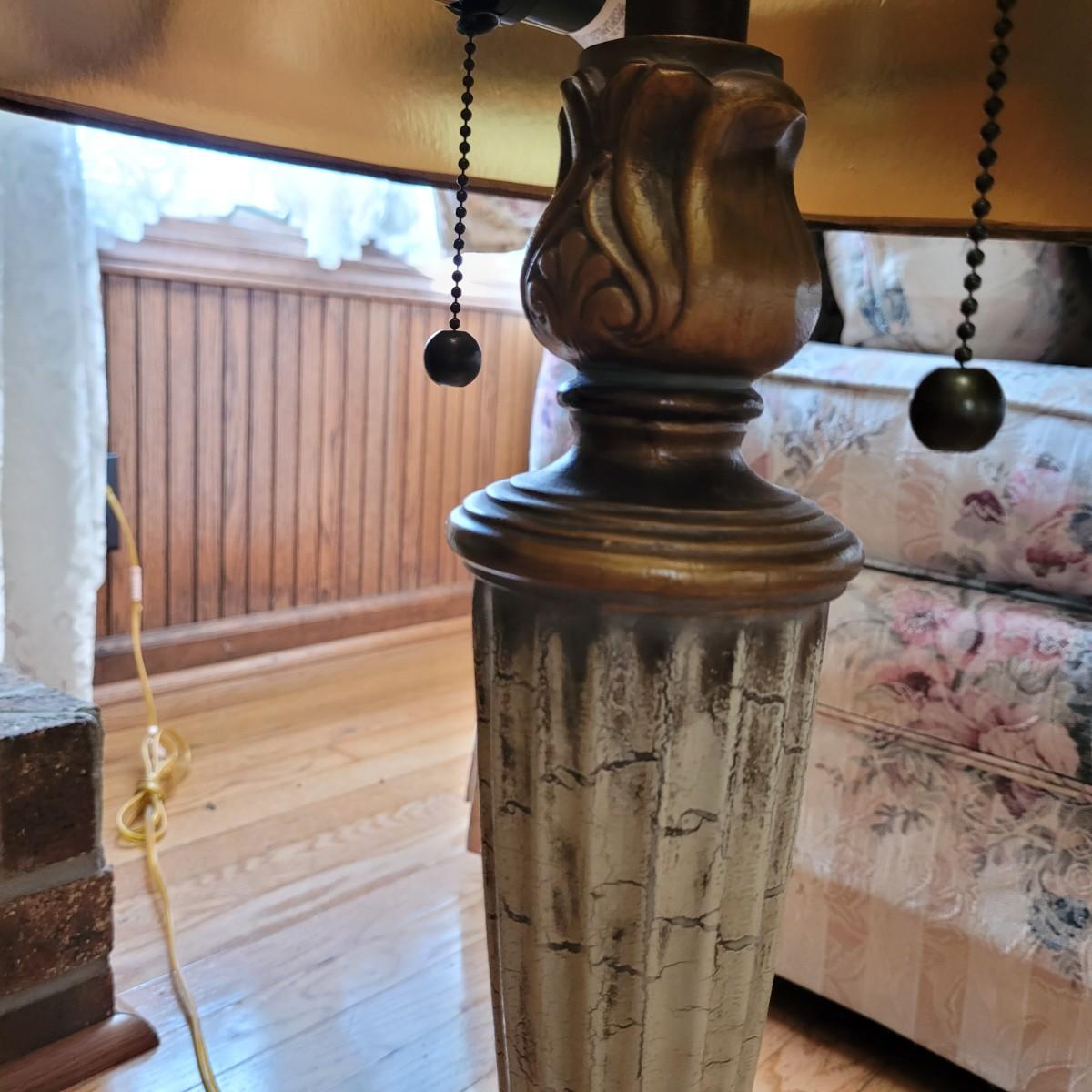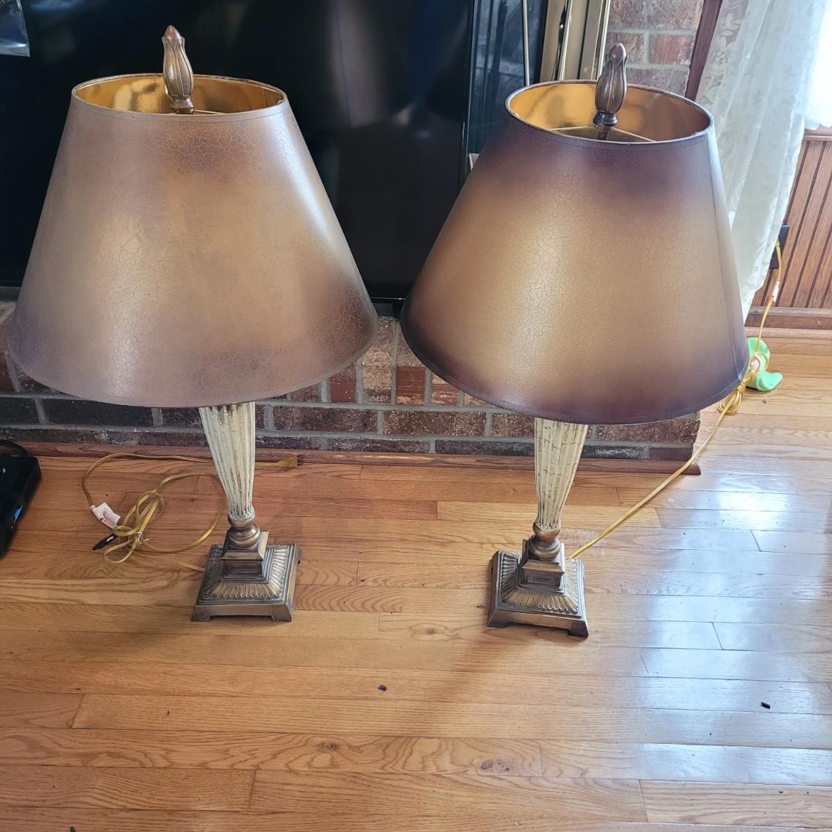 These large table lamps boast an antique Greek style with a bronze and cream color scheme. Lamps powered on when plugged in. Measure approximately 6.5" wide at base x 34"H. Local pickup only.