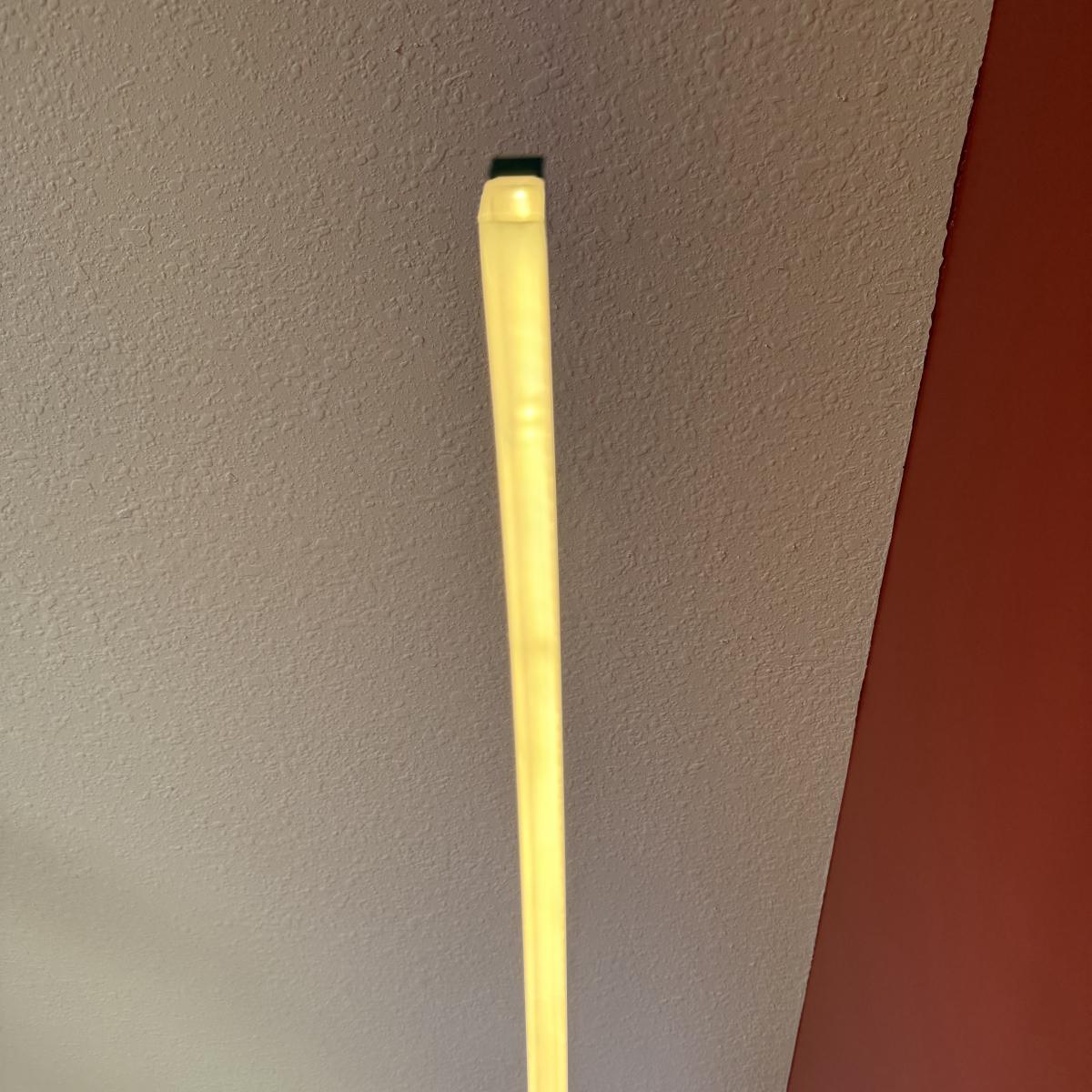 Two arc floor lamps. They have black metal bases and LED lights with three brightness settings. They have touch button controls. The bases are 14”D. The tallest point is approximately 80”H, but note that one drops a little lower than the other. Width is approximately 45”.