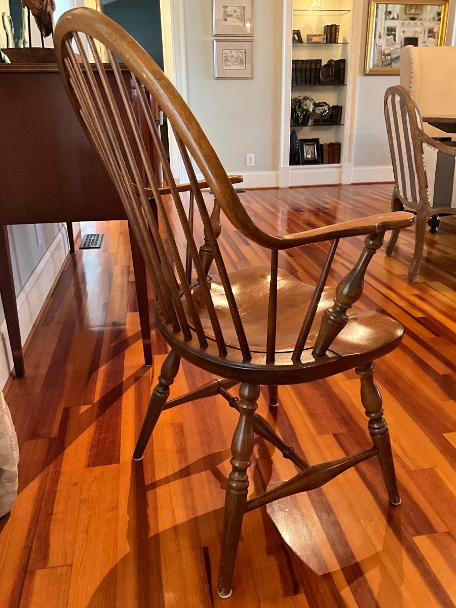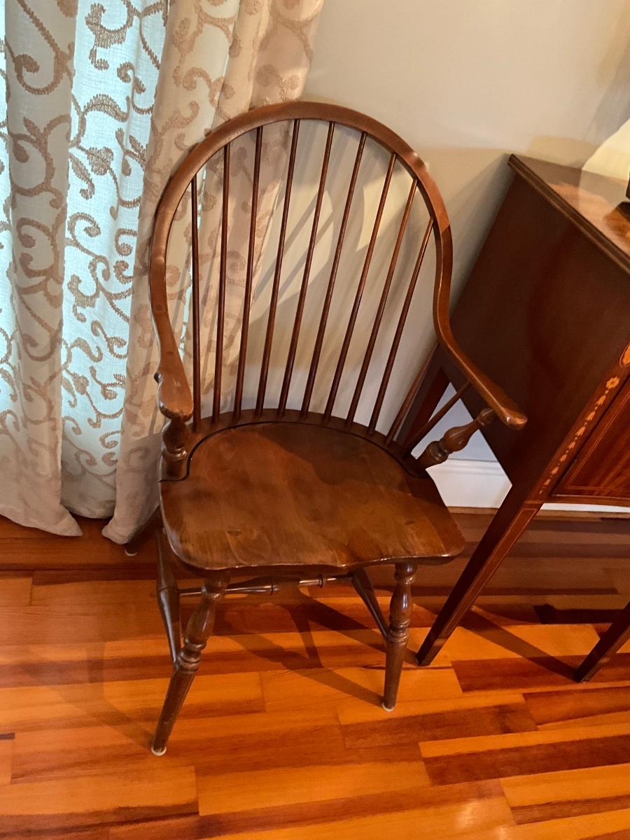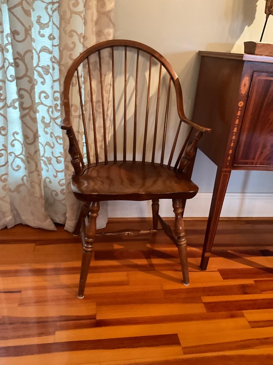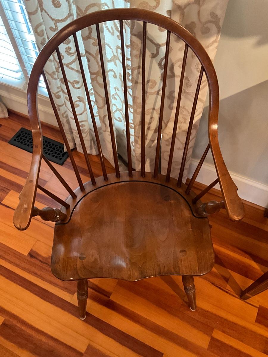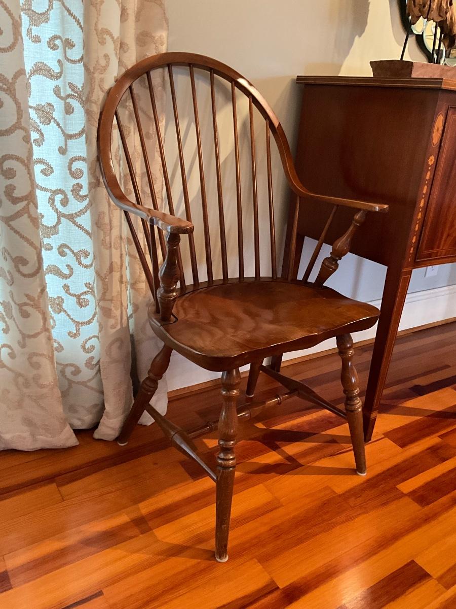 Wood saddle sides chair, 24 inches wide, 39.5 inches tall, 18 inches deep. Seat depth is 15.5 inches, seat width is 18 inches inches and it’s 18 inches from the floor to the seat